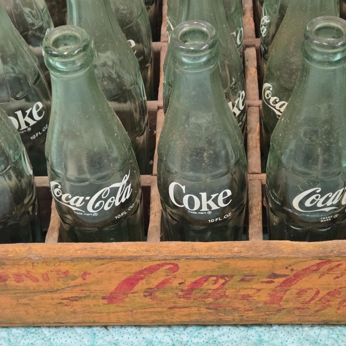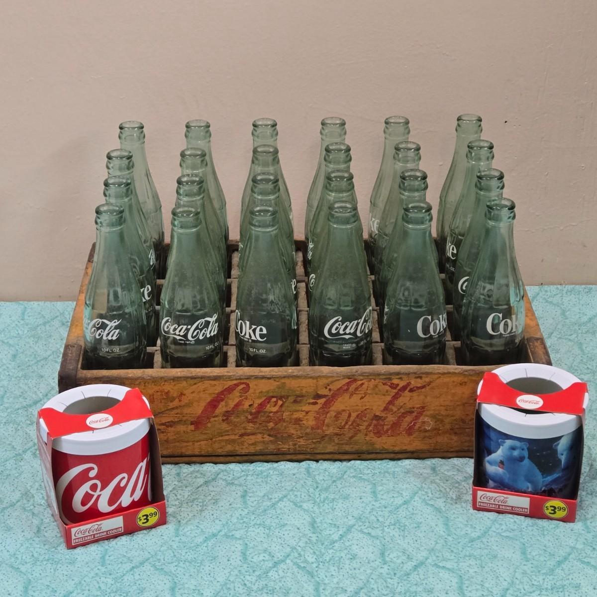 LOT 44A: Coca-Cola Wooden Crate Filled With Vintage Bottles From Various Areas, and Two Freezable Drink Coolers