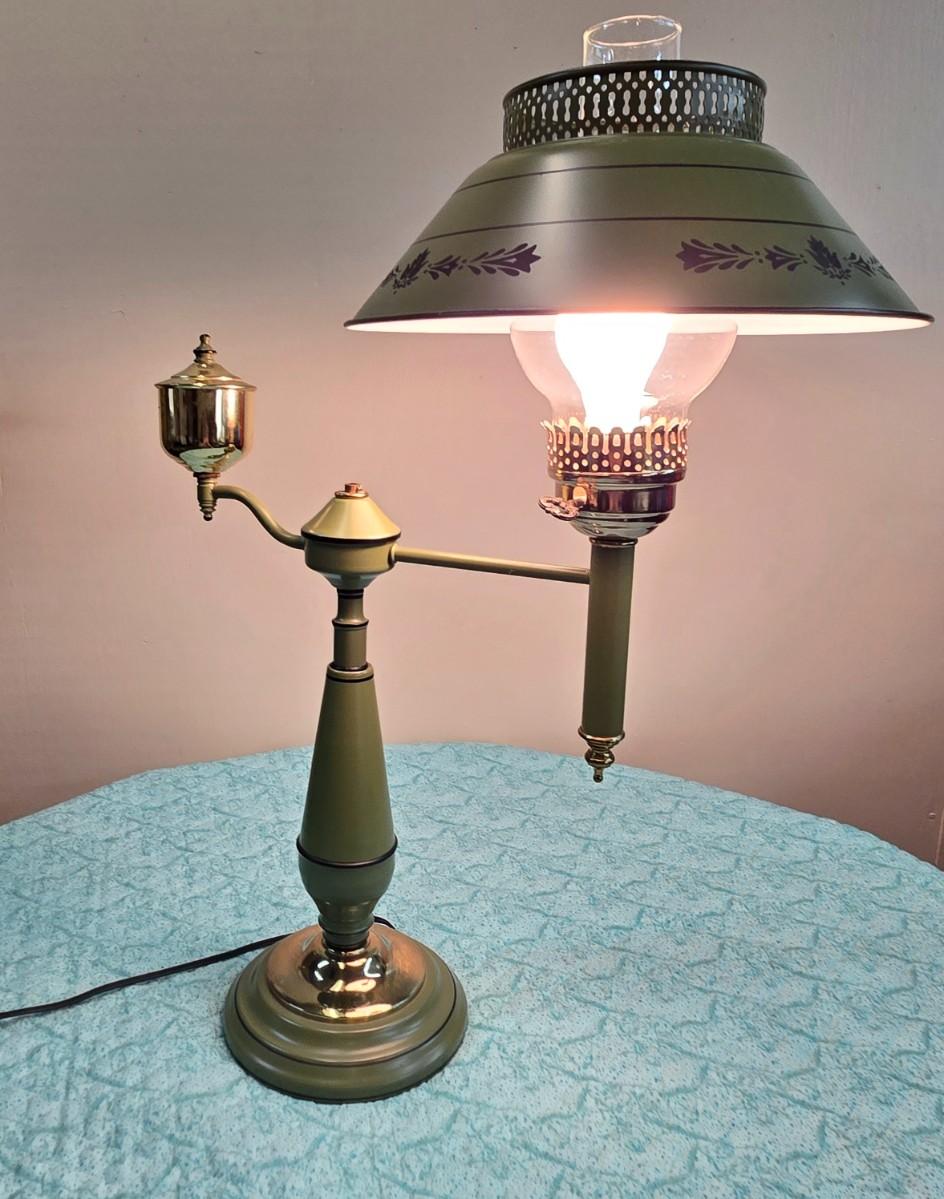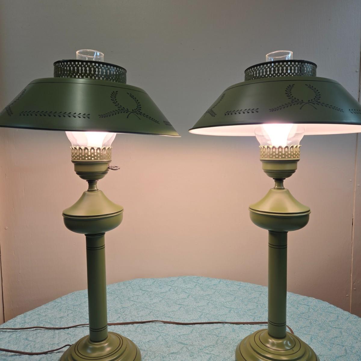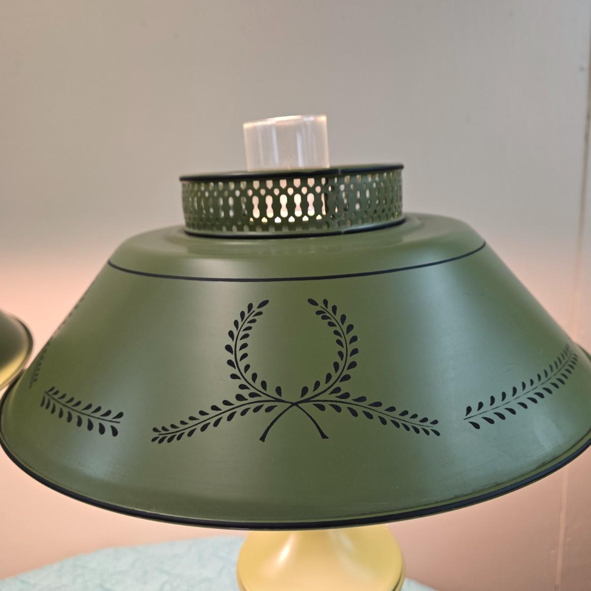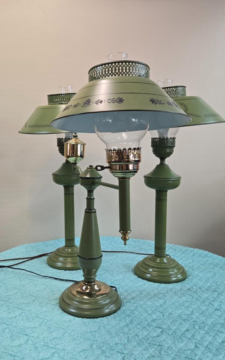LOT 48A: Two Matching Green Metal Toleware Table Lamps and Toleware Student Lamp