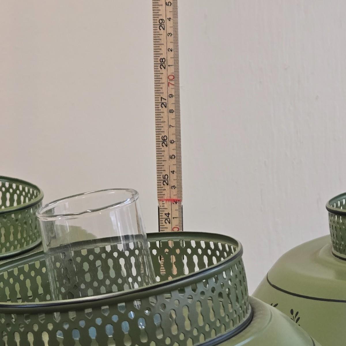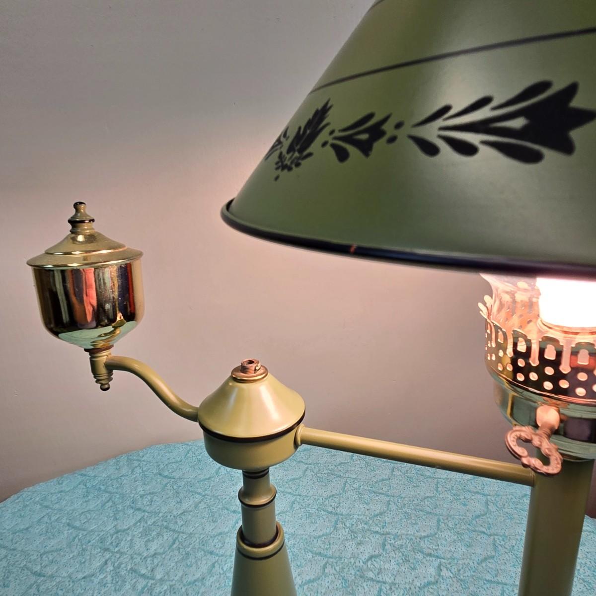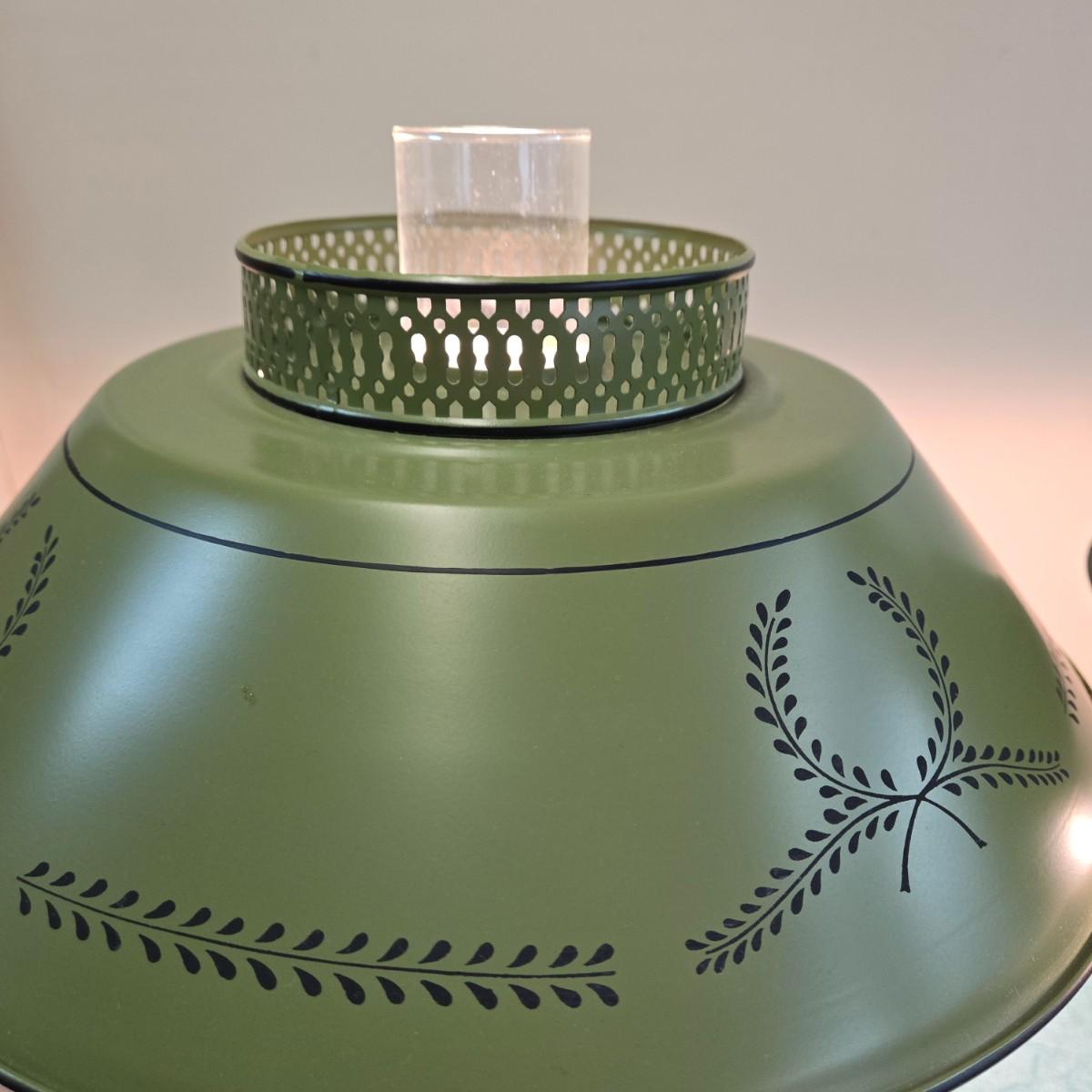 LOT 48A: Two Matching Green Metal Toleware Table Lamps and Toleware Student Lamp