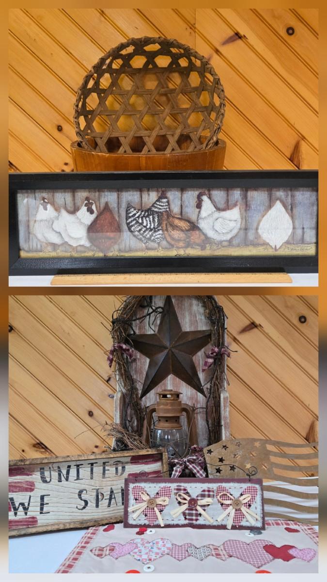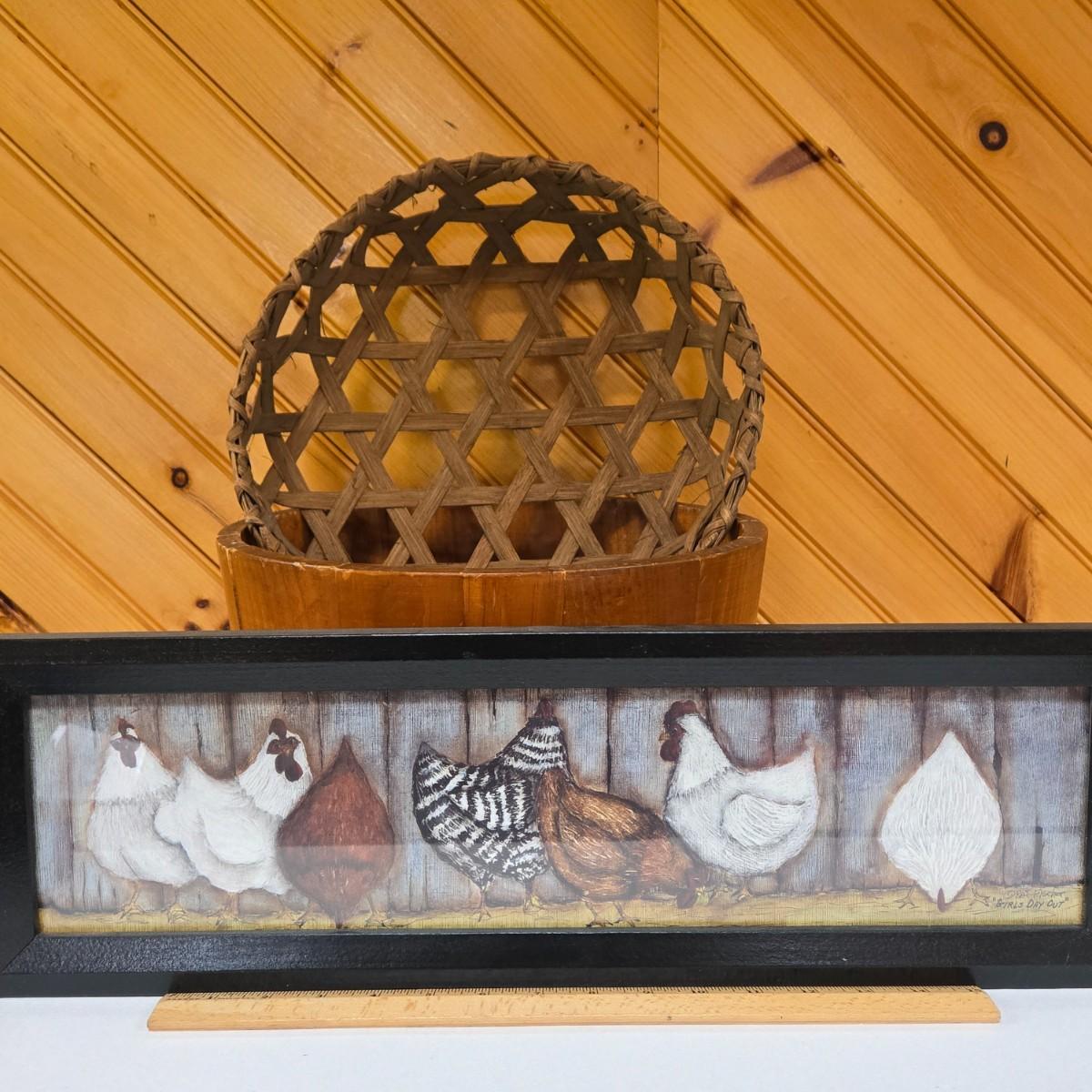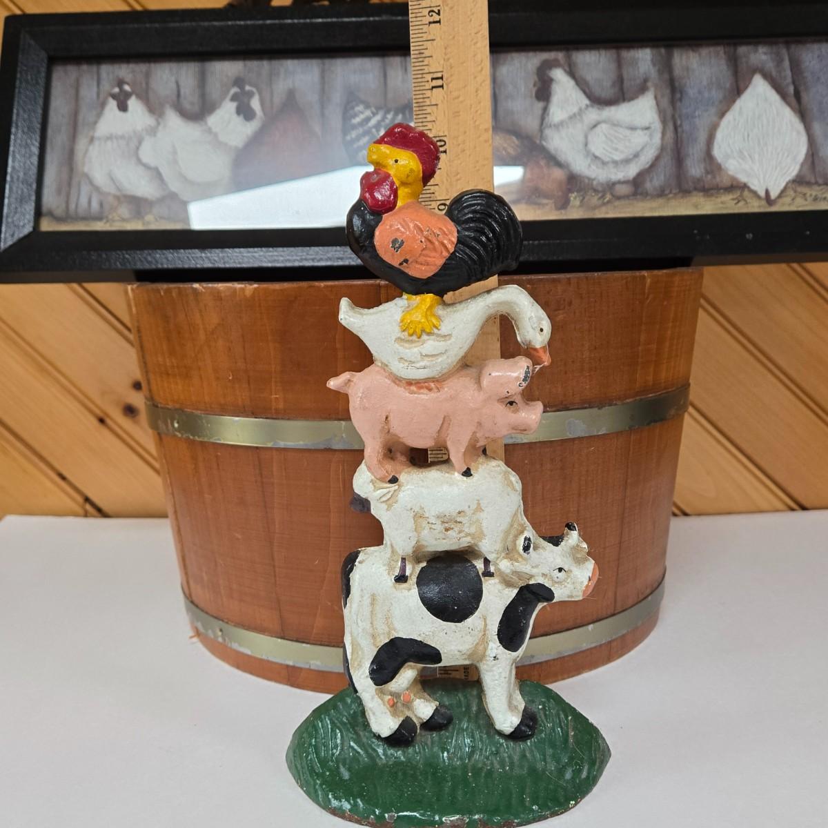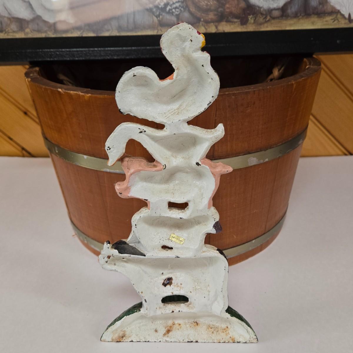 LOT 64P: Country Kitchen Decor Including Lighted Wall Hanging, Patriotic Wall Hangings, Cast Iron Farm Animal Doorstop, Chicken Print, Brass Farm Animal Hook, Wooden Barrel, and More
