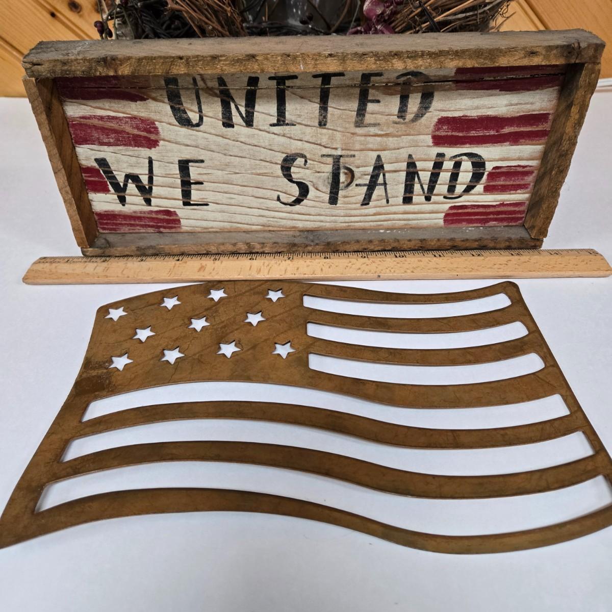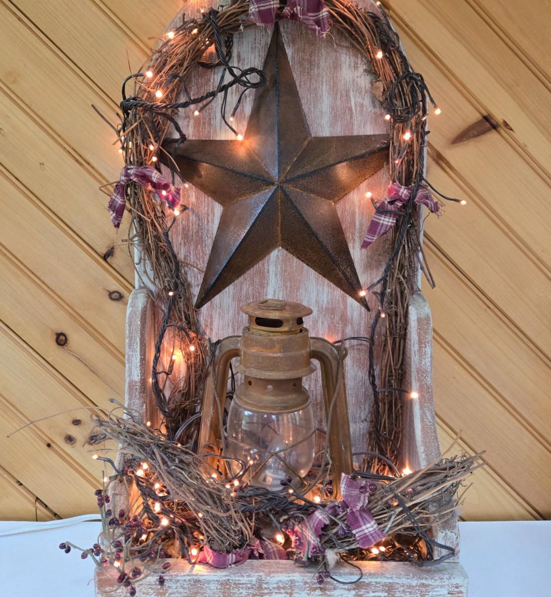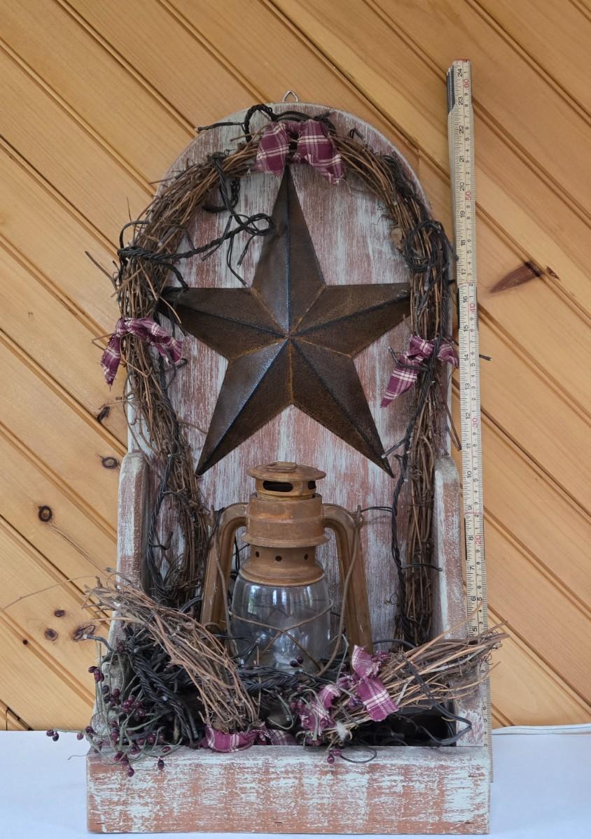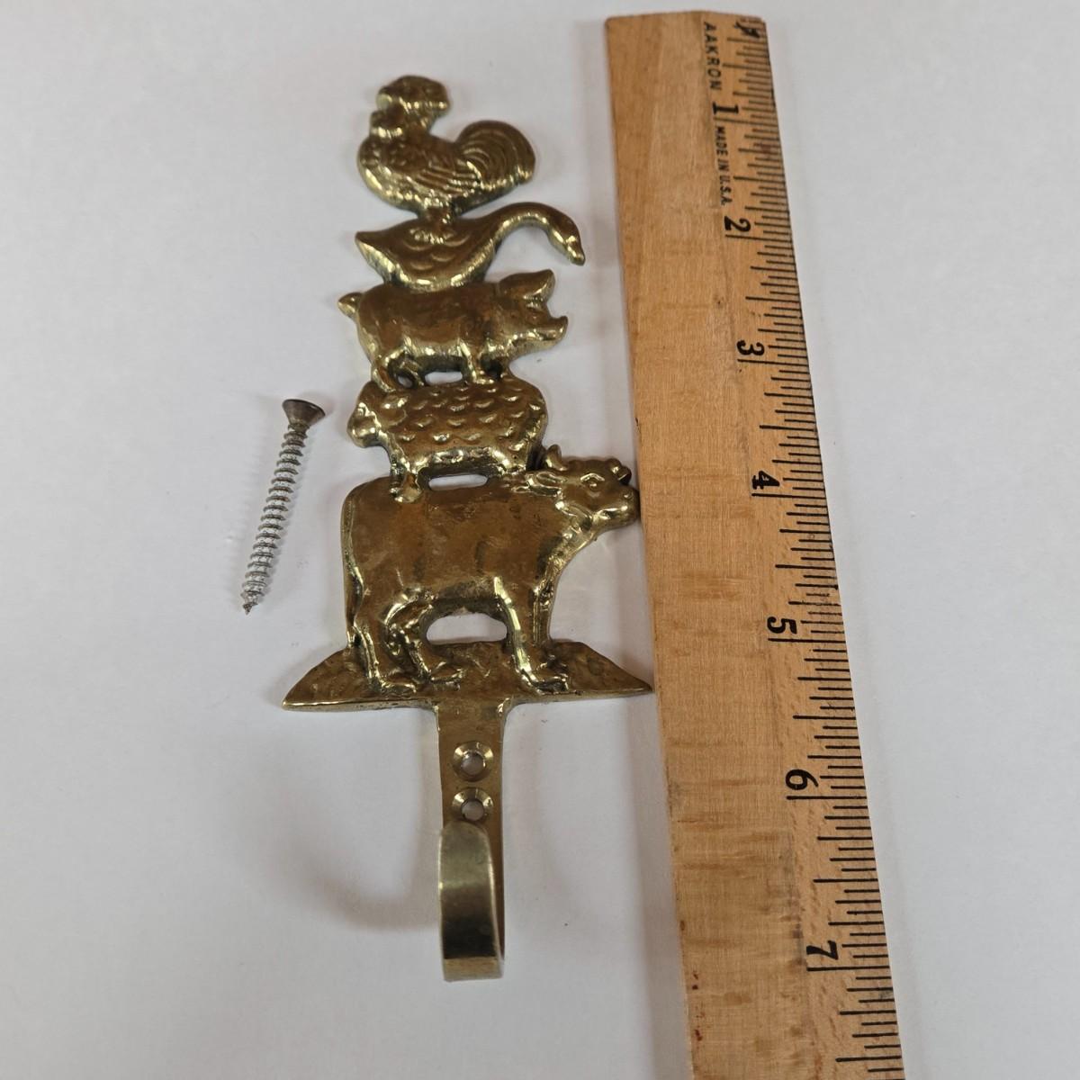 LOT 64P: Country Kitchen Decor Including Lighted Wall Hanging, Patriotic Wall Hangings, Cast Iron Farm Animal Doorstop, Chicken Print, Brass Farm Animal Hook, Wooden Barrel, and More