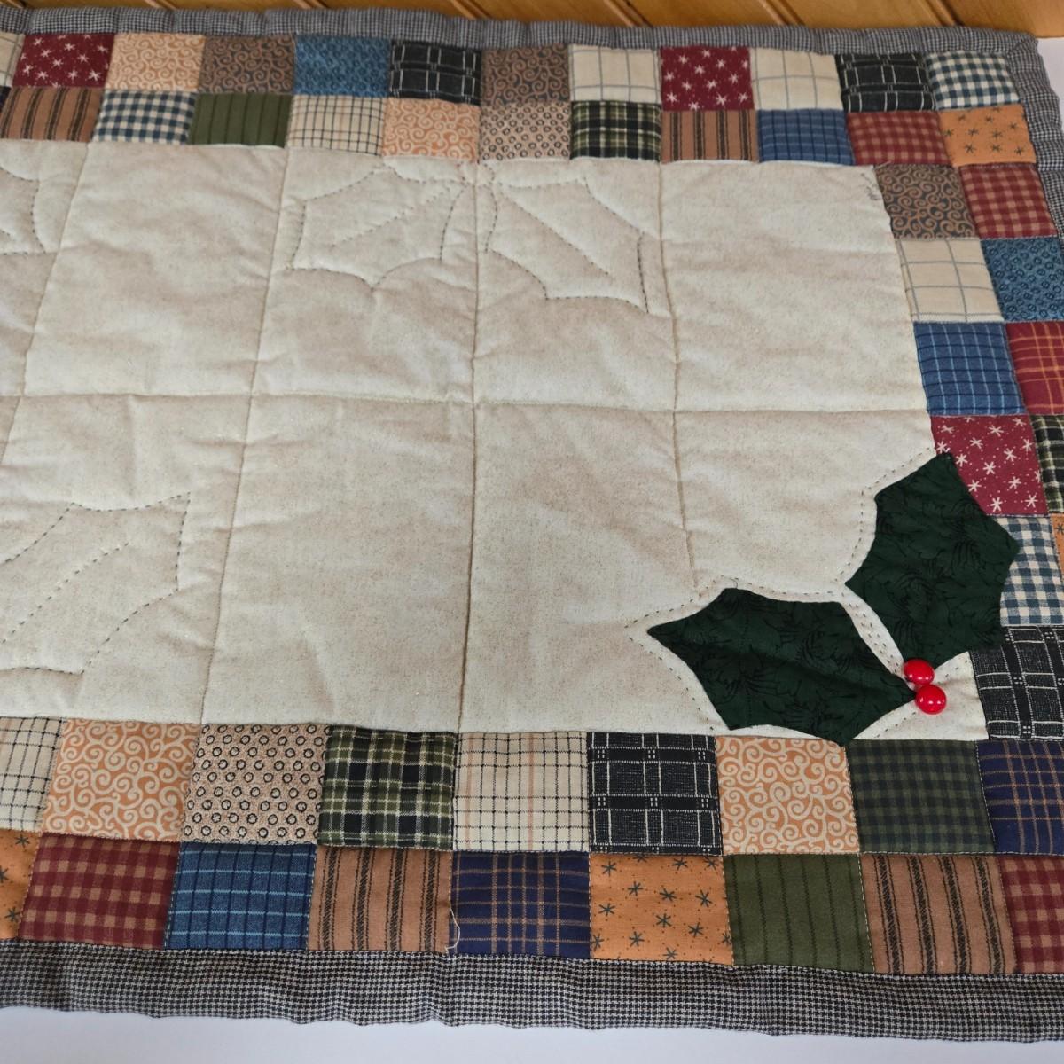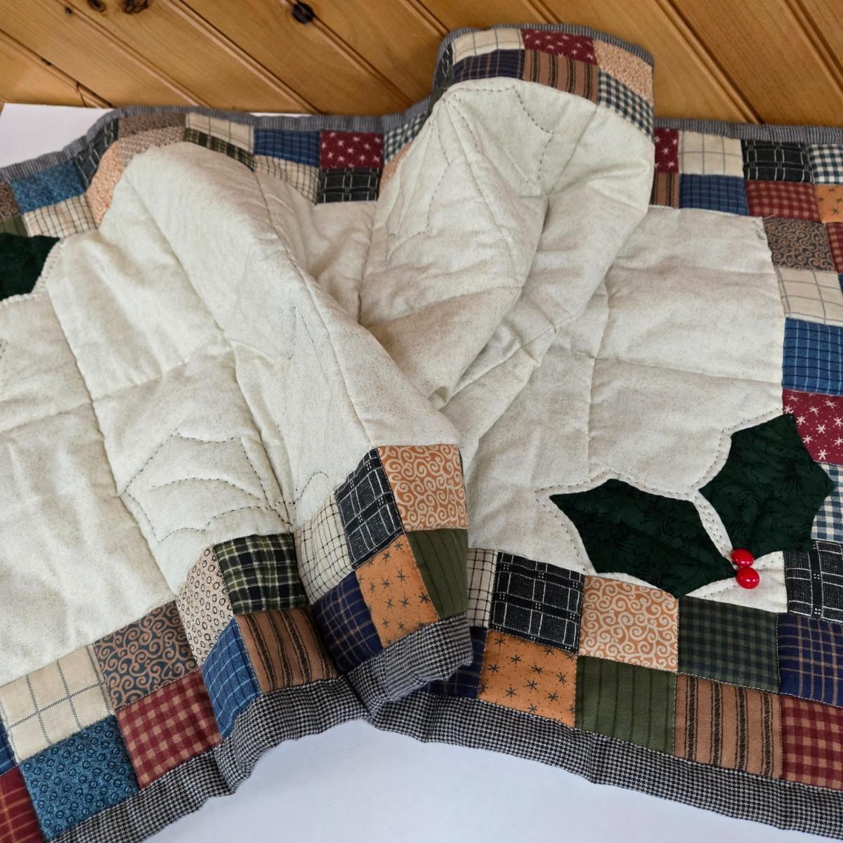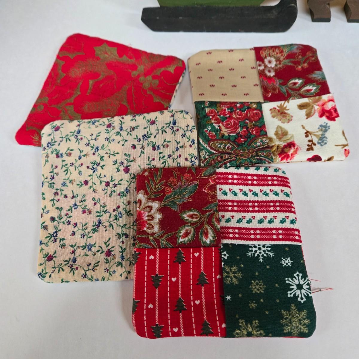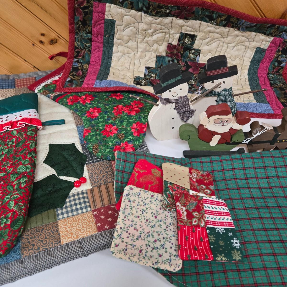 LOT 68P: Hand-Made Christmas Decor Including Two Stockings, Table Runners, Coasters, and More