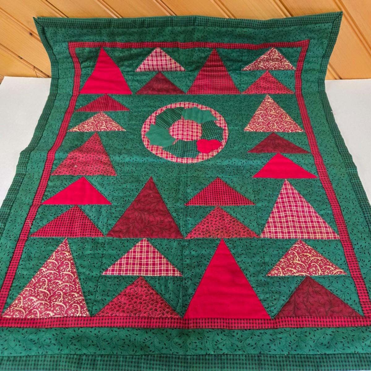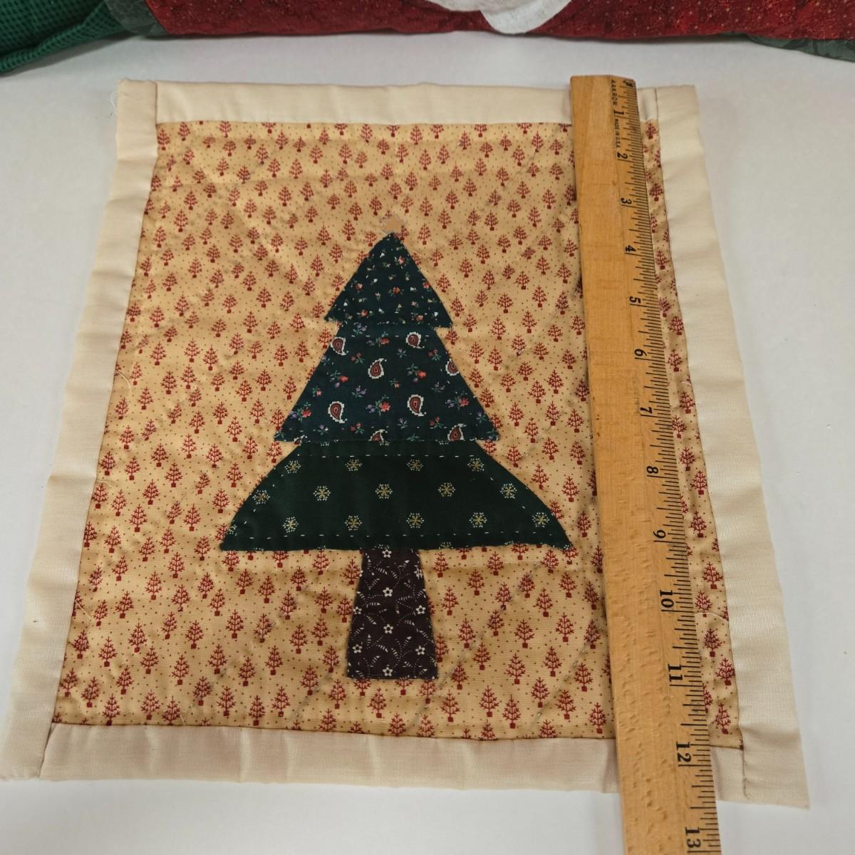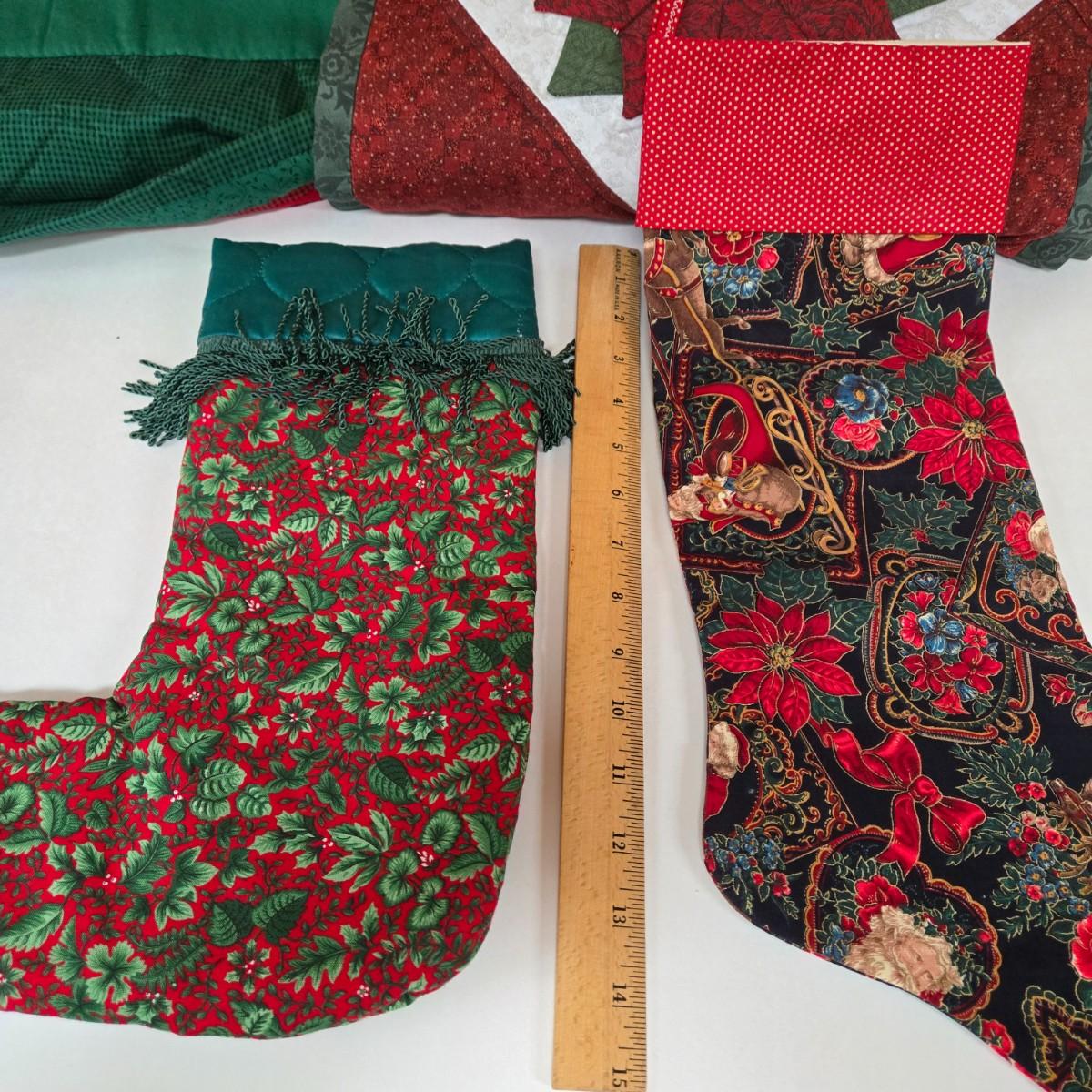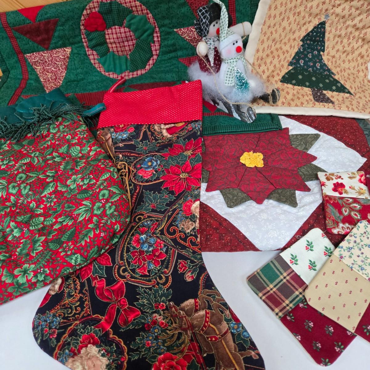 LOT 69P: Beautiful Hand-Made Christmas Decor Including Table Runners, Coasters, Two Stockings, and More