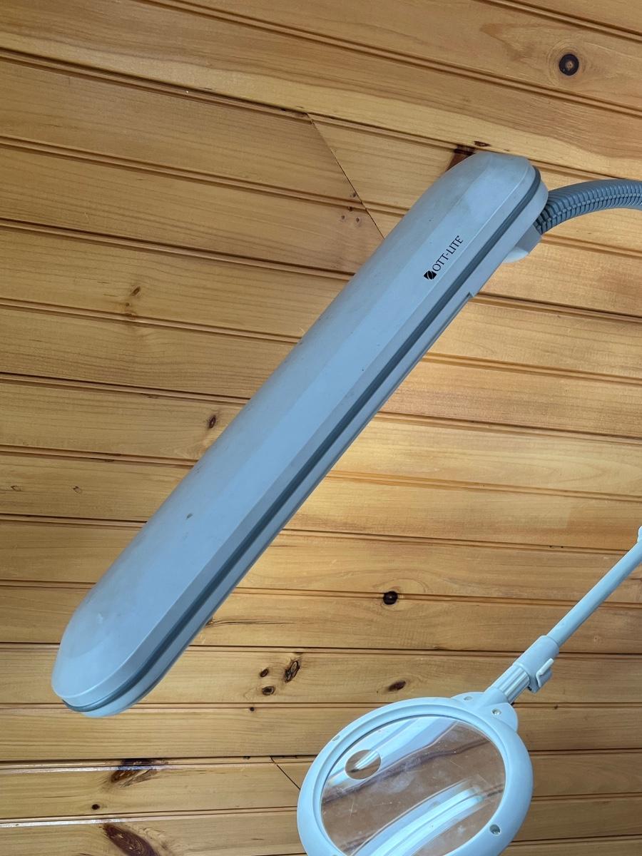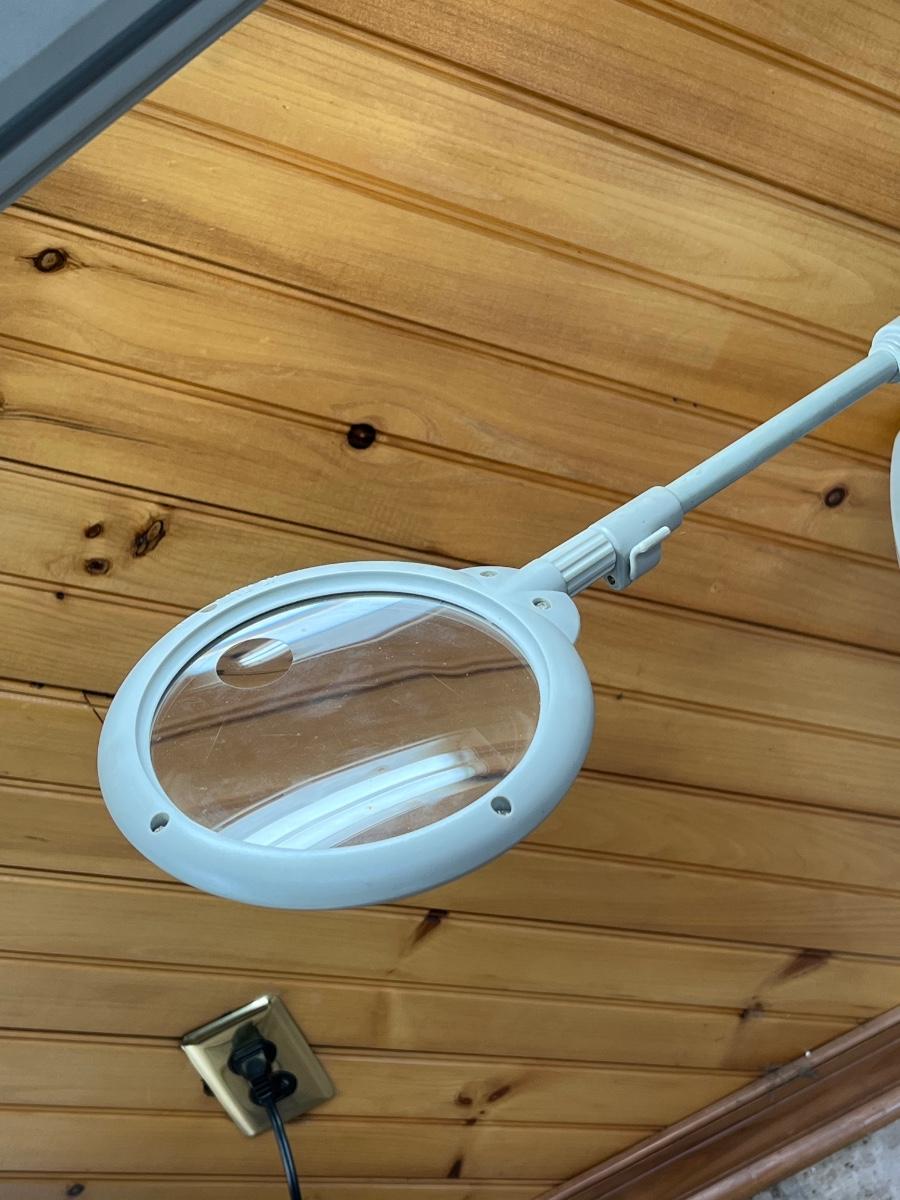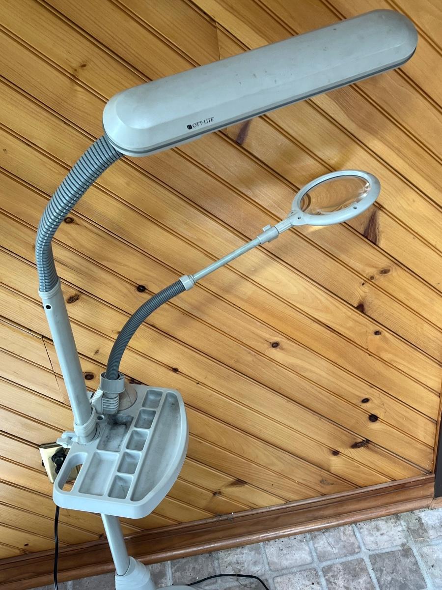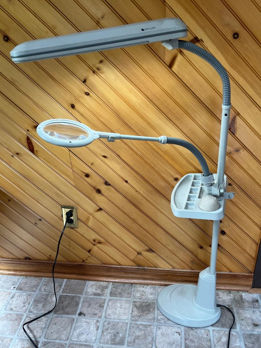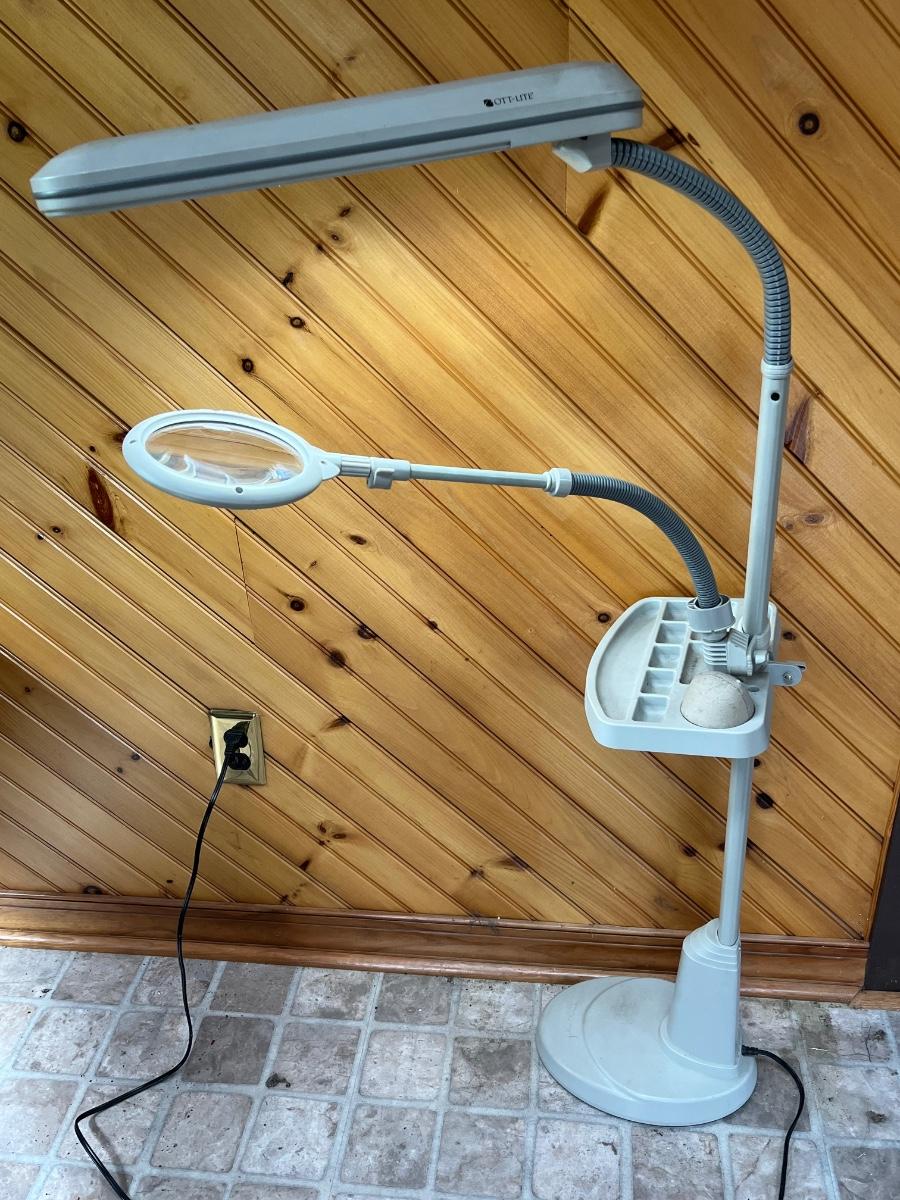 LOT 85P: Ott-Lite Floor Lamp Crafting Light w Magnifying Glass and Craft Tray / Pin Cushion