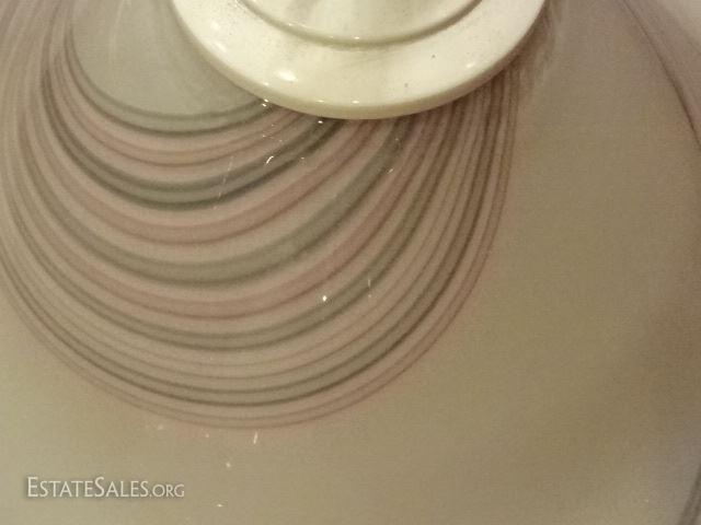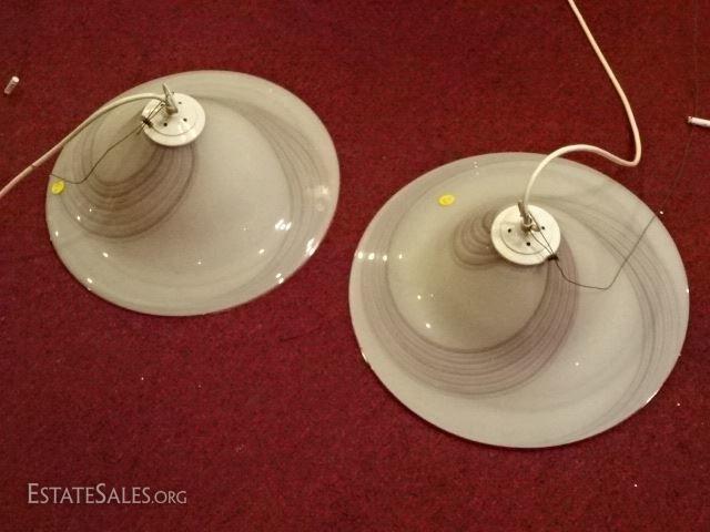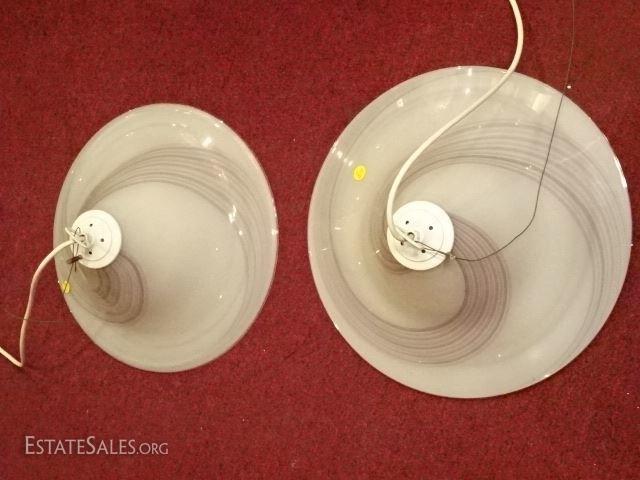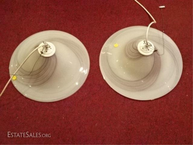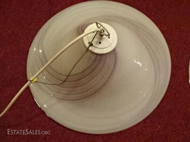 LOT 115A: PAIR ART GLASS PENDANT LIGHTS, WHITE, GRAY, AND BLUSH SWIRLED GLASS, VERY GOOD CONDITION, EACH APPROX 8"H X 15.5"W, SKU292.12