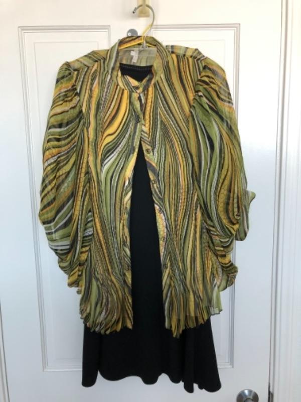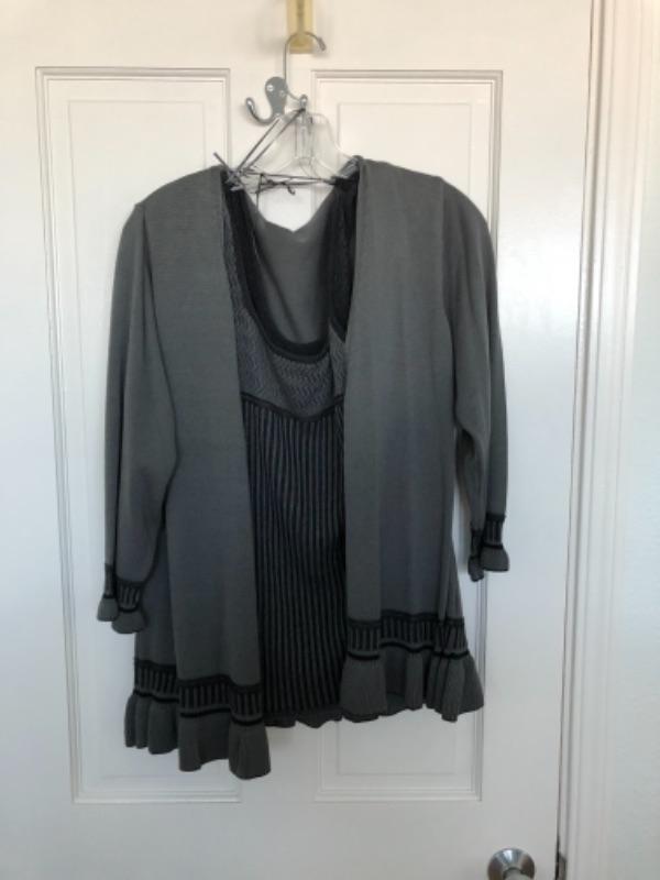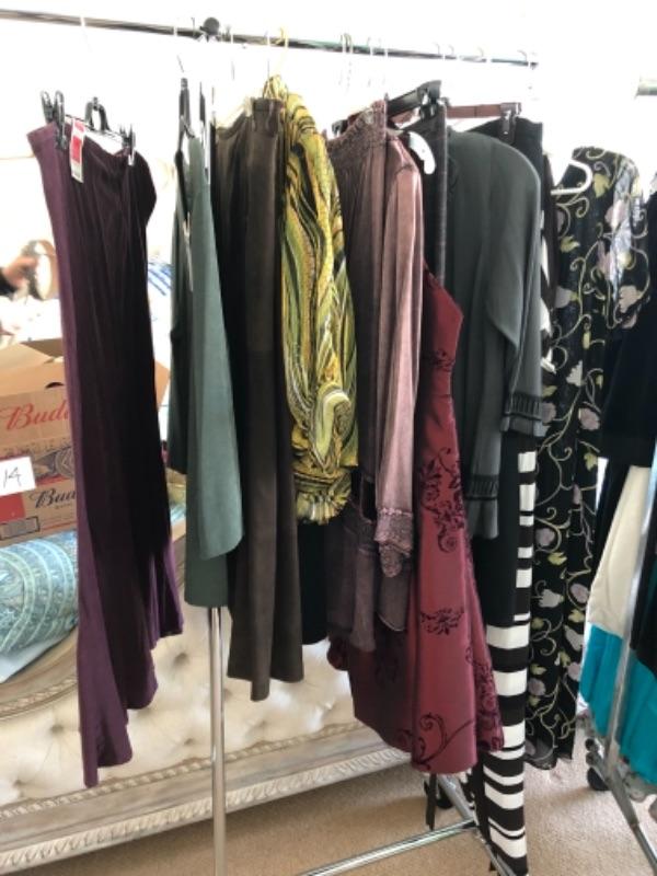 Lot 115U. Lot of 11 new and used casual wear“”Size Large, skirts, tops, leather Faconnable skirt, Lindee, Bianchi, Terry skirt and top, Peruni dress and jacket, plaid wool skirt by Cotswald Collection--$125