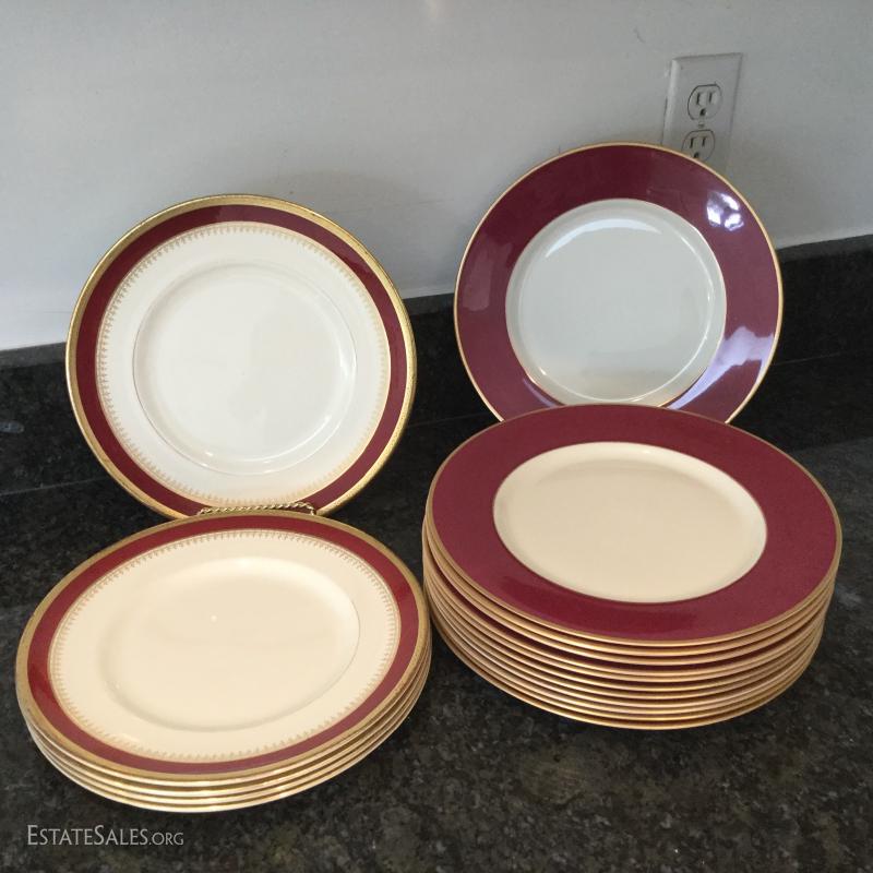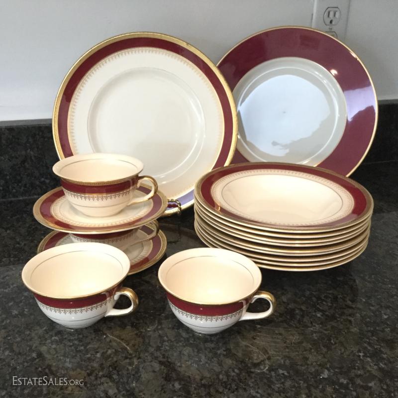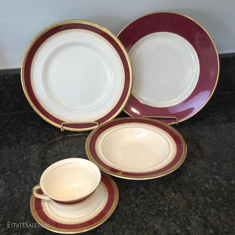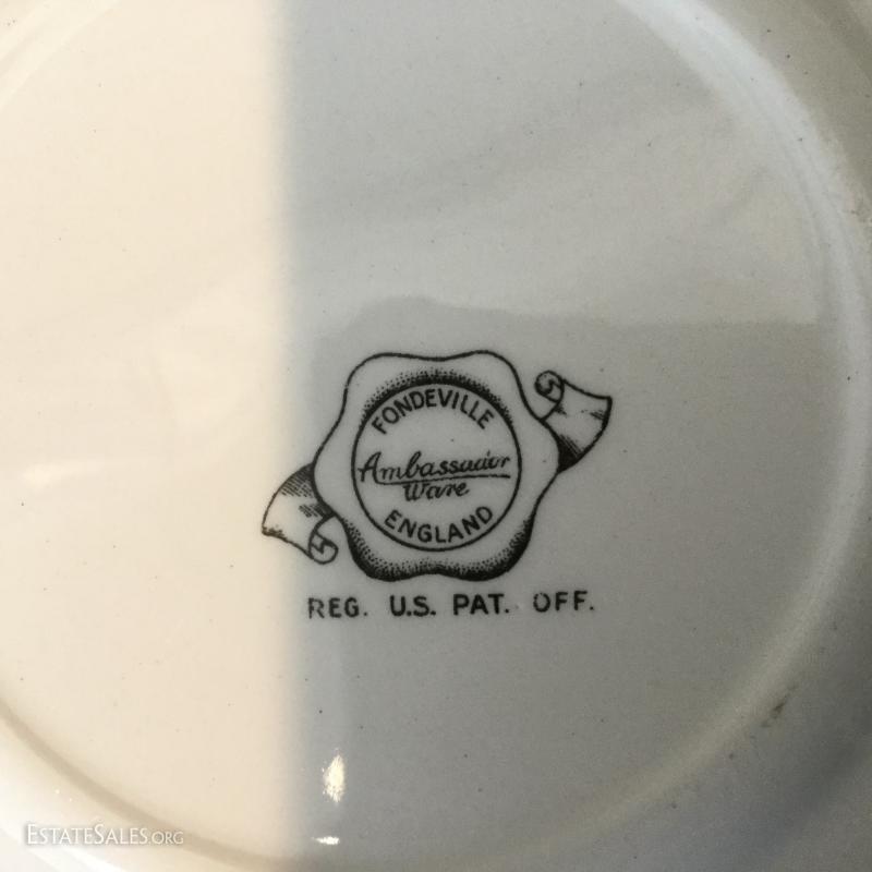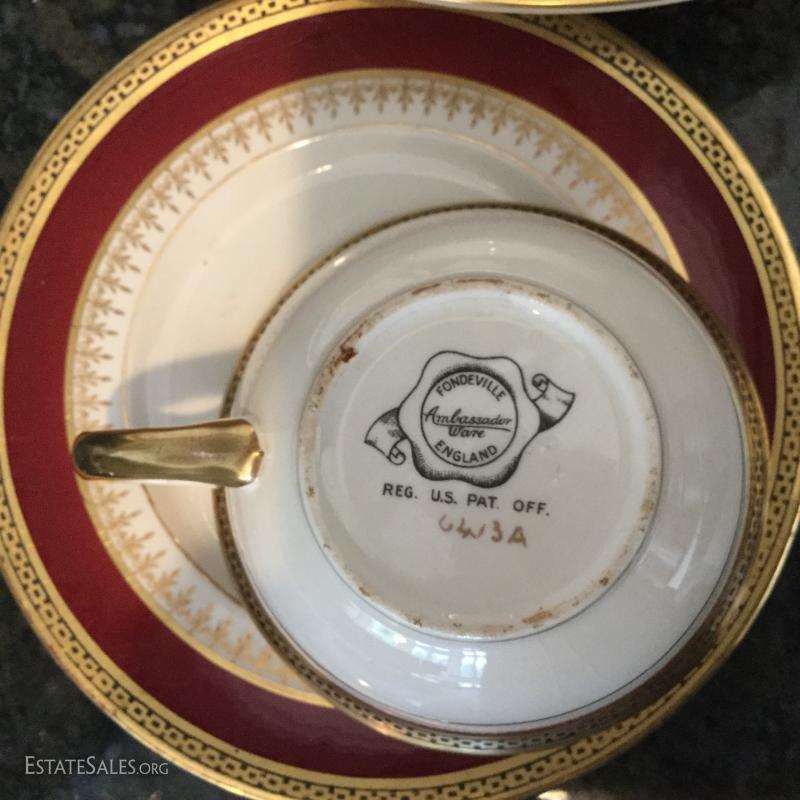 32 pieces in this china set. Marked "Ambassador Ware, Fondeville, England" on bottom. Cream and wine color with gold trim. Some wear on gold and a few plate edge chips. Not a full set. See photos. Shipping available or local pick up in Flat Rock, NC.
