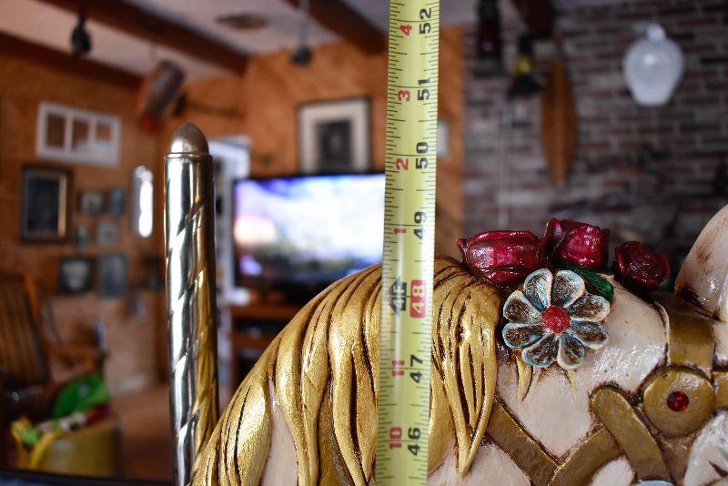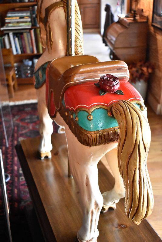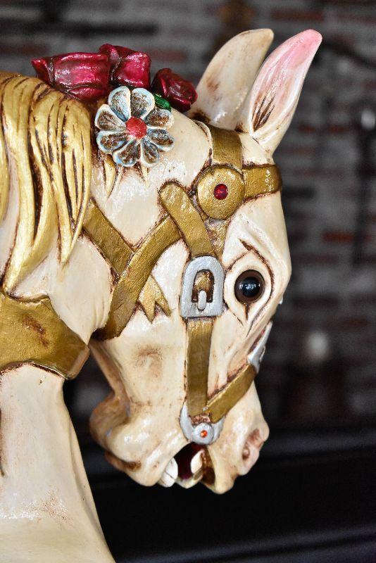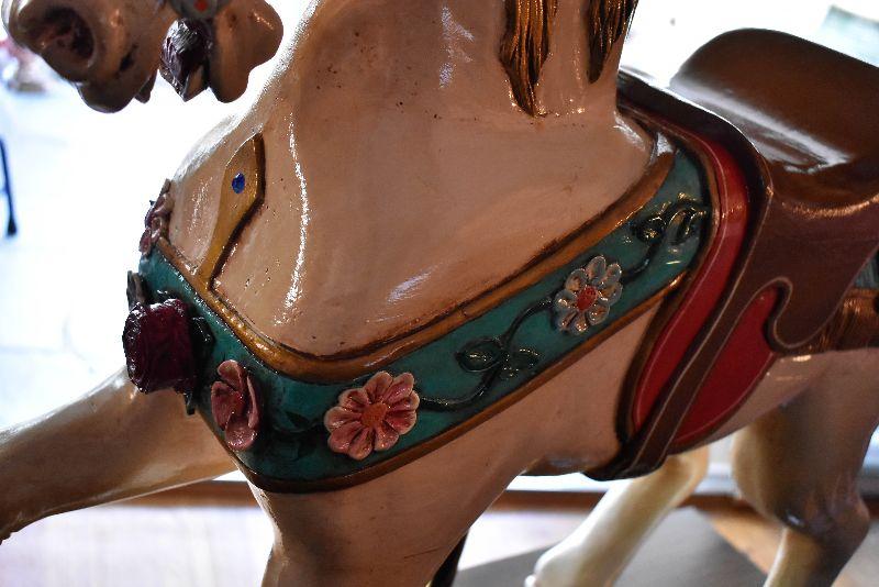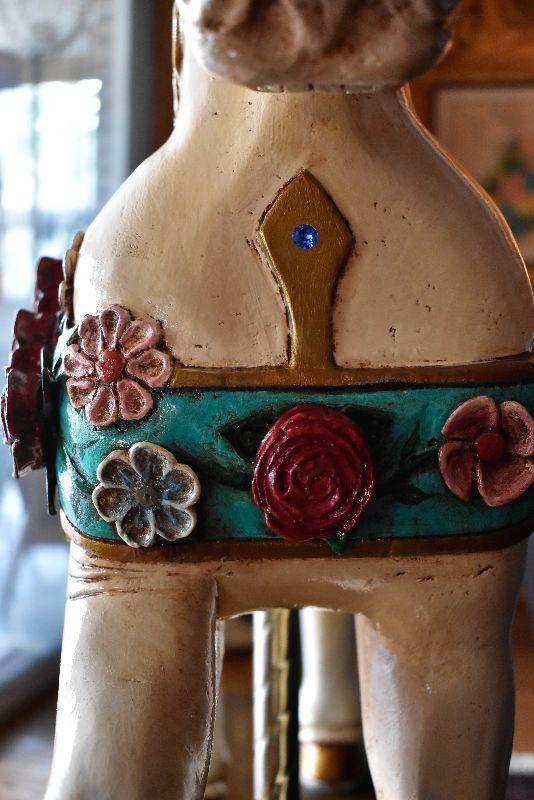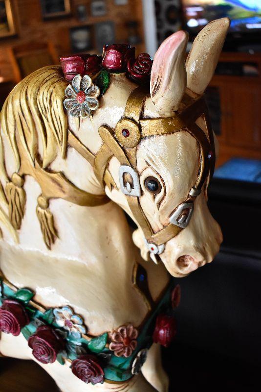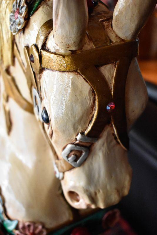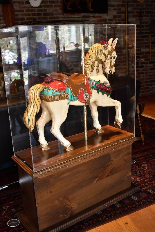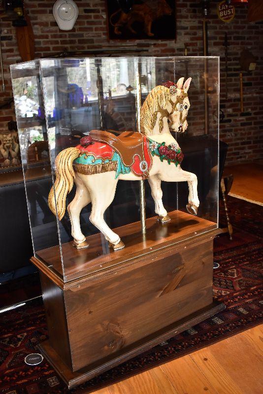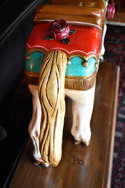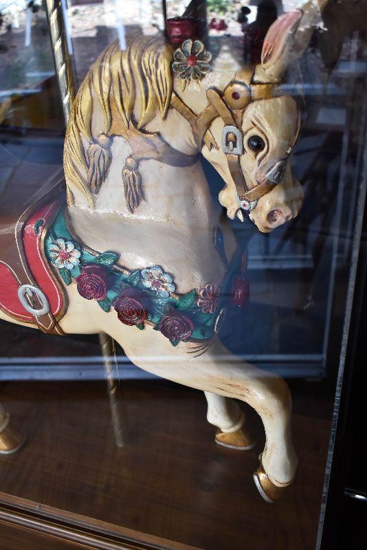 This gorgeous Hand Carved Carousel Horse comes with the display case pictured. A truly remarkable piece of art featuring hand carved flowers and gemstones. It took the artist over 400 hours to complete. One owner - comes with the COA letter addressed to this owner we are selling it for.