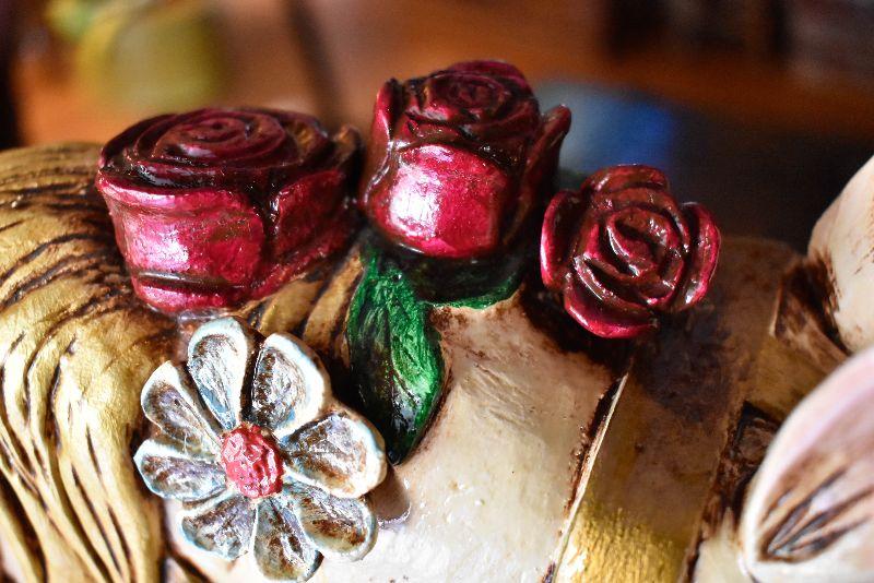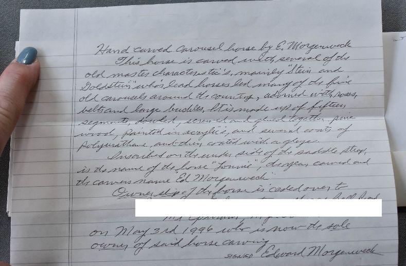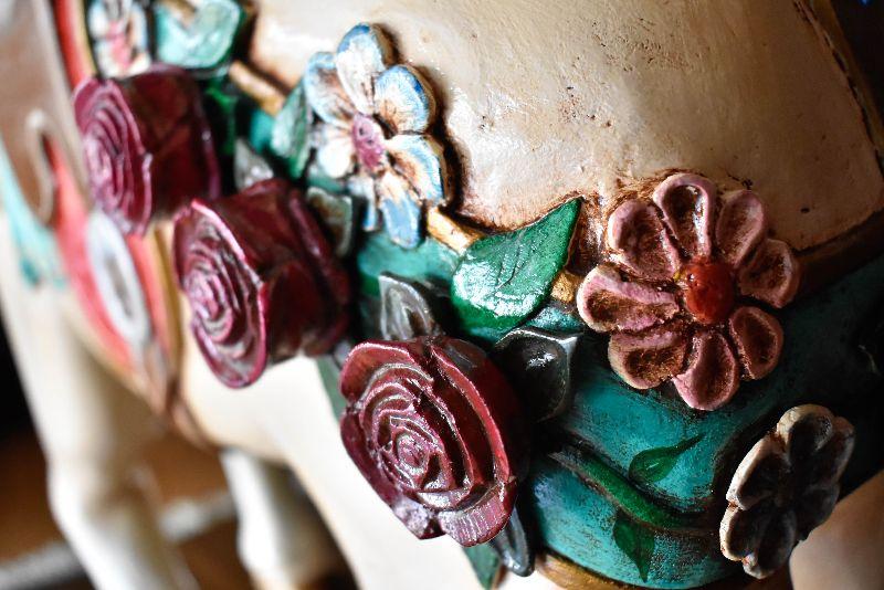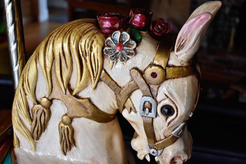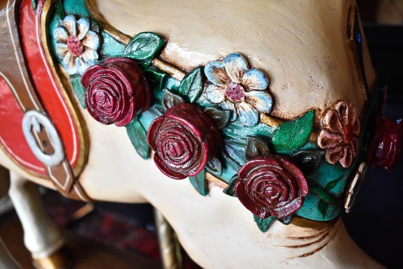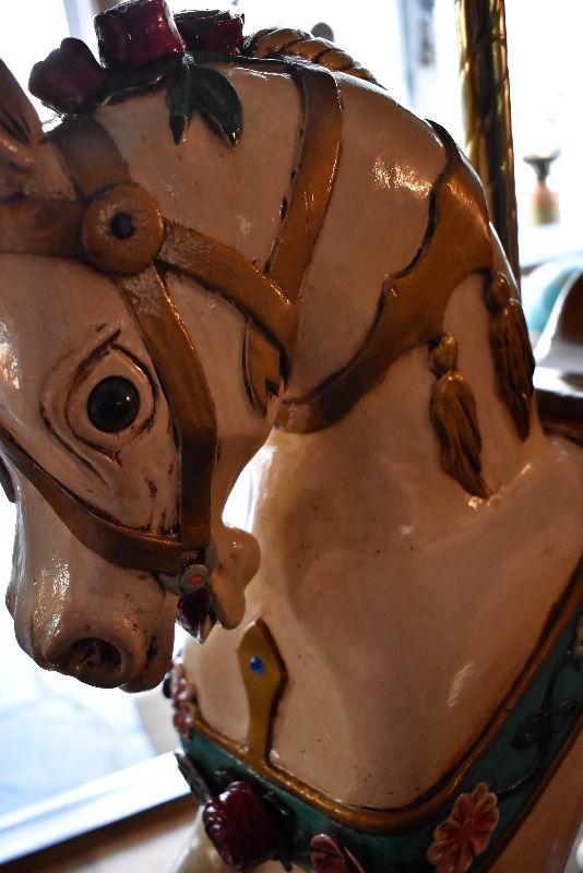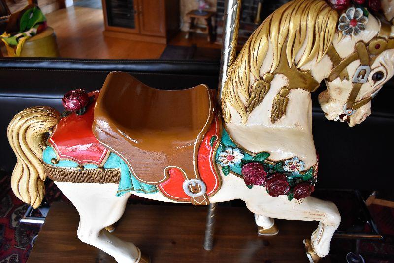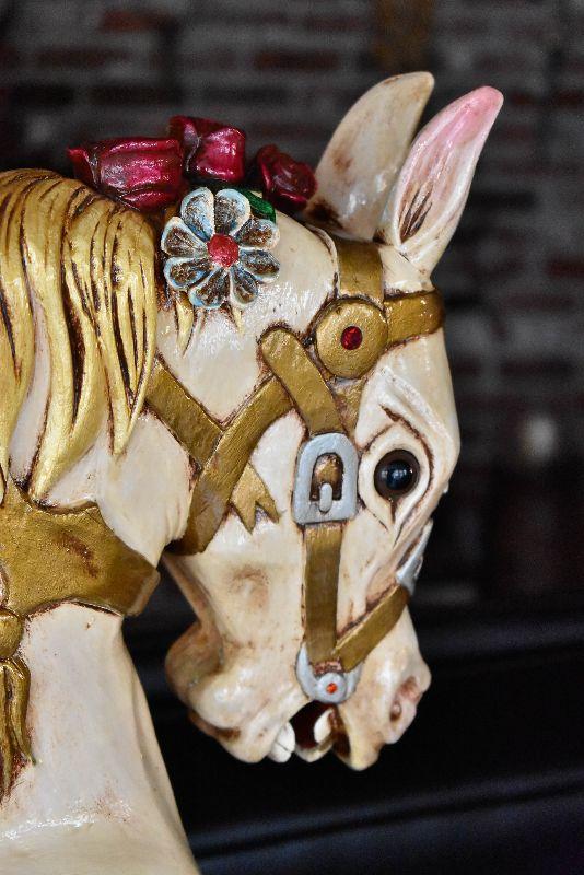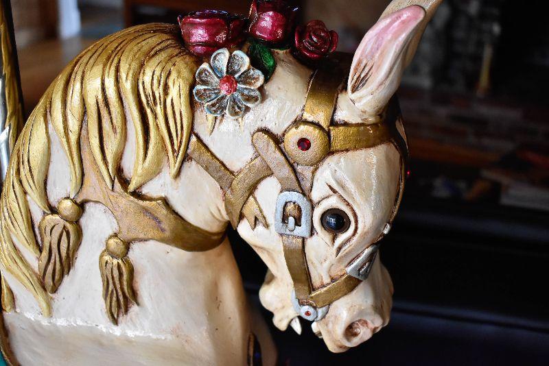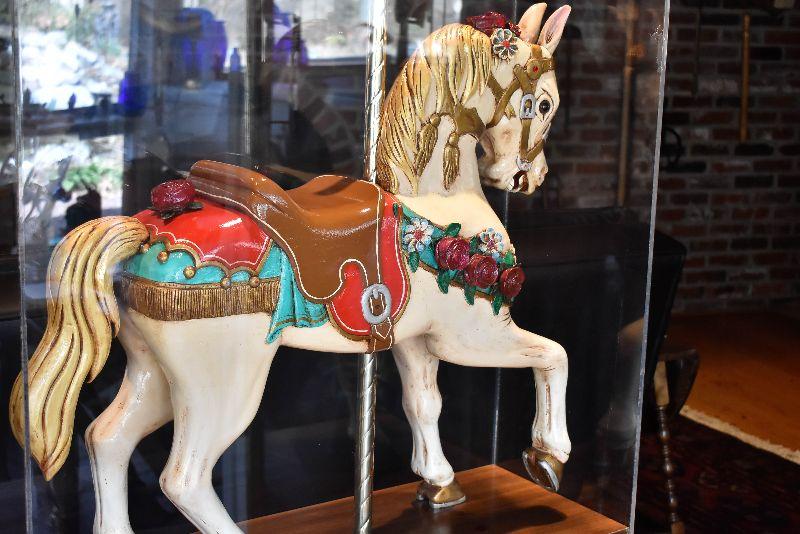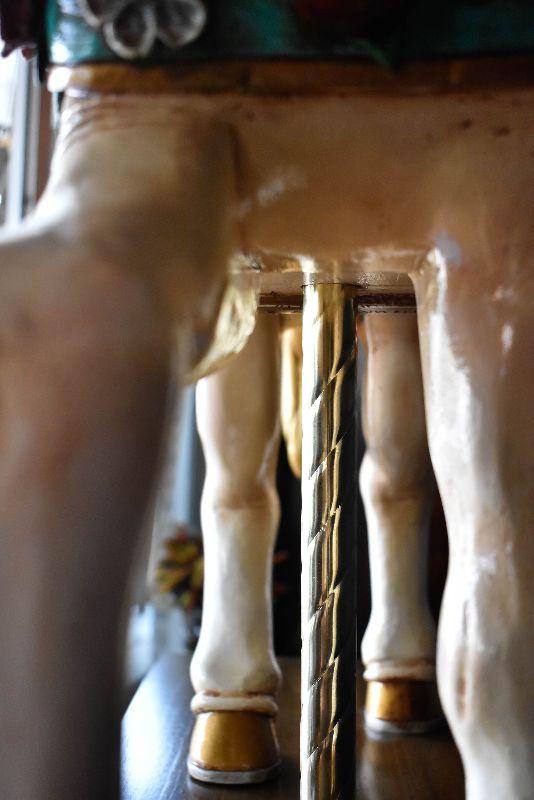This gorgeous Hand Carved Carousel Horse comes with the display case pictured. A truly remarkable piece of art featuring hand carved flowers and gemstones. It took the artist over 400 hours to complete. One owner - comes with the COA letter addressed to this owner we are selling it for.