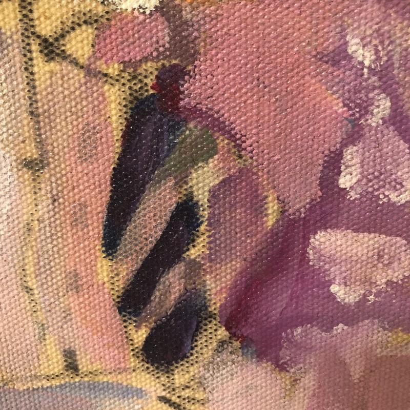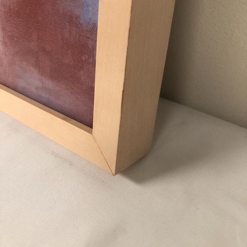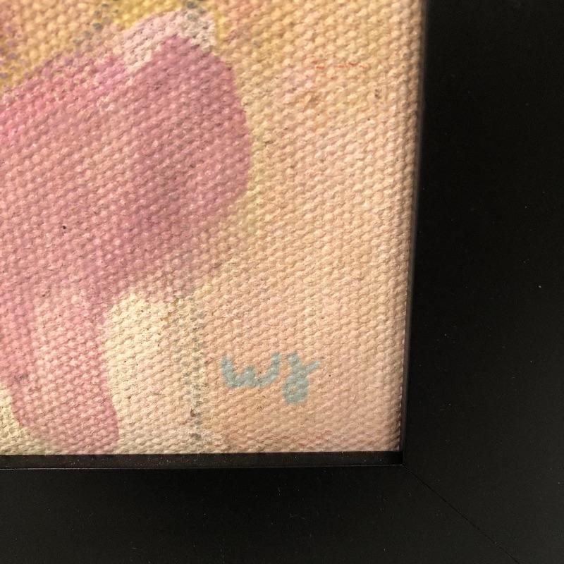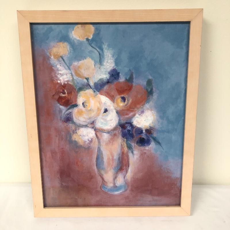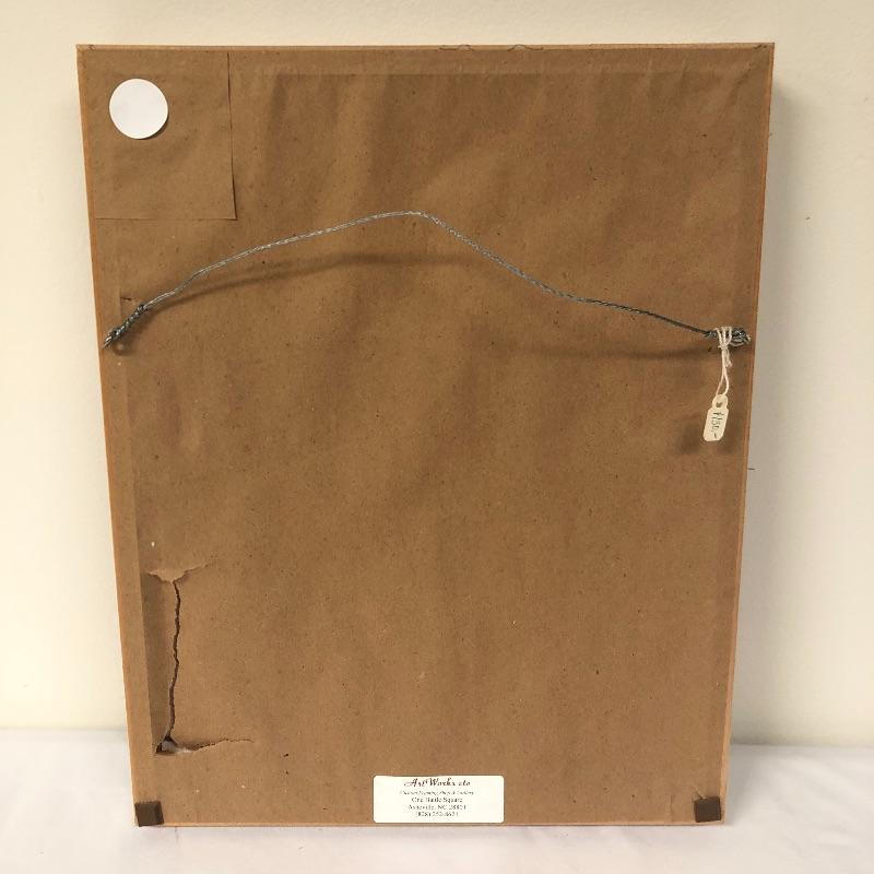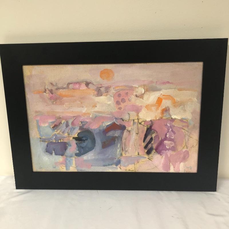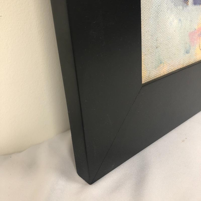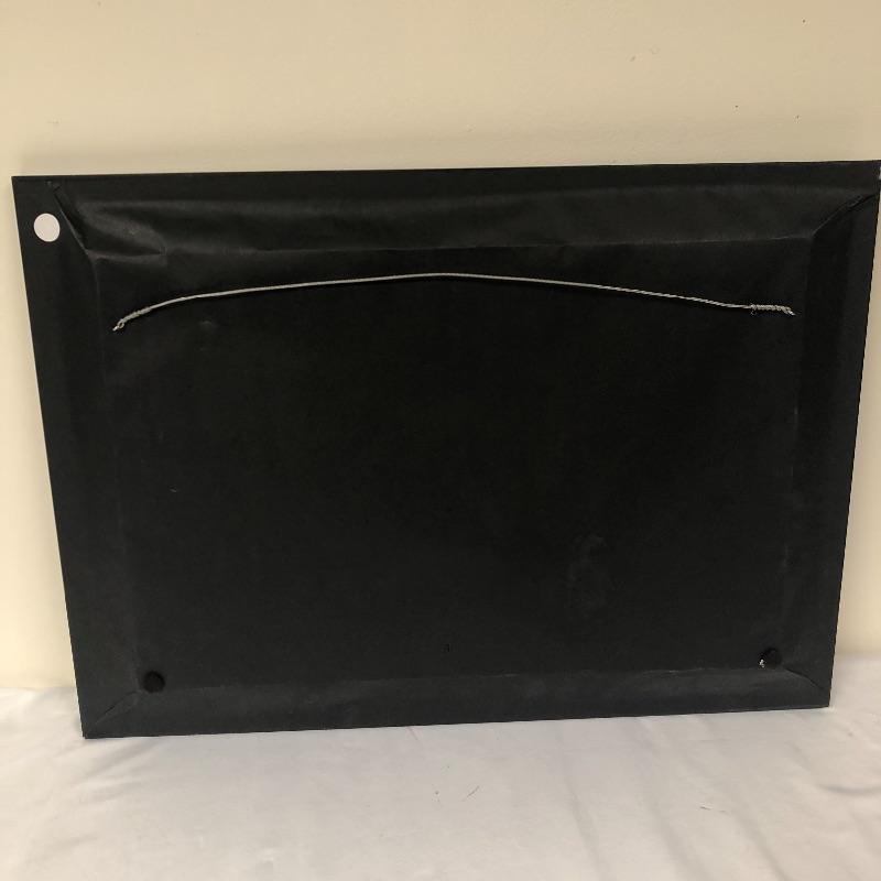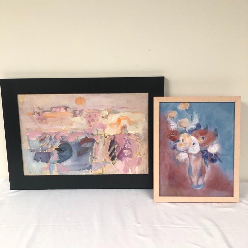 The larger abstract painting (24” x 17”) appears to be an original on canvas with a signature on bottom right. It is framed in black and the back paper is in great condition. The smaller floral artwork (12” x 15.5”) is a print on textured material and is framed with a few small rips in the back. No glass coverings on either piece.