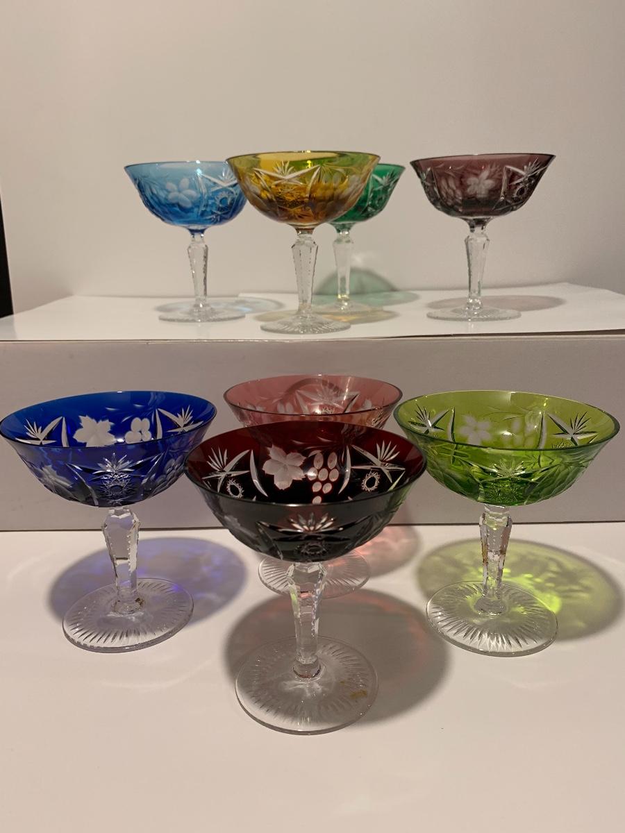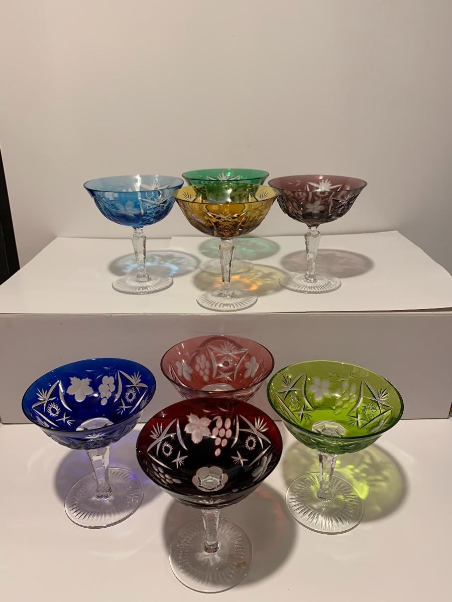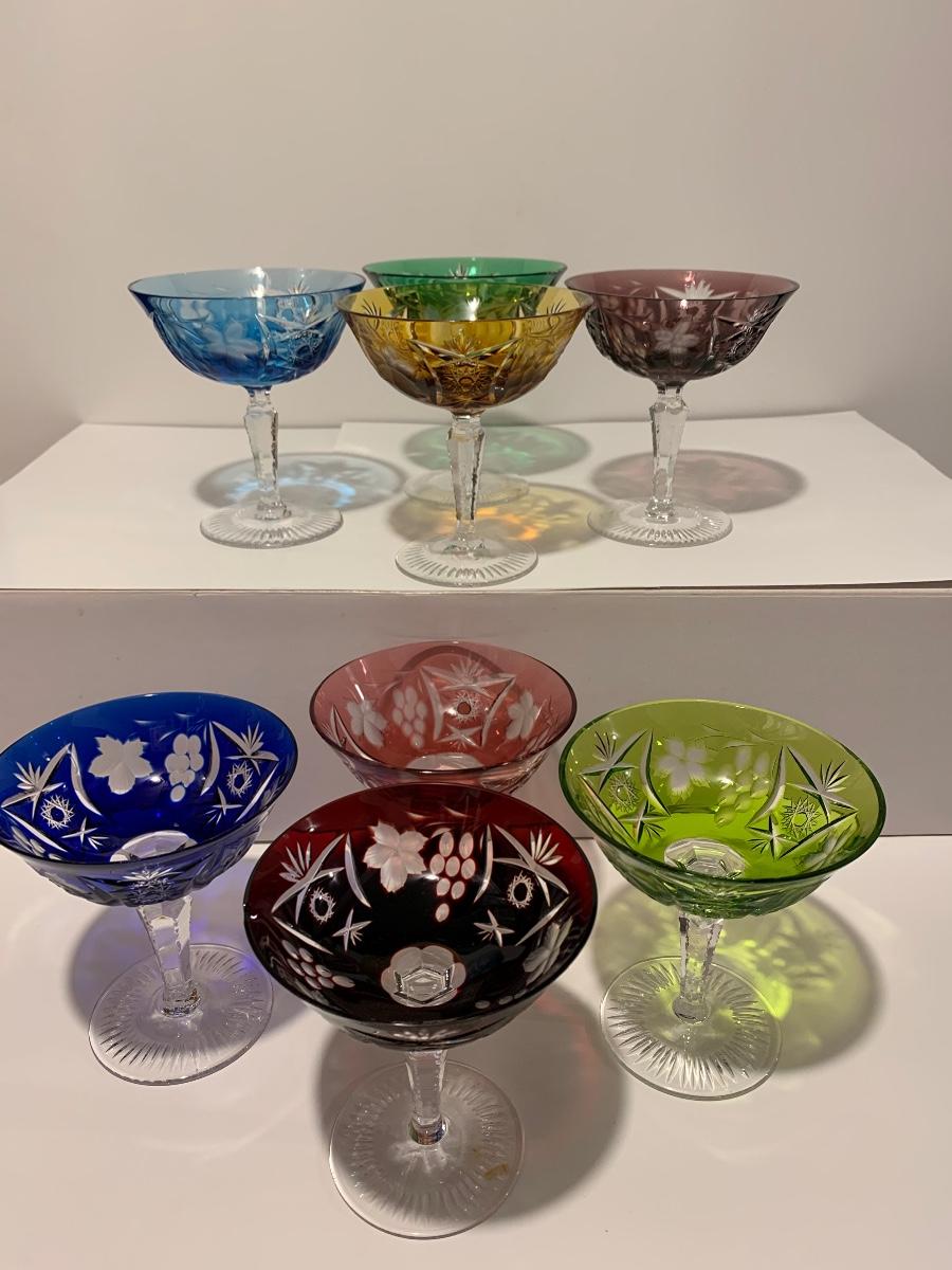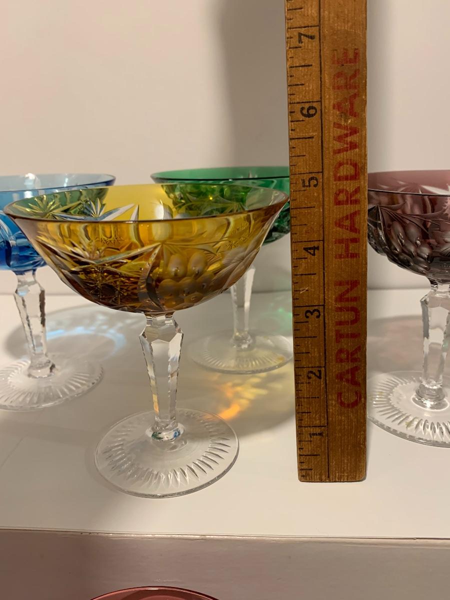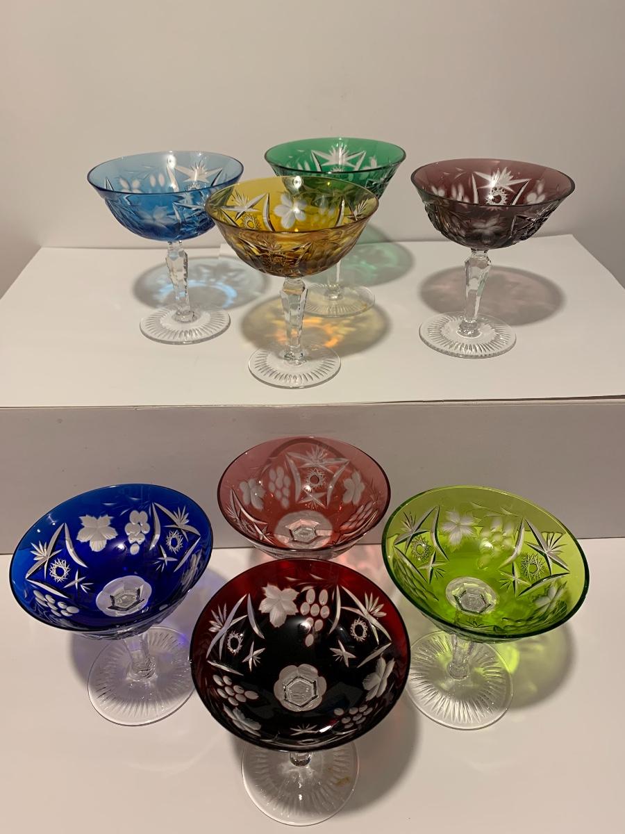 Beautiful set of 8 multicolored cut to clear glassware with notched stems from Germany Just stunning. They have had minimal use if any. The crystal is nice and clear without any residue.