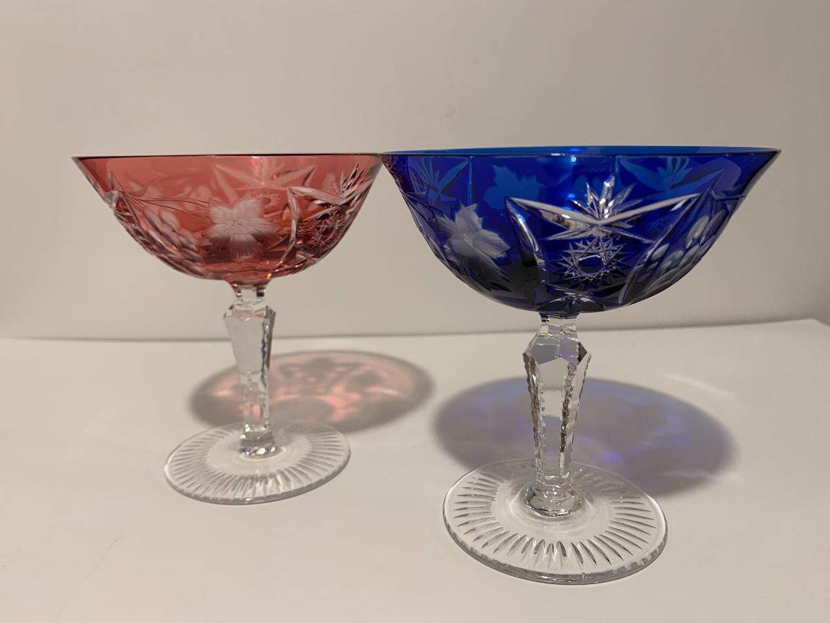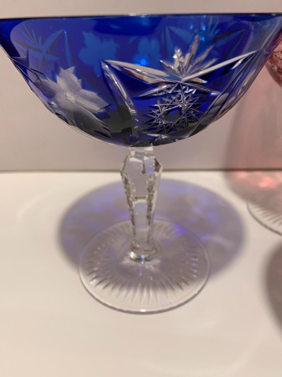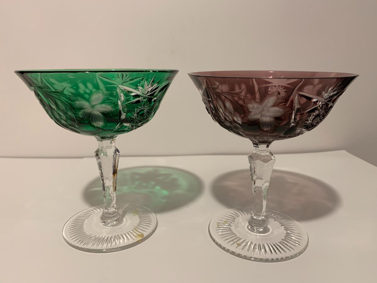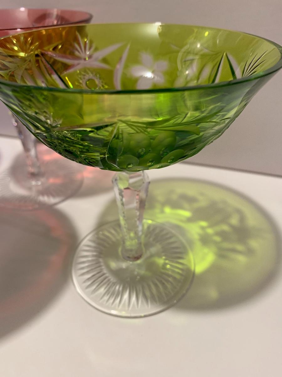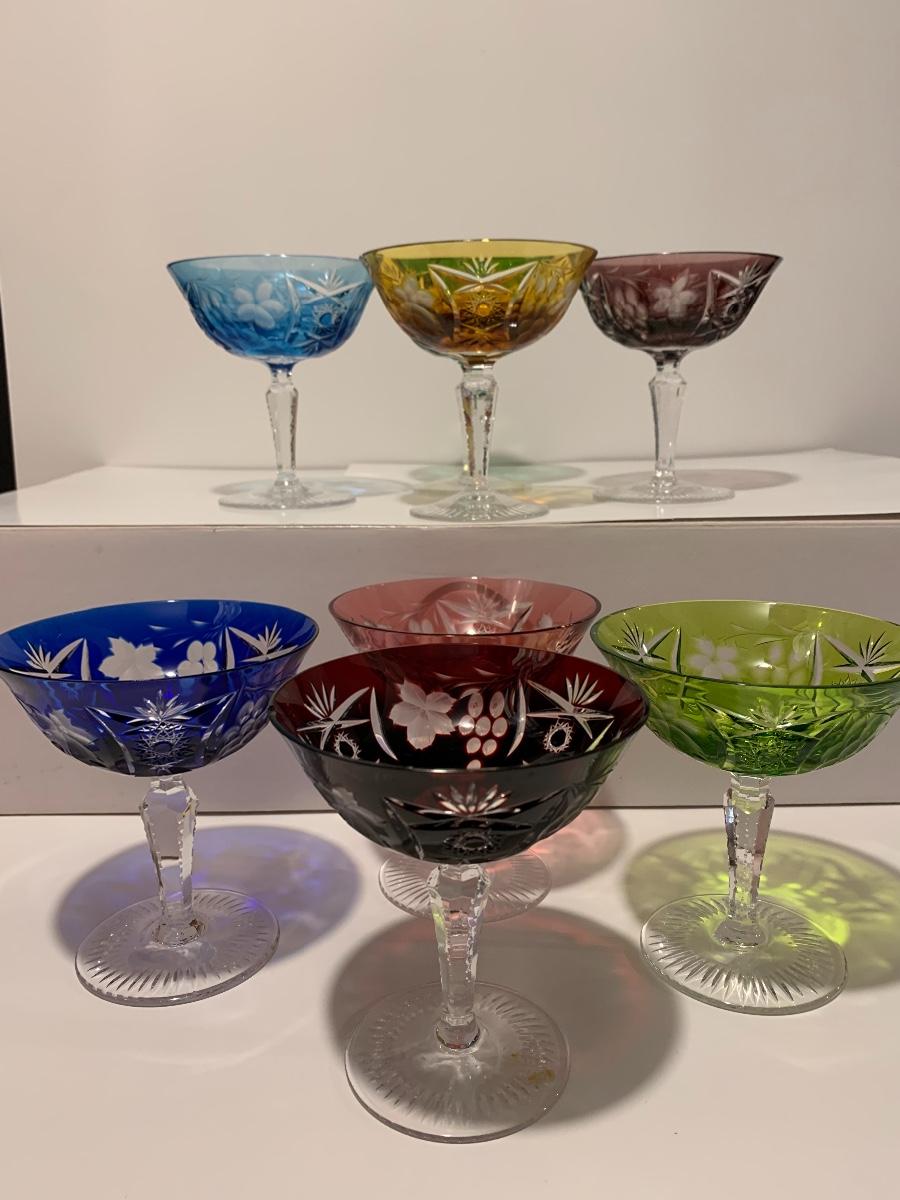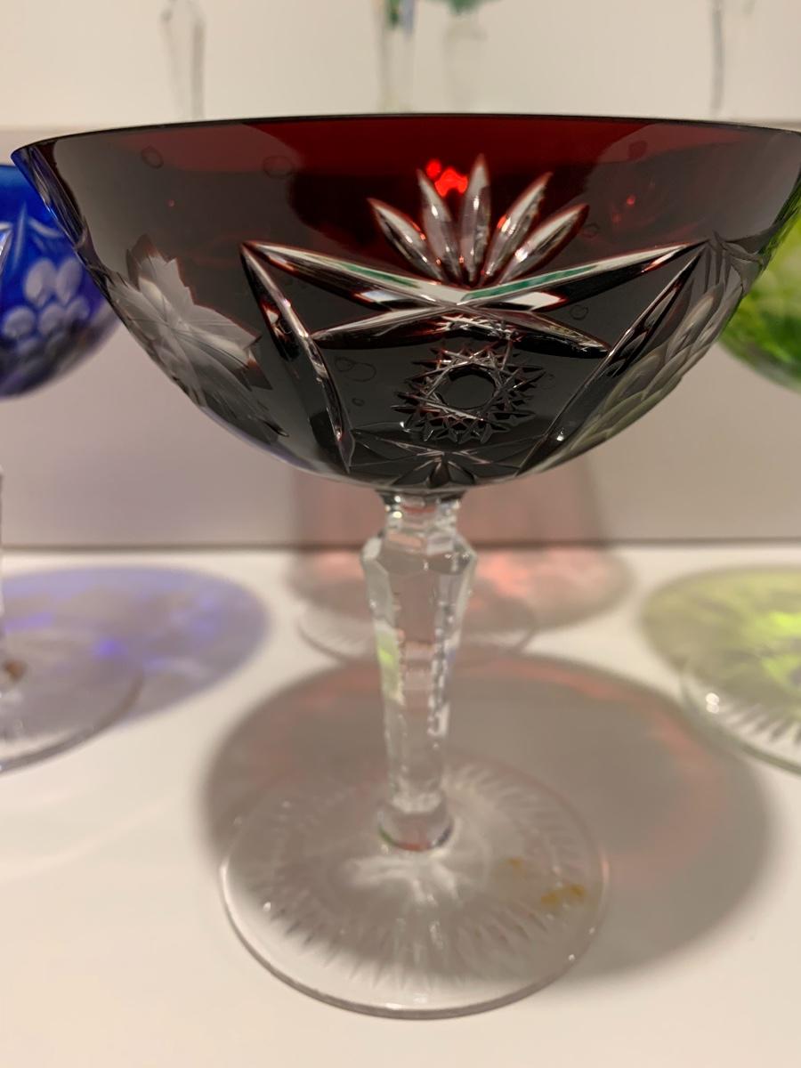 Beautiful set of 8 multicolored cut to clear glassware with notched stems from Germany Just stunning. They have had minimal use if any. The crystal is nice and clear without any residue.