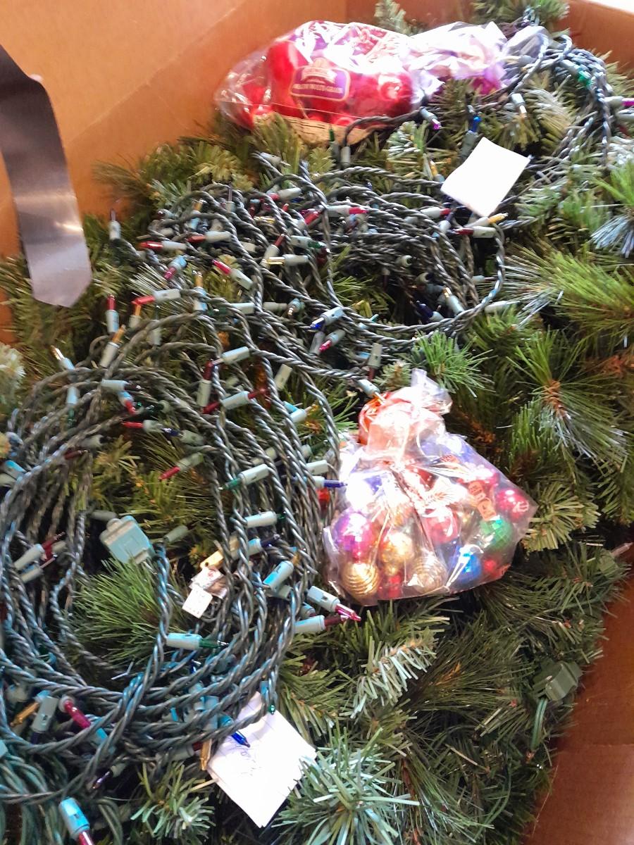 LOT 116 6.5' FAUX CHRISTMAS TREE WITH LIGHTS AND ORNAMENTS