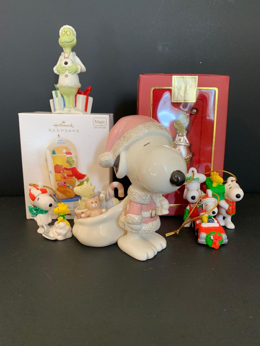 Ornaments and figures: Snoopy & Grinch: Hallmark & Lenox.