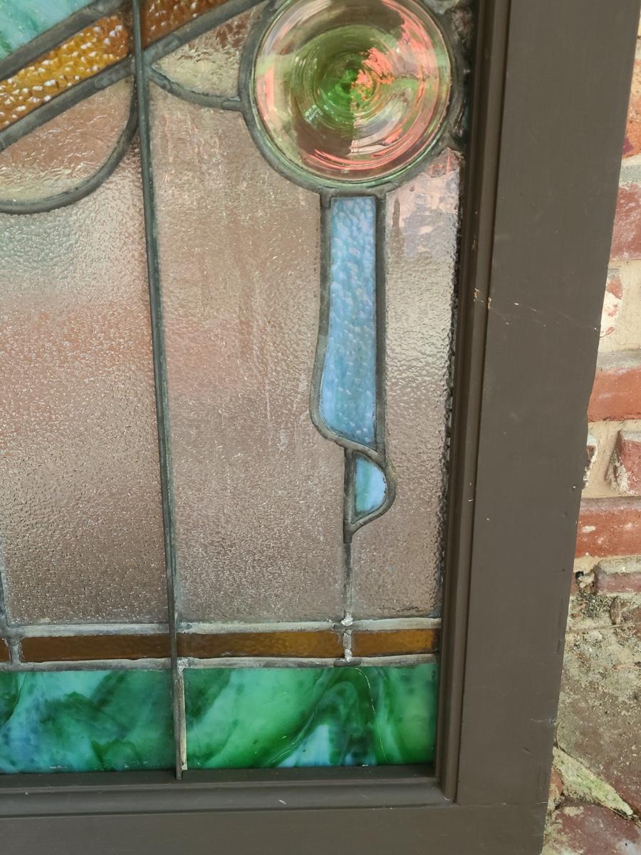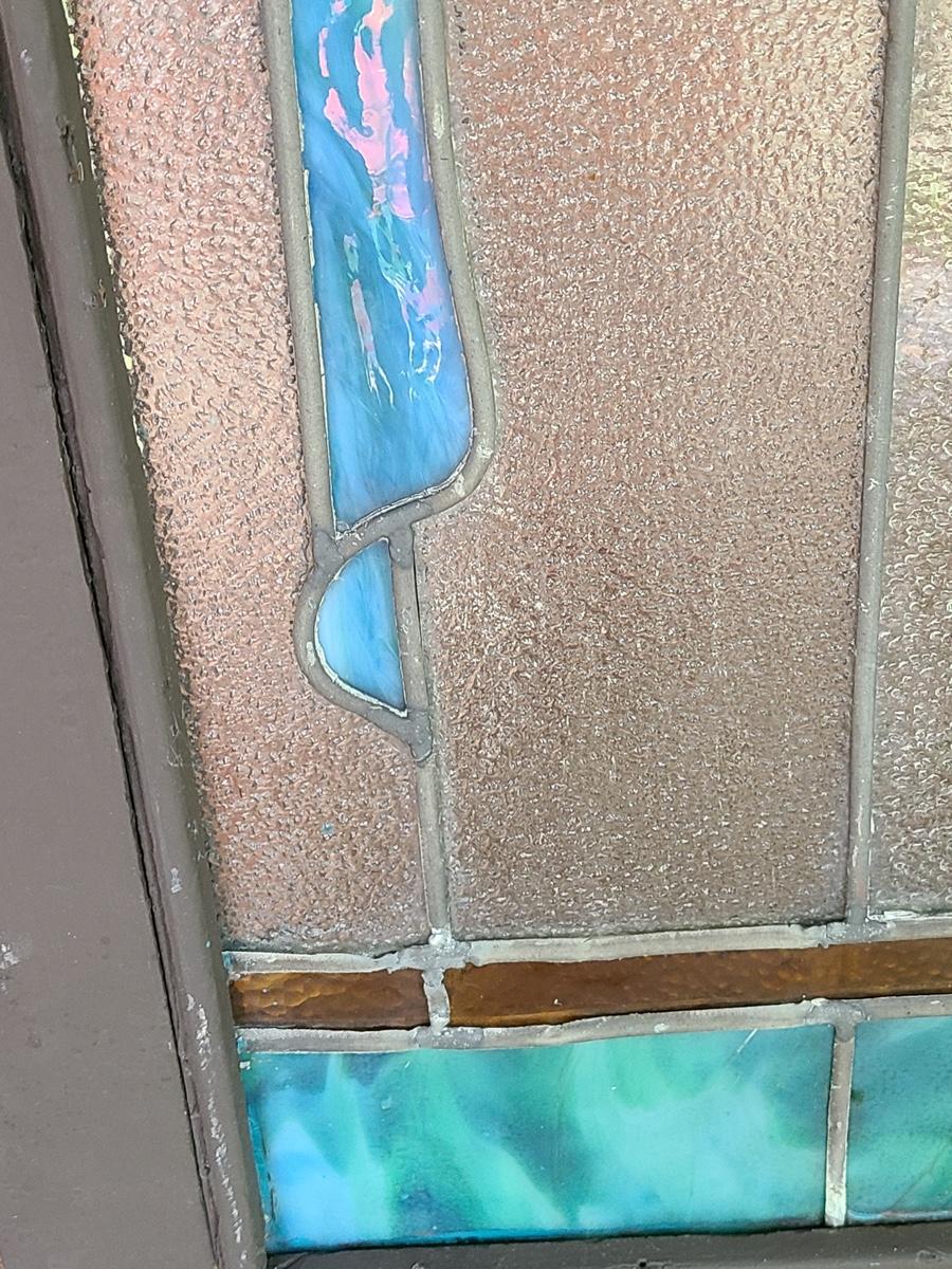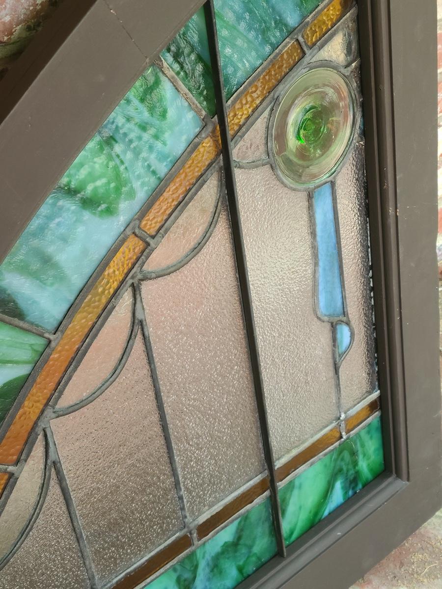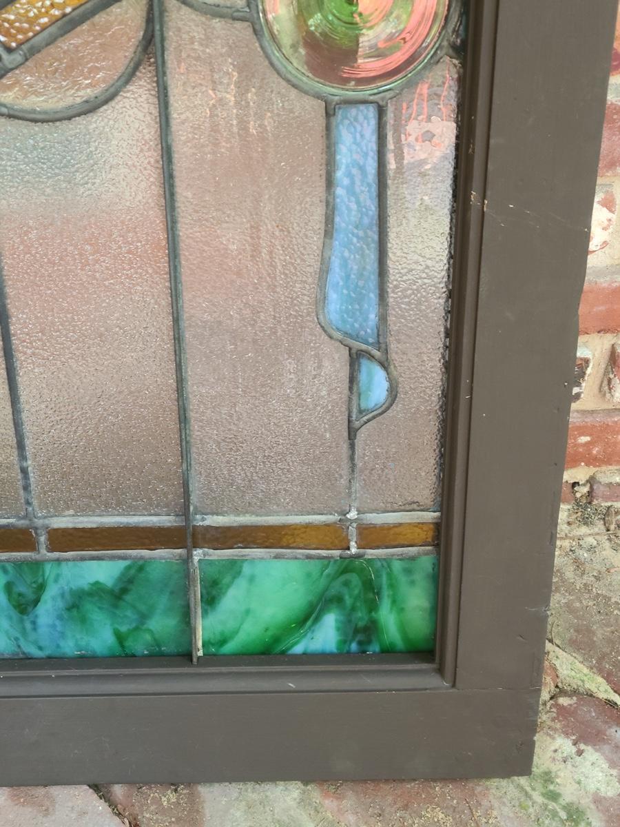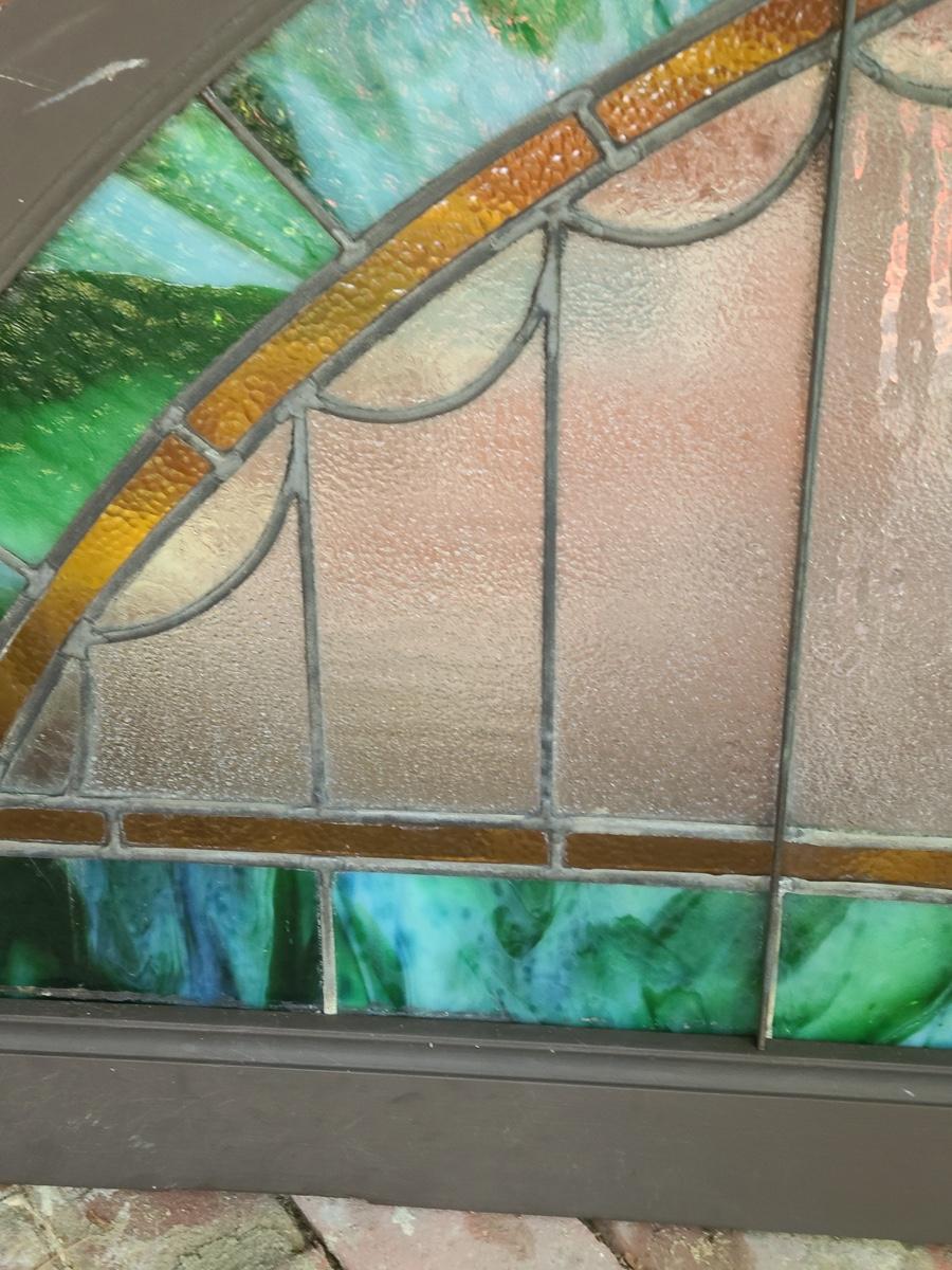 As mentioned, the client was a collector of stained glass windows from old churches. This piece is large in size, and hung in the corner of the staircase frame as a cornice window. It is beautiful. Inspected and no breaks or cracks noted, but please check pictures as some times marbling can have lines that aren't seen. Over 30 pictures taken. Pictures are the best representation of the item in the lot, the condition of the items in the lot, and the size if measurements were taken. All items are sold as-is, since they are pre-owned and antiques.