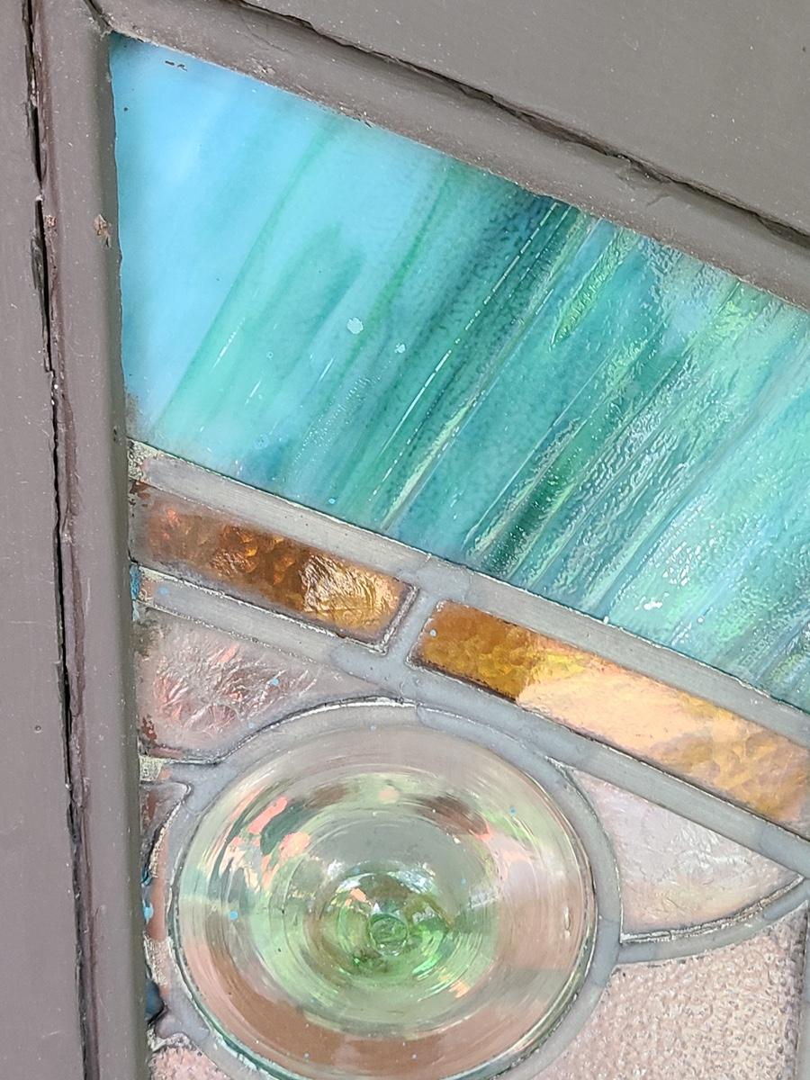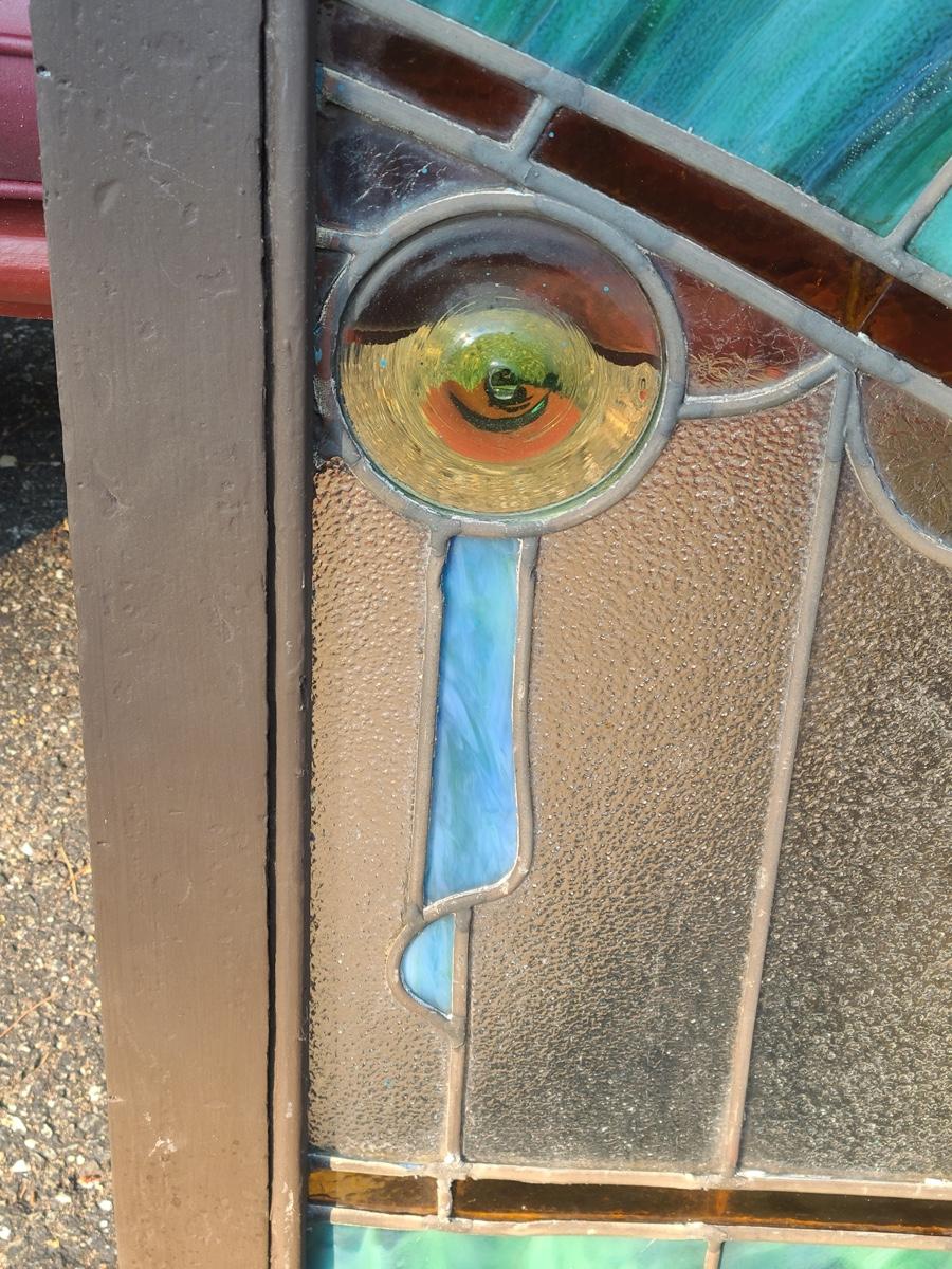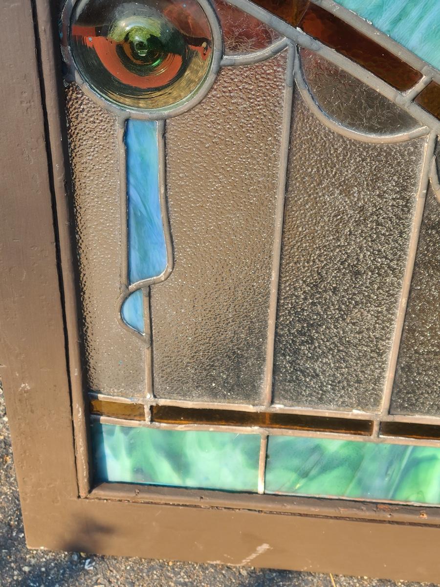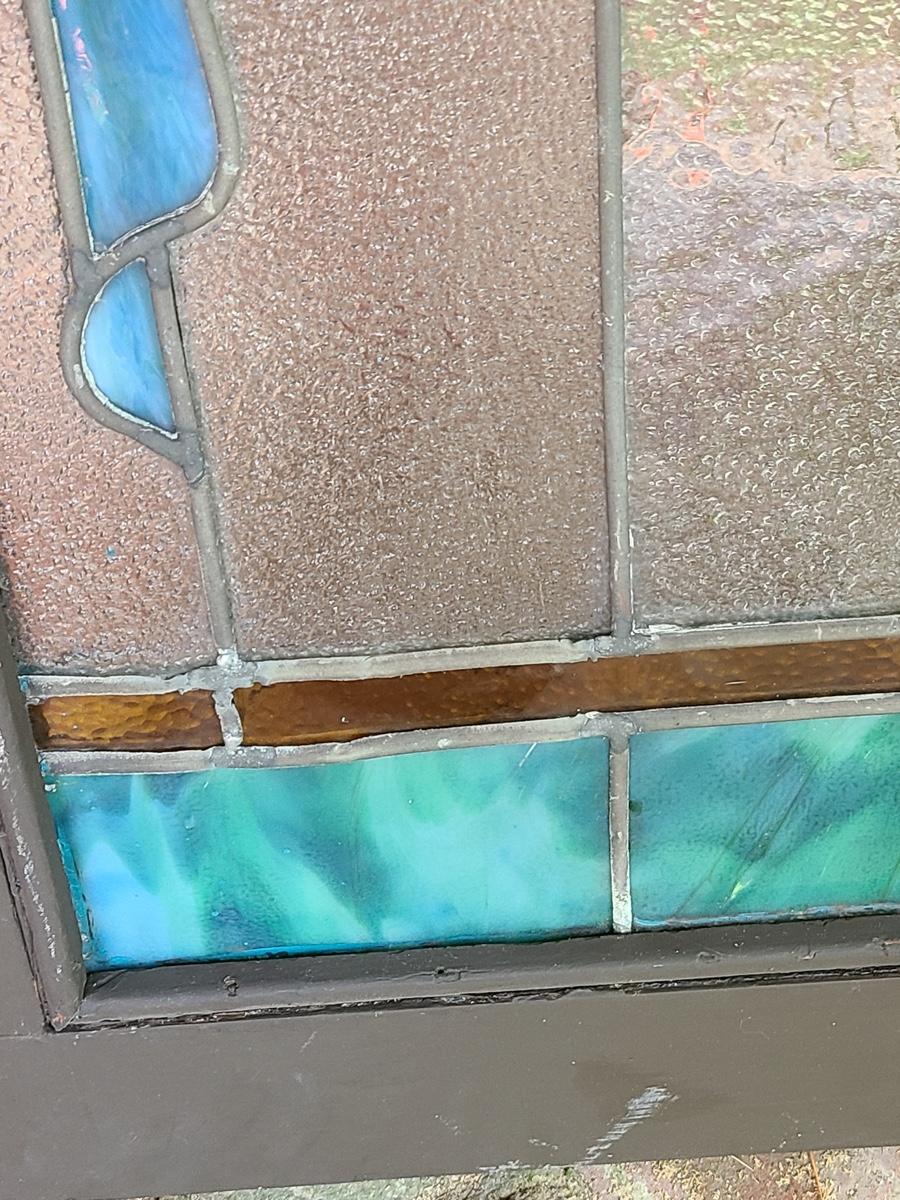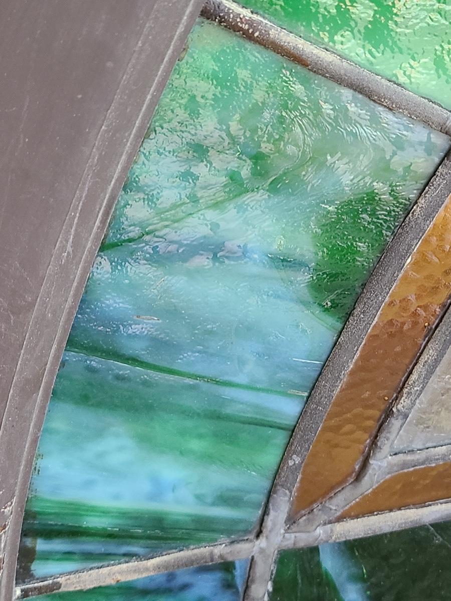 As mentioned, the client was a collector of stained glass windows from old churches. This piece is large in size, and hung in the corner of the staircase frame as a cornice window. It is beautiful. Inspected and no breaks or cracks noted, but please check pictures as some times marbling can have lines that aren't seen. Over 30 pictures taken. Pictures are the best representation of the item in the lot, the condition of the items in the lot, and the size if measurements were taken. All items are sold as-is, since they are pre-owned and antiques.