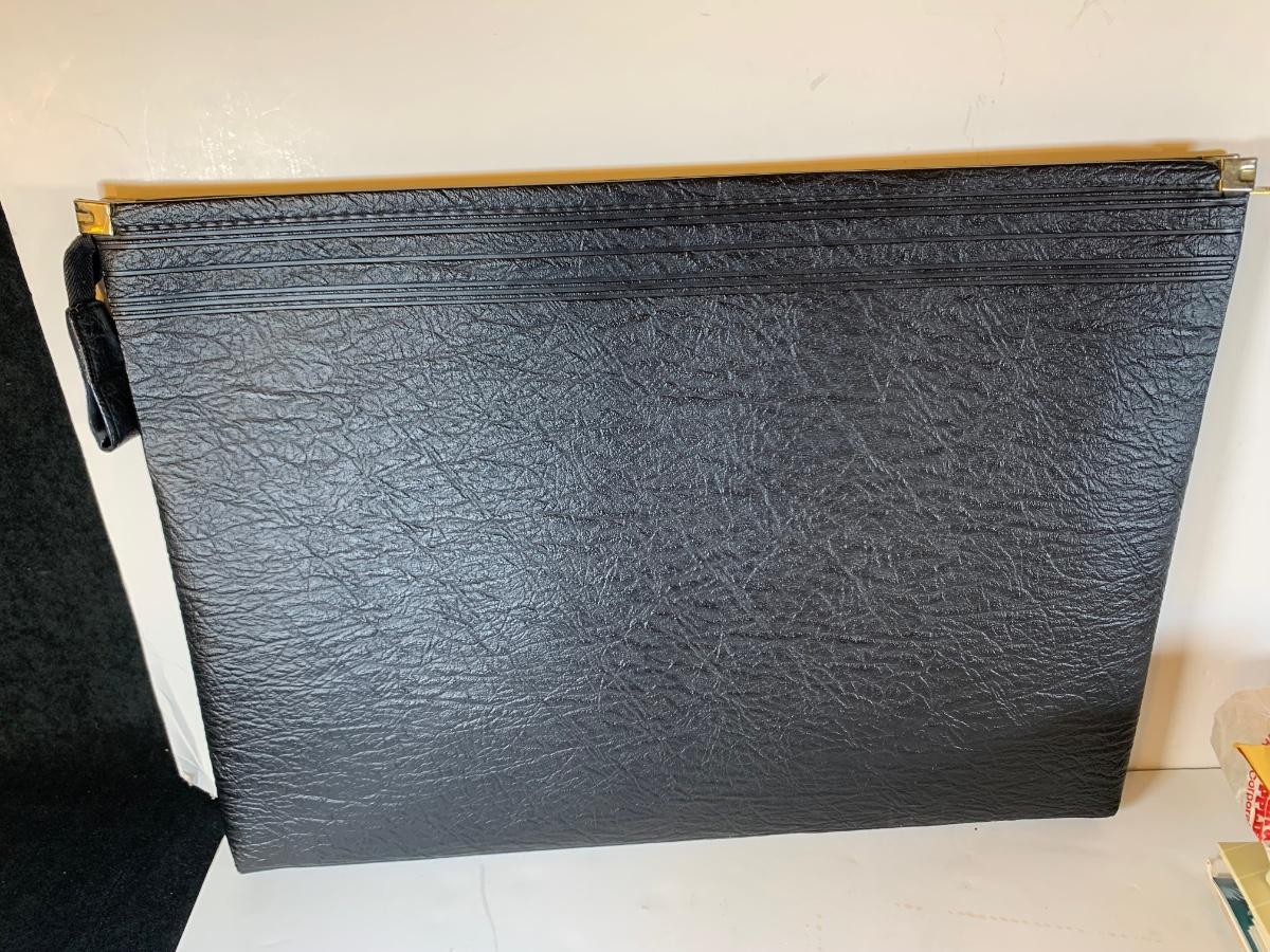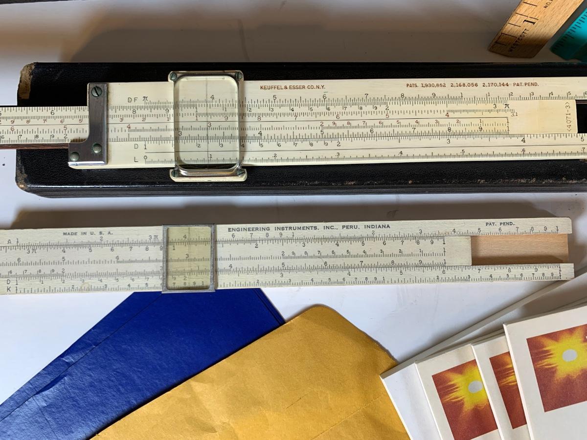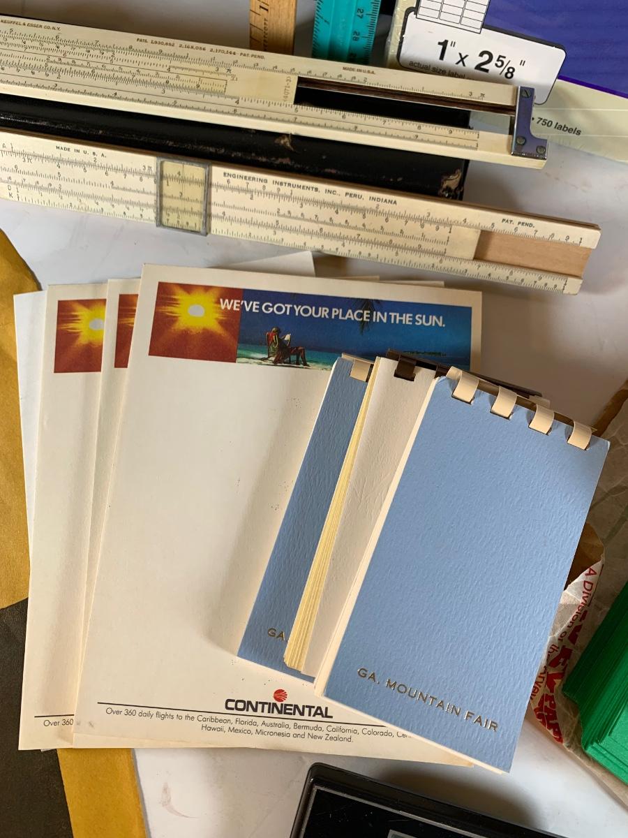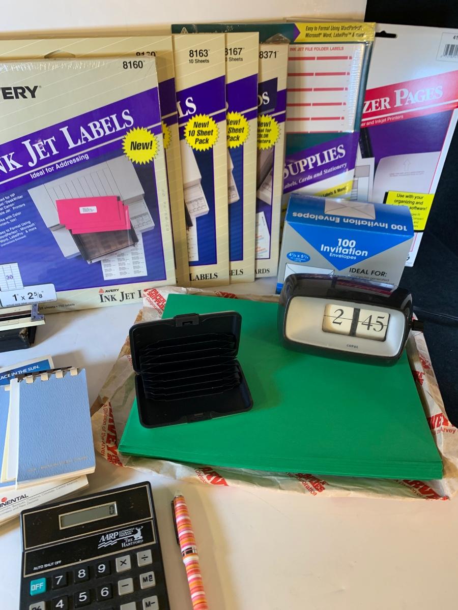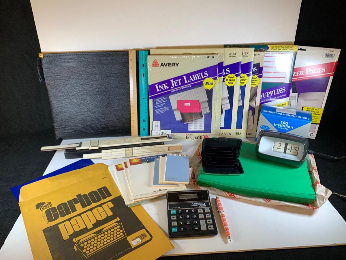 Lot includes green copy paper, calculator, carbon paper, a variety of Avery Ink Jet labels, 2 slide rulers, business card holder, vintage electric clock, vinyl carry case.