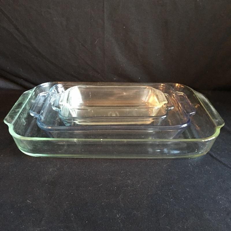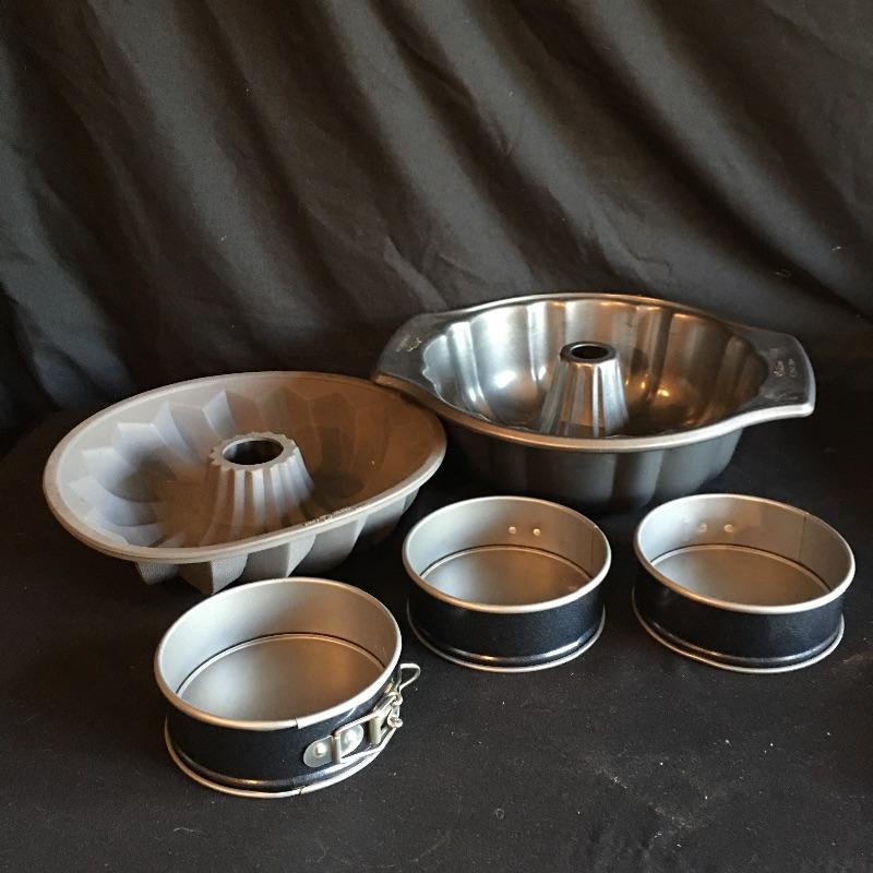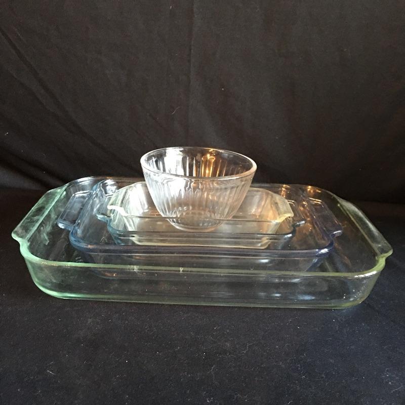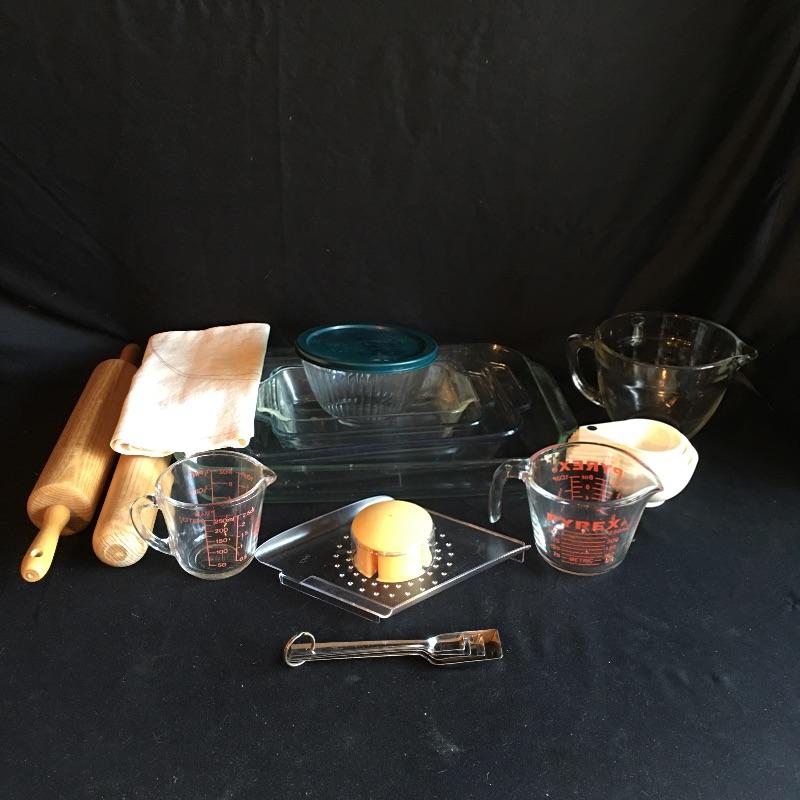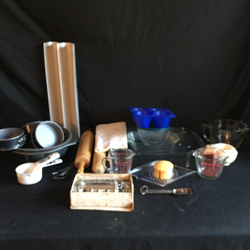 This collection of baking essentials includes three glass measuring cups, two sets of plastic measuring cups, measuring spoons, Bundt pan, three small cake pans, silicone muffin mold, one rectangular Pyrex and three Anchor dishes, Pyrex bowl, wooden rolling pins, icing set and more.