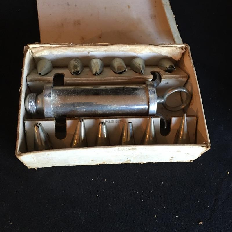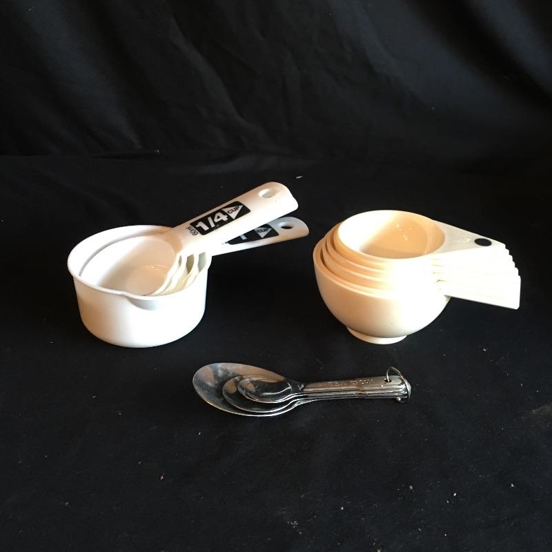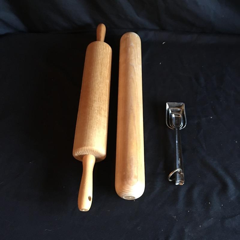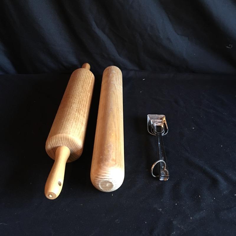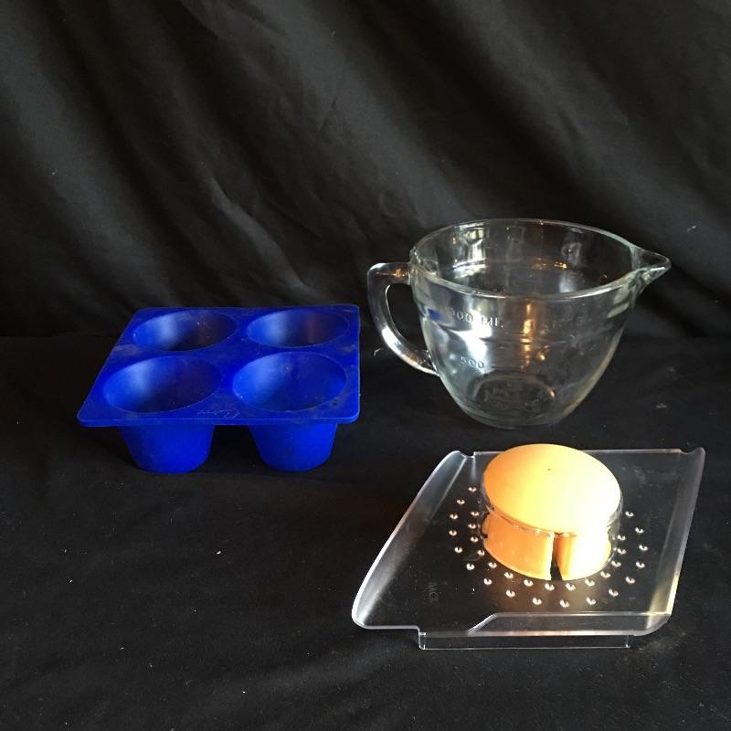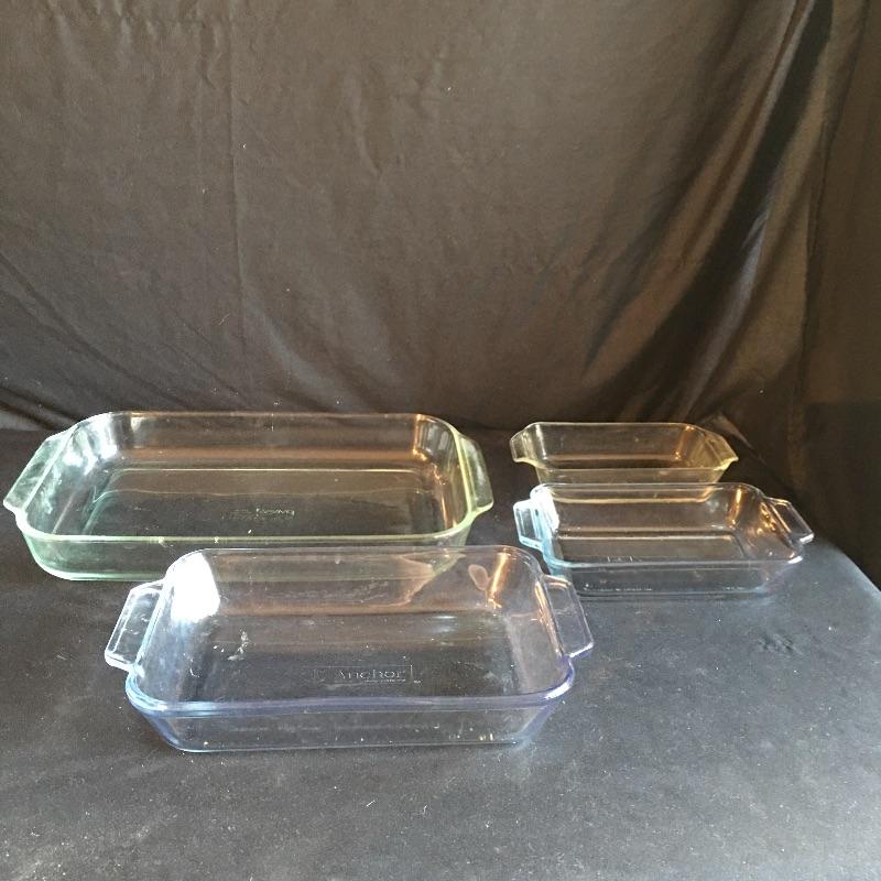 This collection of baking essentials includes three glass measuring cups, two sets of plastic measuring cups, measuring spoons, Bundt pan, three small cake pans, silicone muffin mold, one rectangular Pyrex and three Anchor dishes, Pyrex bowl, wooden rolling pins, icing set and more.