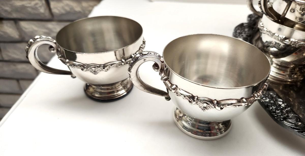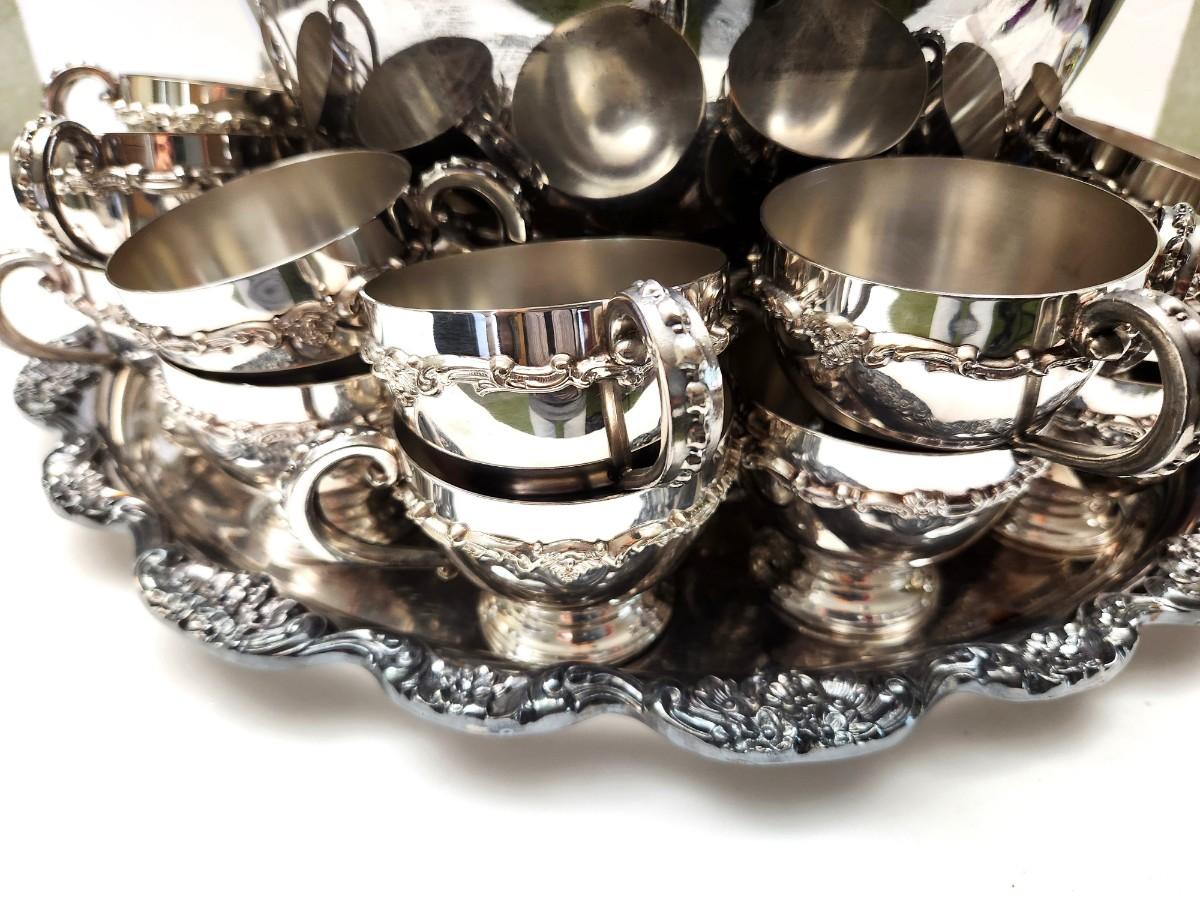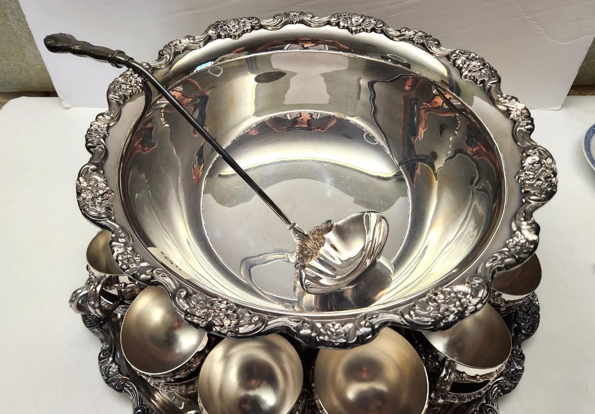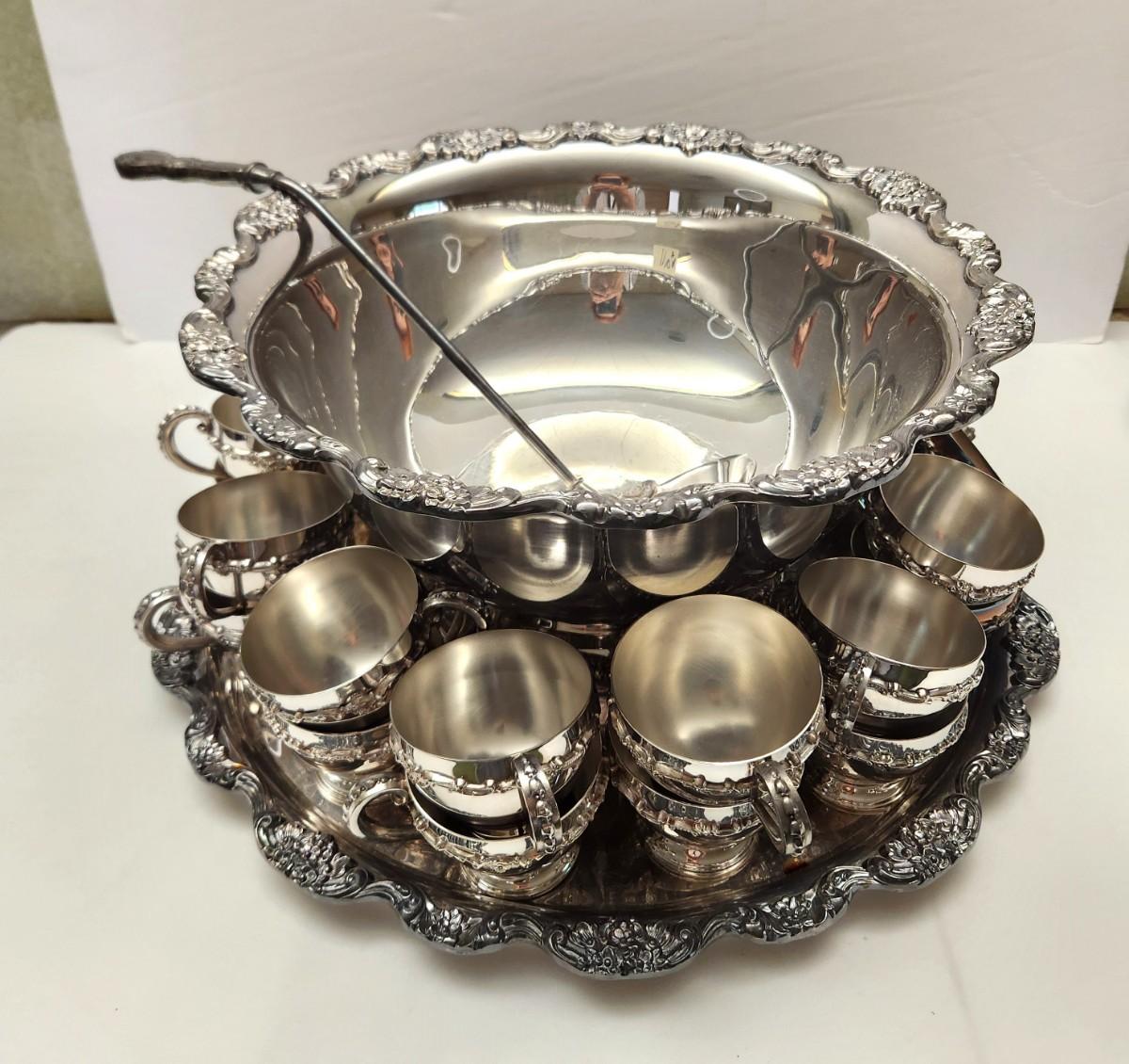 Lot #116 Beautiful Vintage Poole Silverplate Punch Bowl w/underplate, ladle, and 26 Cups