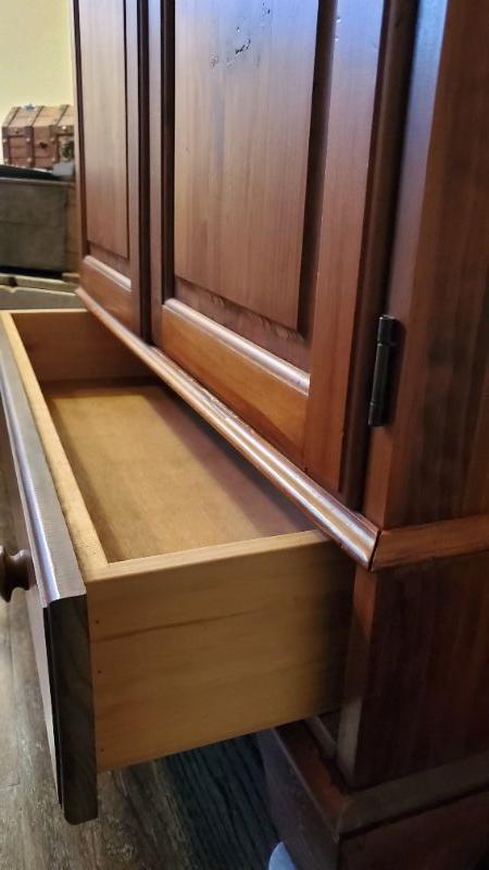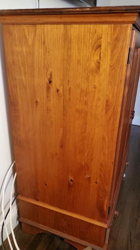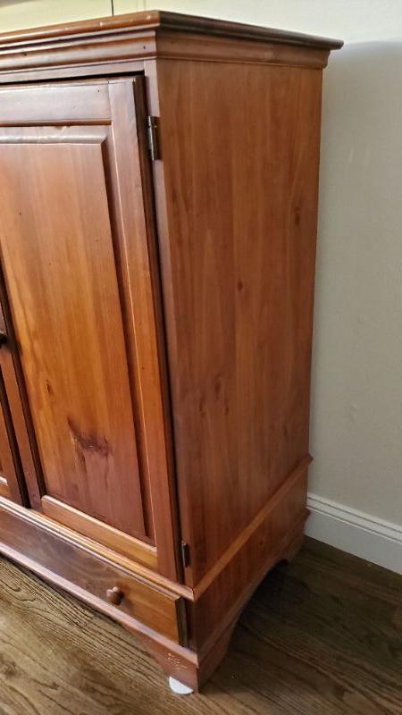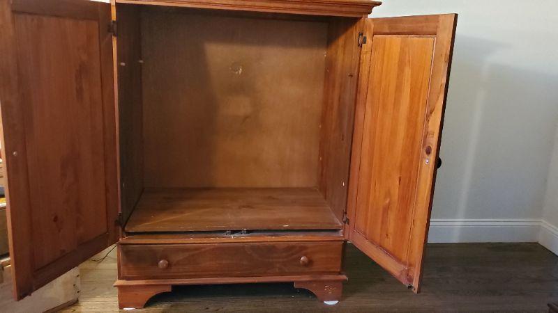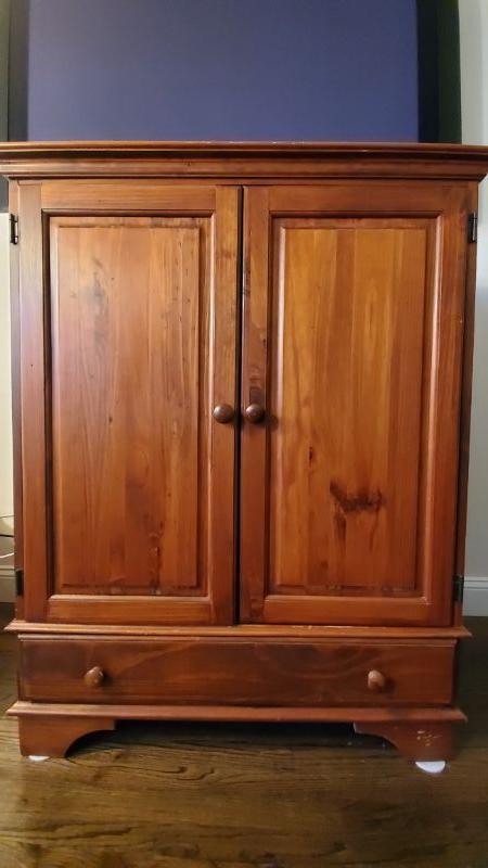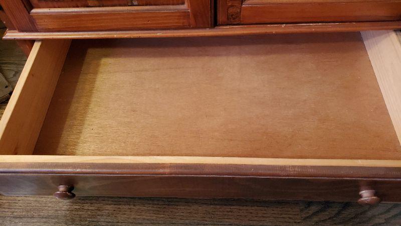 Wooden cabinet with one drawer. Can be used as TV center. Wear noted.