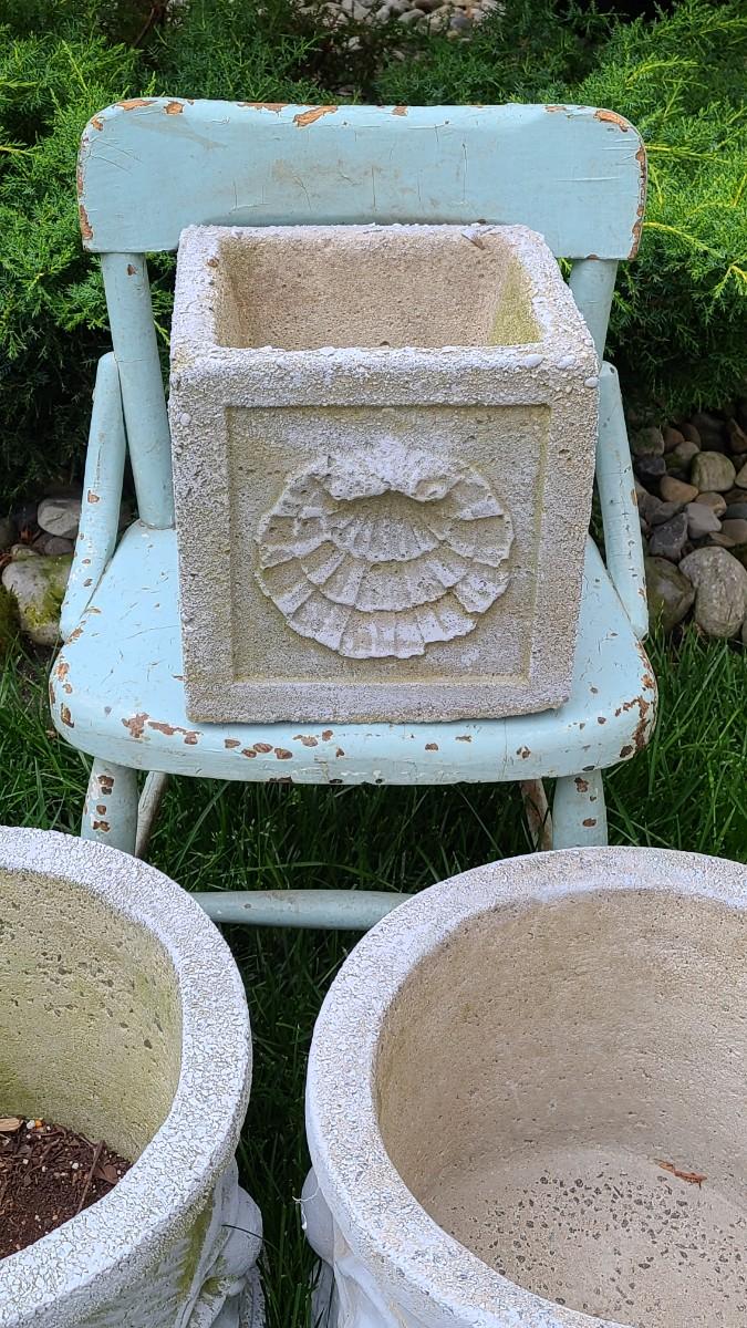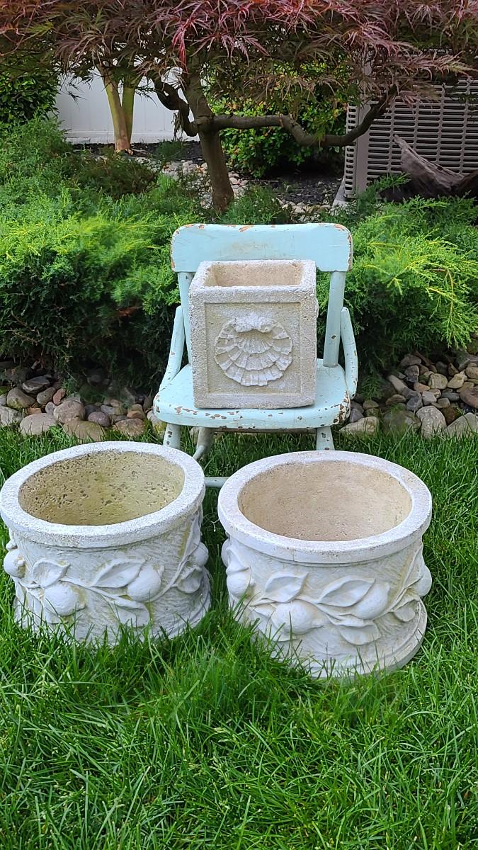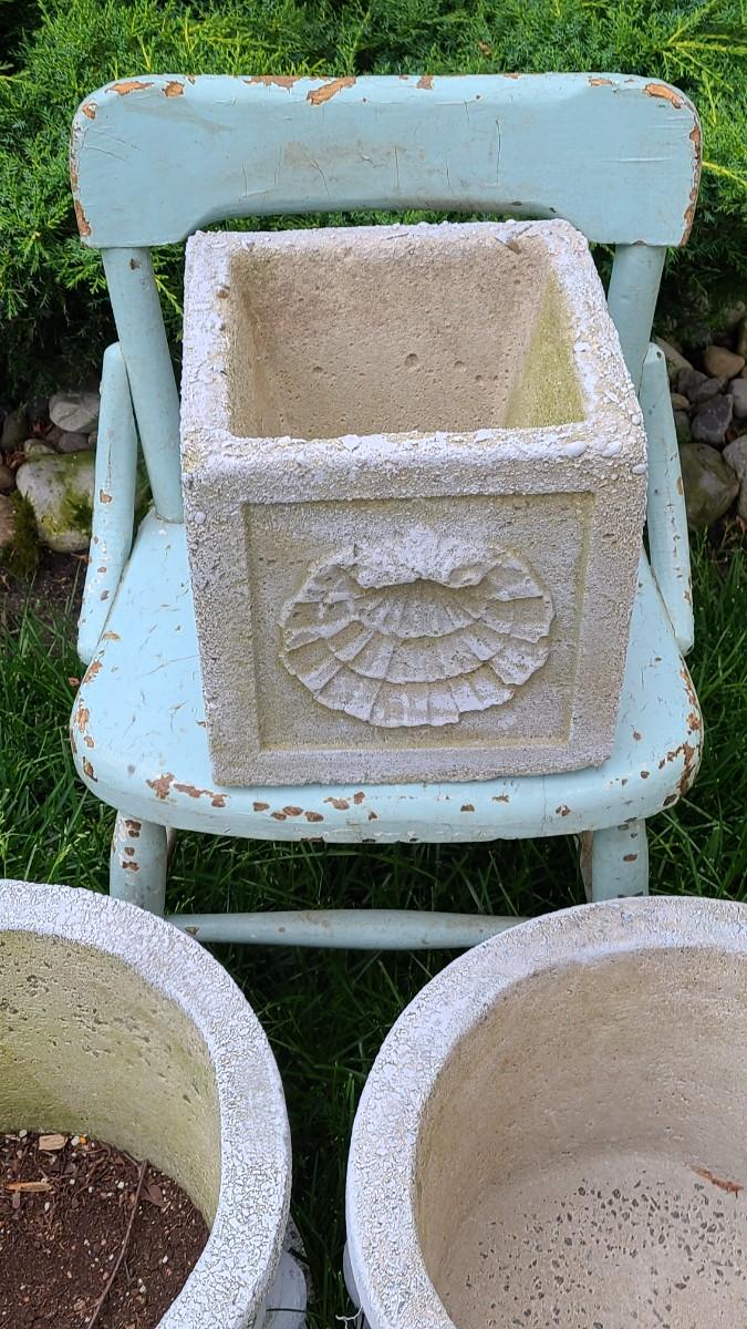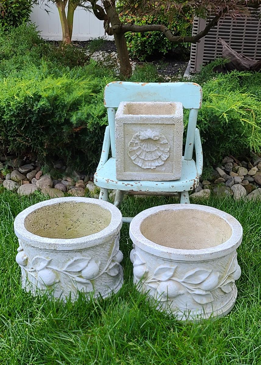 2 matching concrete planters, small shell concrete planter and blue chair used on porch. Great for yard decor! Please see all pictures for content of the lot, condition of the lot, and measurements if taken. Pictures are the best representation of the items listed and items are untested unless indicated in description. Thank you for looking and have fun bidding!