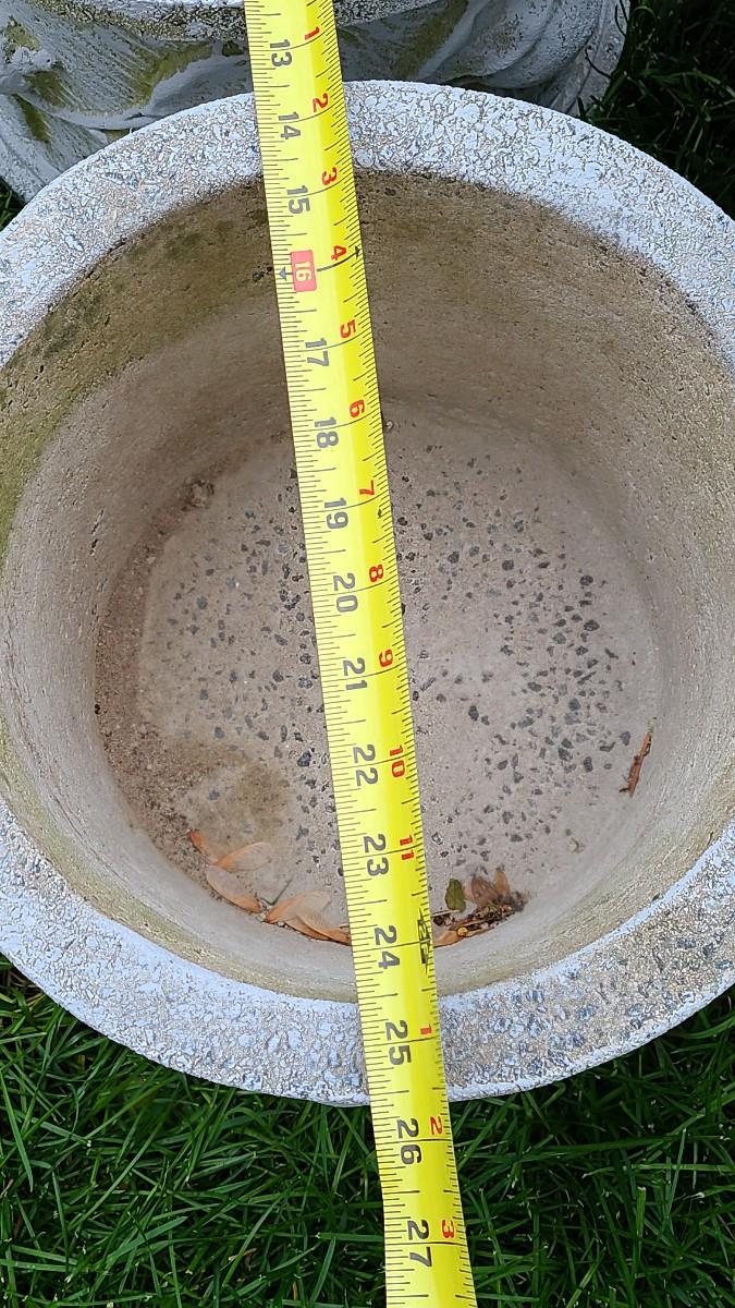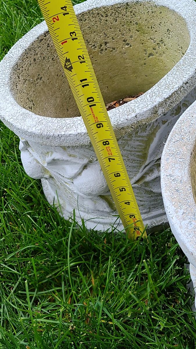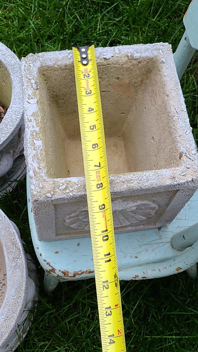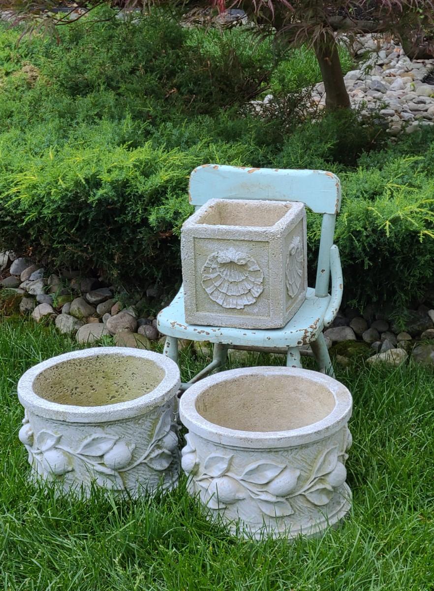 2 matching concrete planters, small shell concrete planter and blue chair used on porch. Great for yard decor! Please see all pictures for content of the lot, condition of the lot, and measurements if taken. Pictures are the best representation of the items listed and items are untested unless indicated in description. Thank you for looking and have fun bidding!