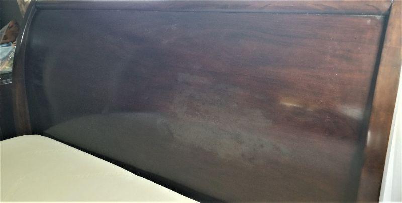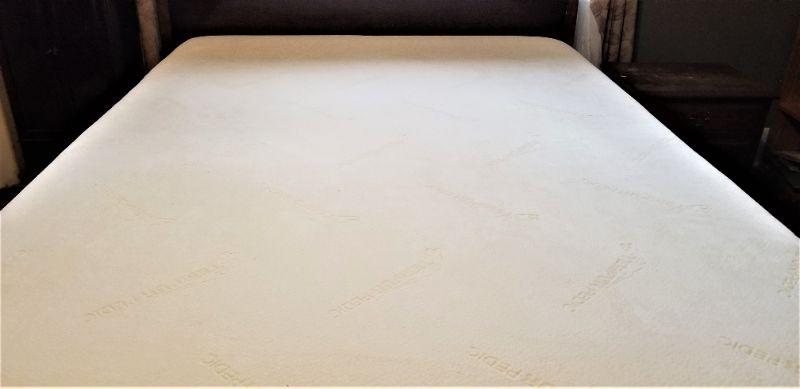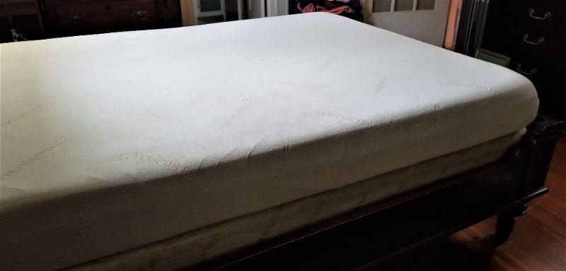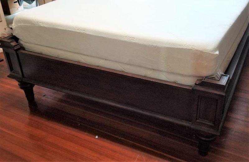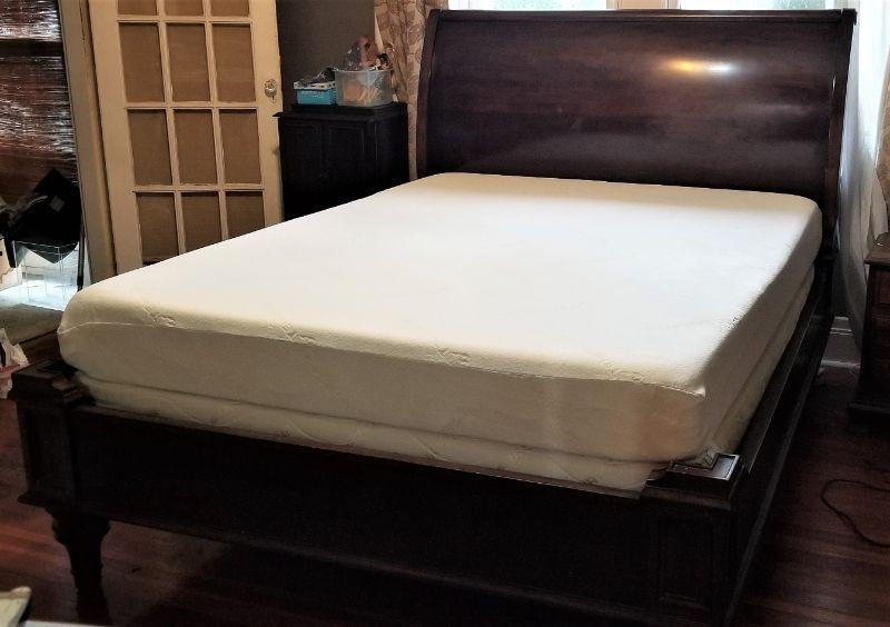 Classic contemporary sleigh bed with queen sized Tempur-Pedic mattress. Nice and comfy. Mattress cover very clean. Headboard finish "rubbed" a bit in one spot. Measures 66.5" wide, 86.5" long, 54" tall. No maker's mark on the bed. This is a tremendous value if you are looking for a second home or guest room bed. You have to be prepared to move it yourself.