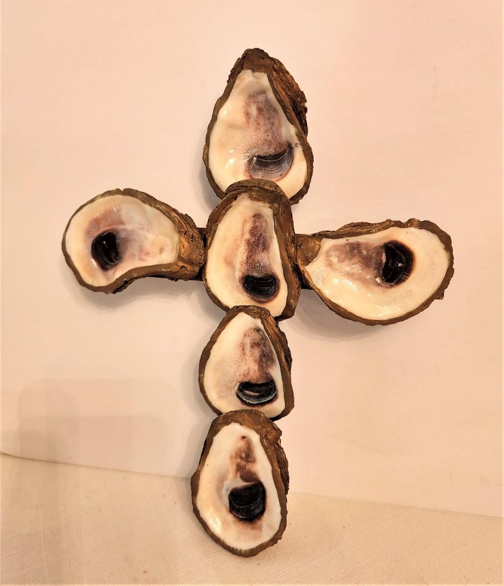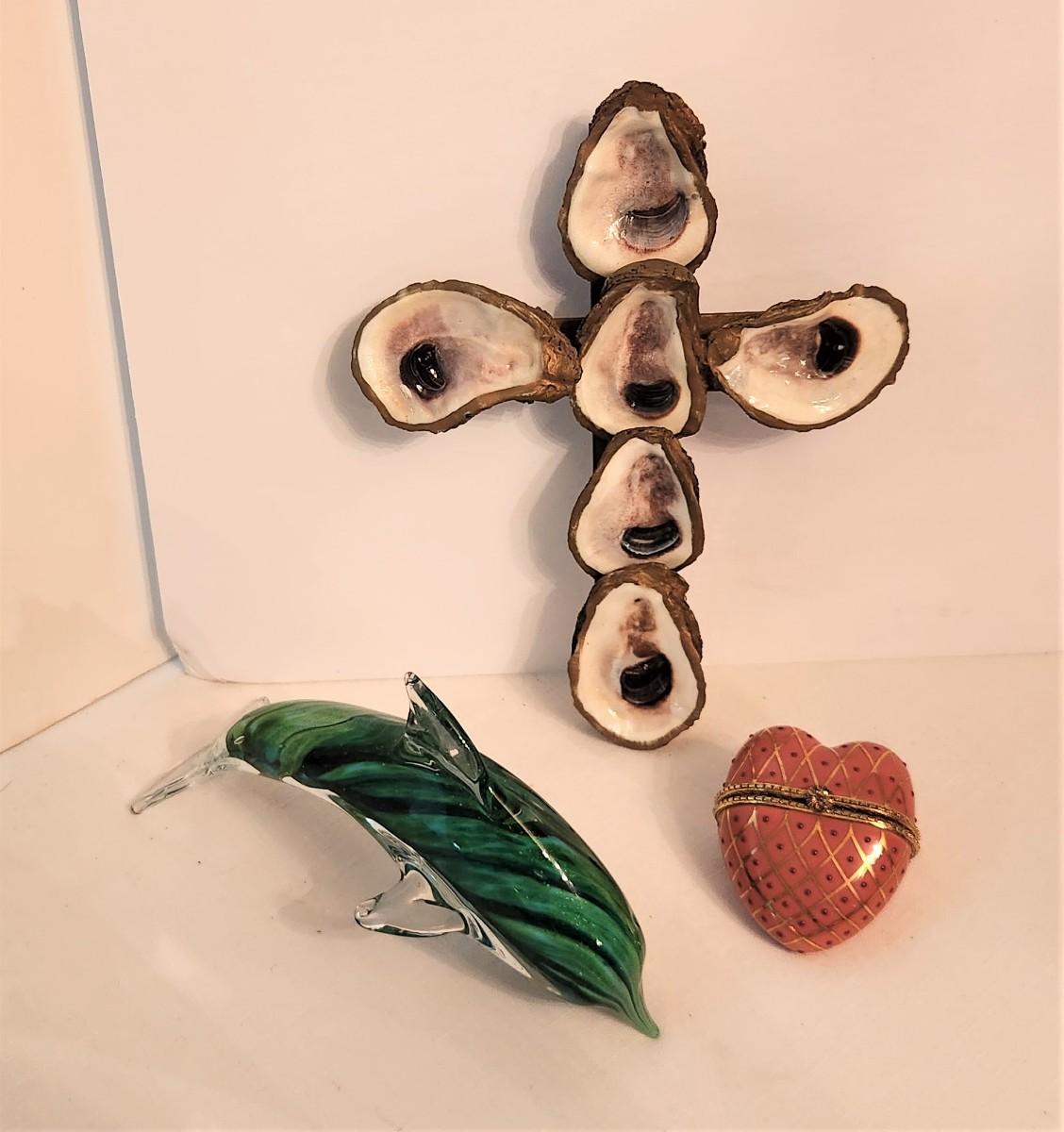 You get all you see here - oyster cross (9.5" tall, 8" across), art glass dolphin (8" across), and Hinged trinket box in the shape of a heart. All in good condition.
