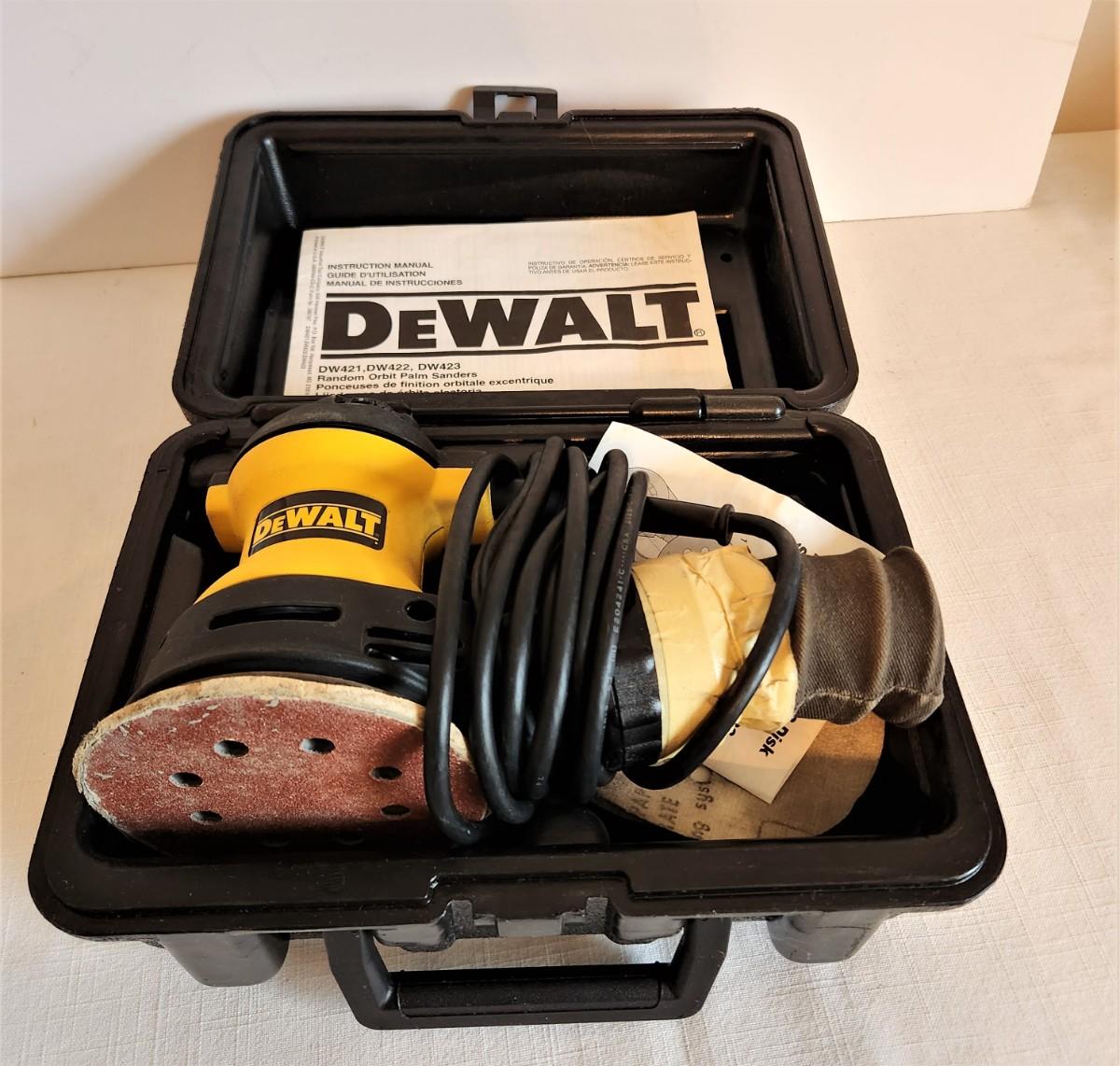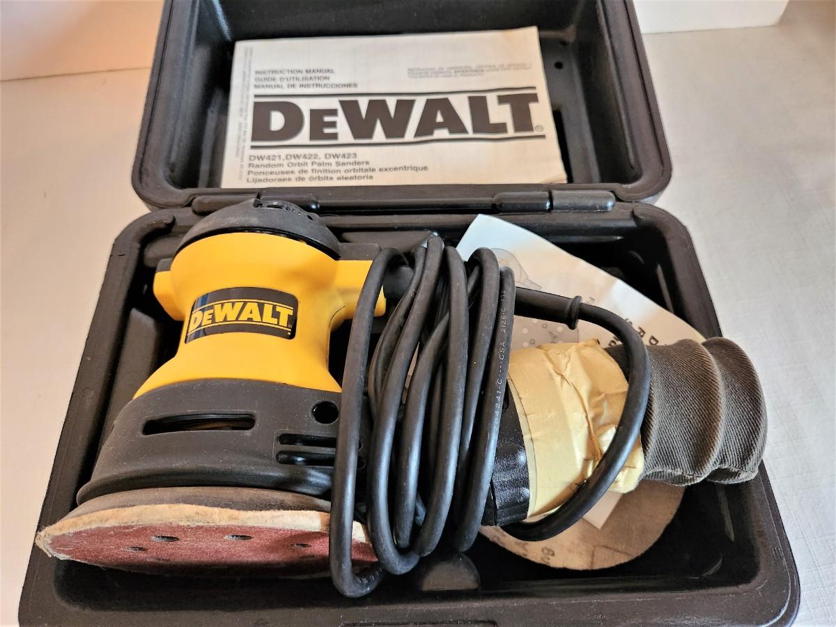 DEWALT Random Orbit Palm Sander in case - good used condition. Note tape around the connection - works, but there may be a small hole.