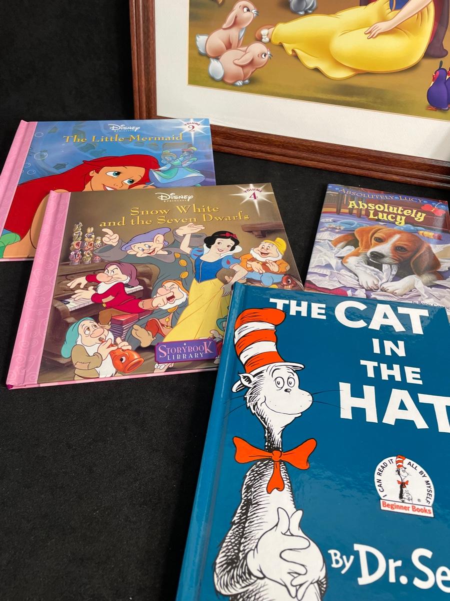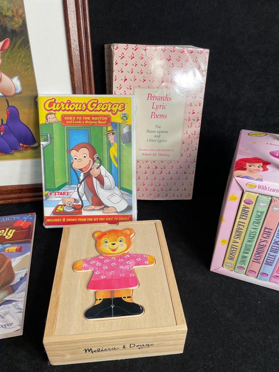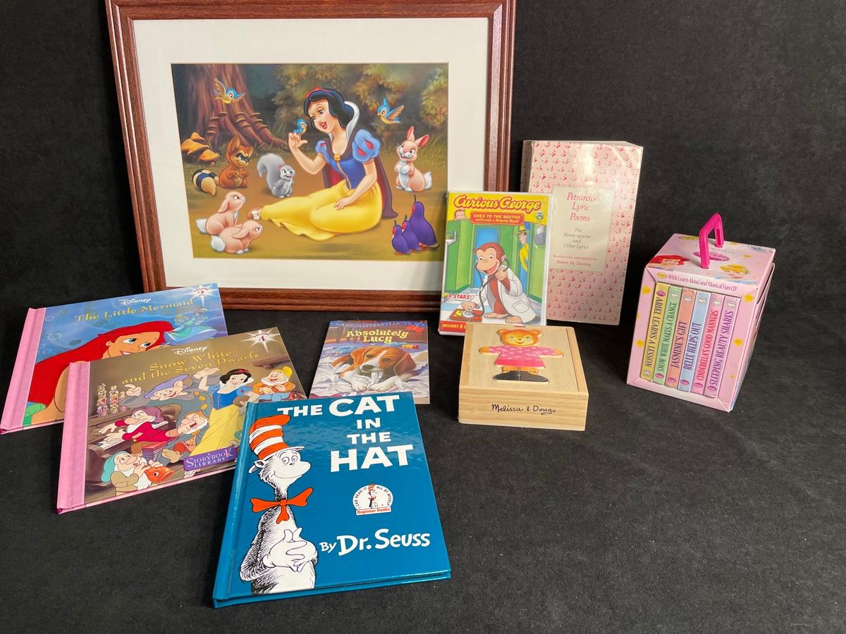 Assortment of Disney items including books a framed print of Snow white, and a Melissa and Doug puzzle in a box