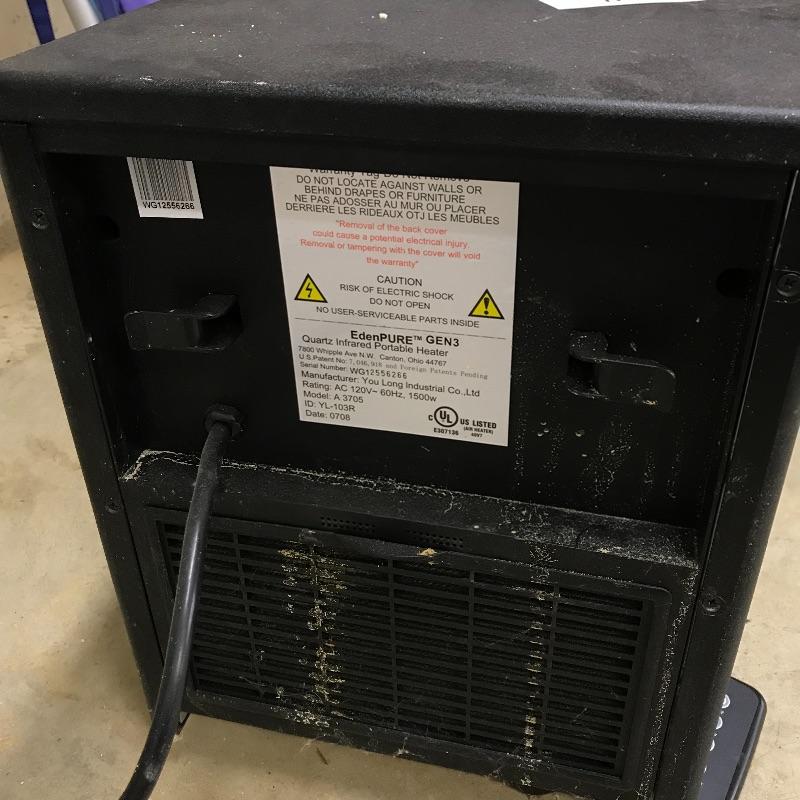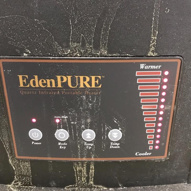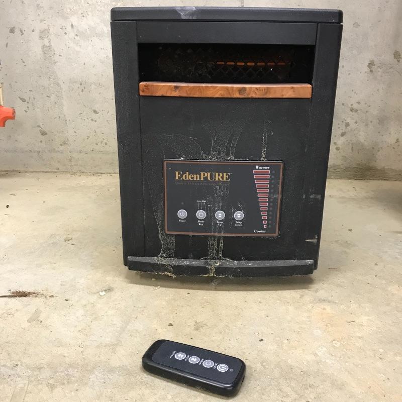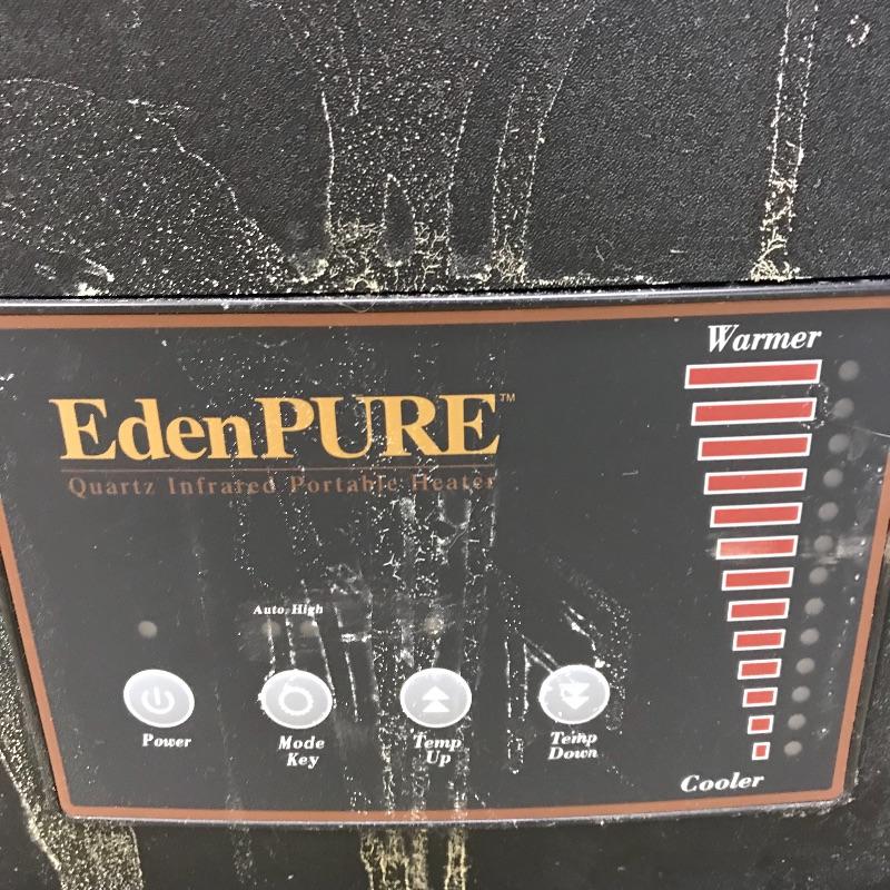 Keep warm with this EdenPURE Quartz Infared Portable Heater complete with working remote control. Heater worked nicely in the few minutes it was plugged in and turned on. Heater omitted a smell of a heater that hasn’t been turned on in a while. Piece appears to have some copper near the vent and shows a little oxidation, see photos. No shipping.
