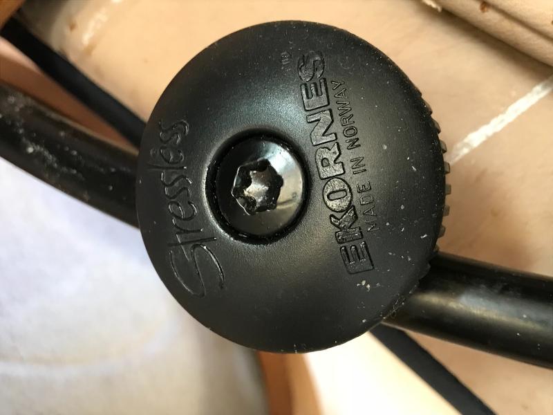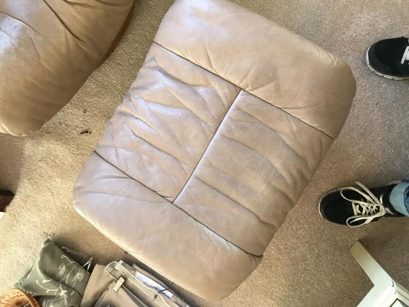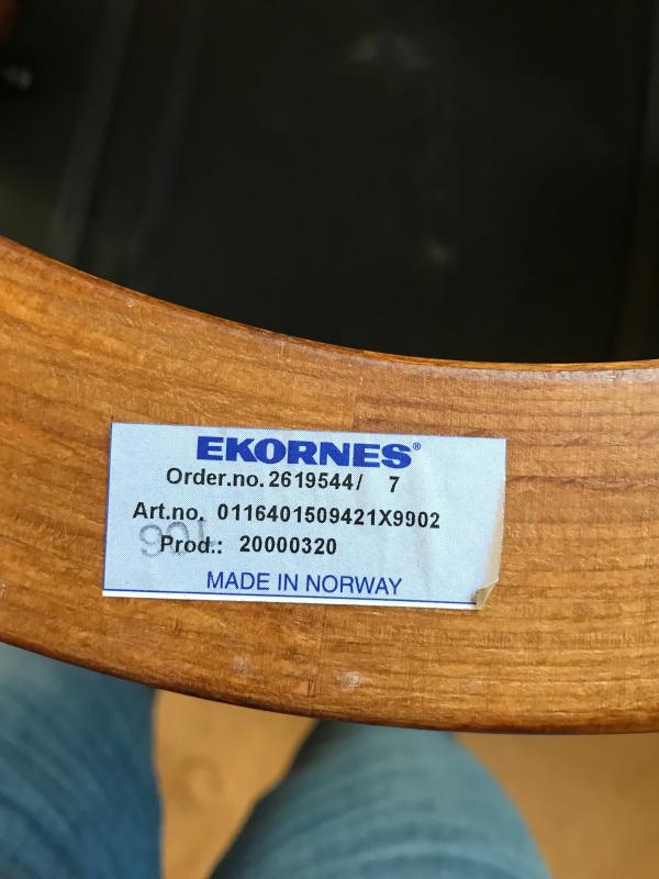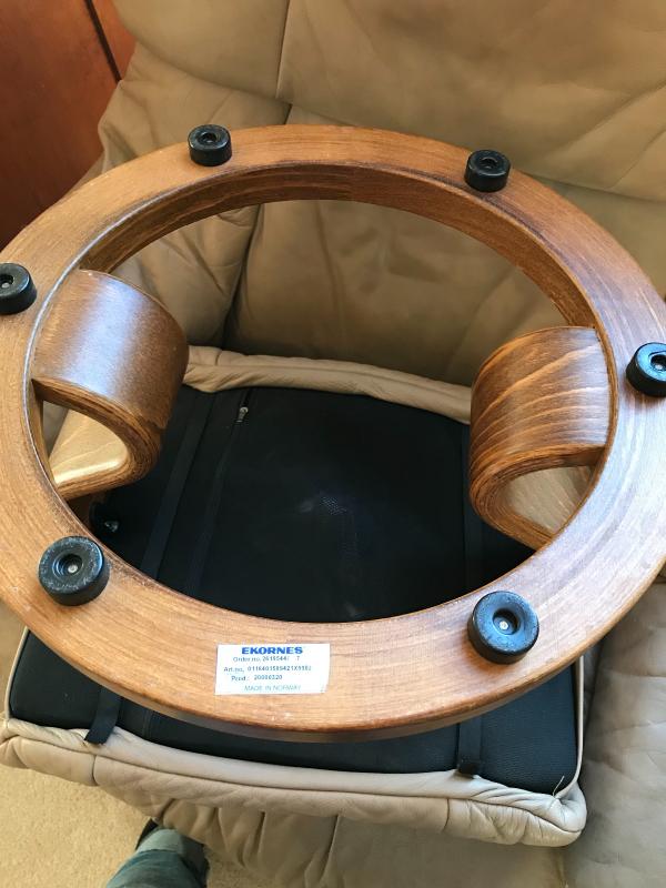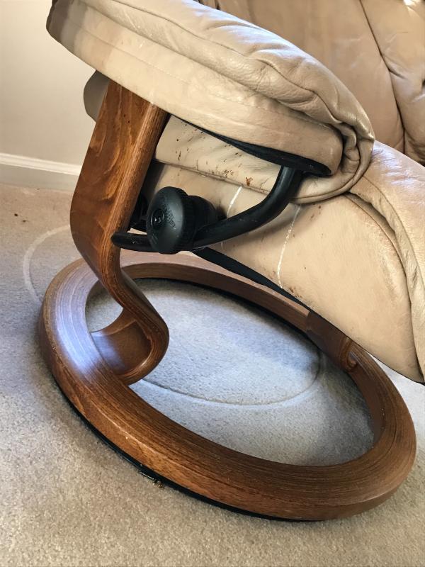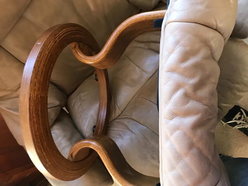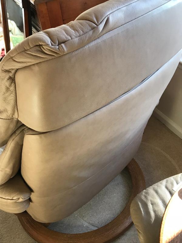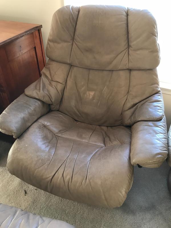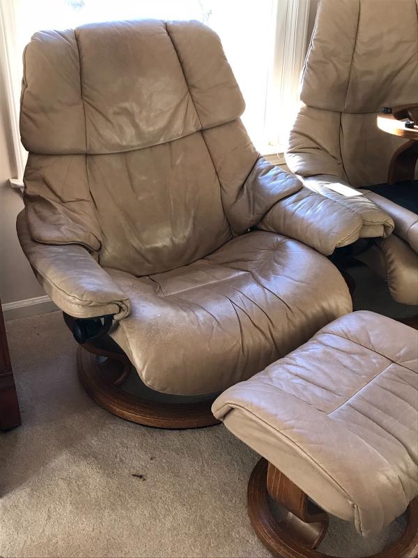 Ekornes chairs are super high quality and made in Norway. Made of soft leather, it both reclines and swivels. This is one of two for sale, and larger than the other, at 35” wide x 31” deep x 39” tall.. The other is in lot 117. Comes with footrest in same style.