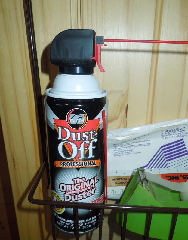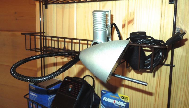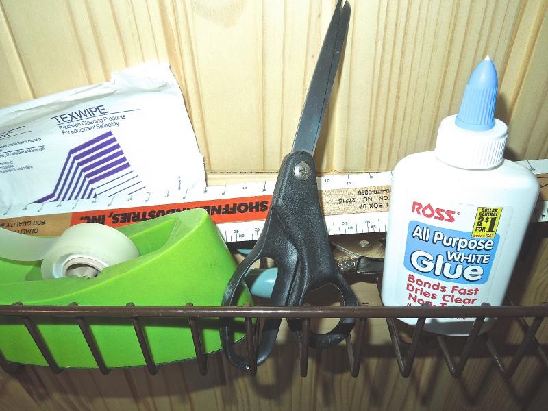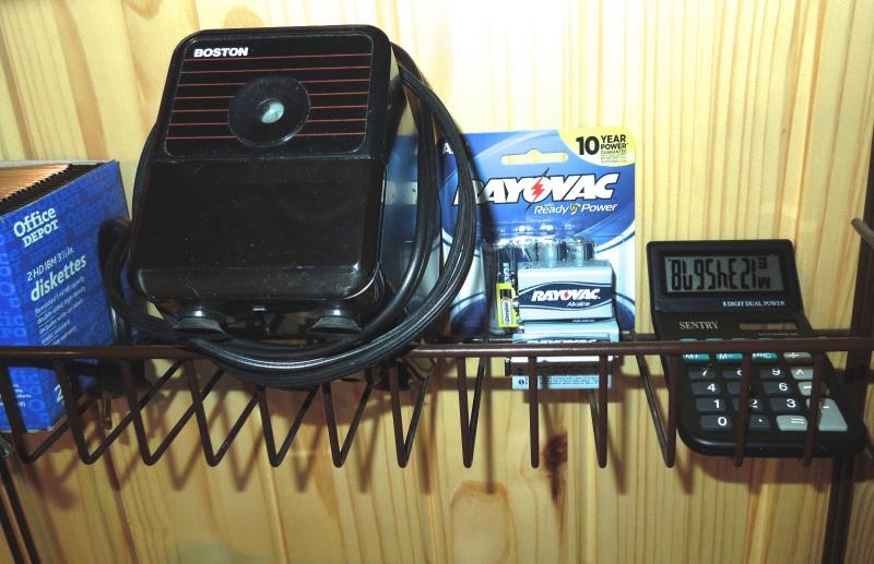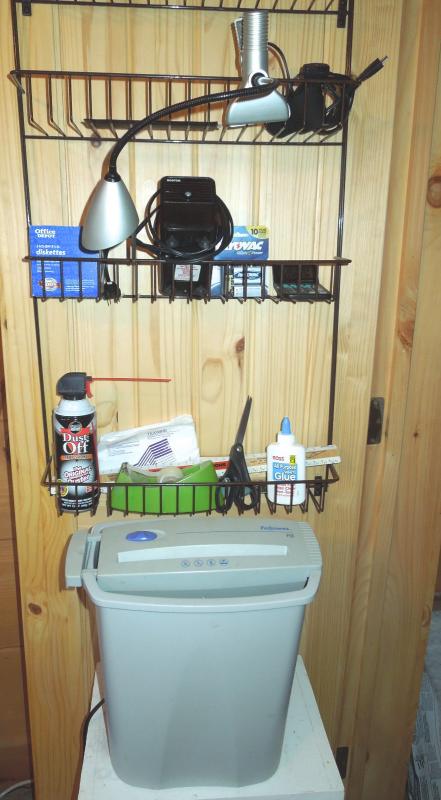 Fellowes Paper Shredder; Goose Neck Clipon Lamp; Bostitch Pencil Sharpener; Tape Dispenser; 21 Floppy Disks; Power Strip; Calculator; AA and 9 volt batteries; Scissors; Ruler; Hole Punch; Glue; Dust Off canned air; Security Lock; Key Ring. Does not include hanging shelf.