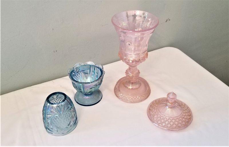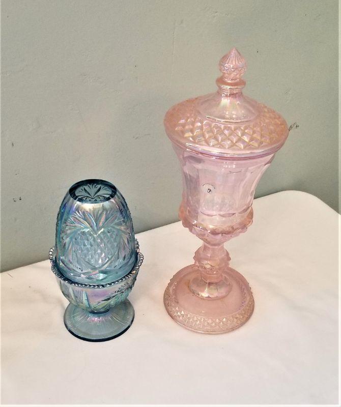 Two nice pieces of FENTON glass - lidded compote and blue fairy light. Both have labels - good condition. Compote is 13" tall - fairy lamp is 7" tall.