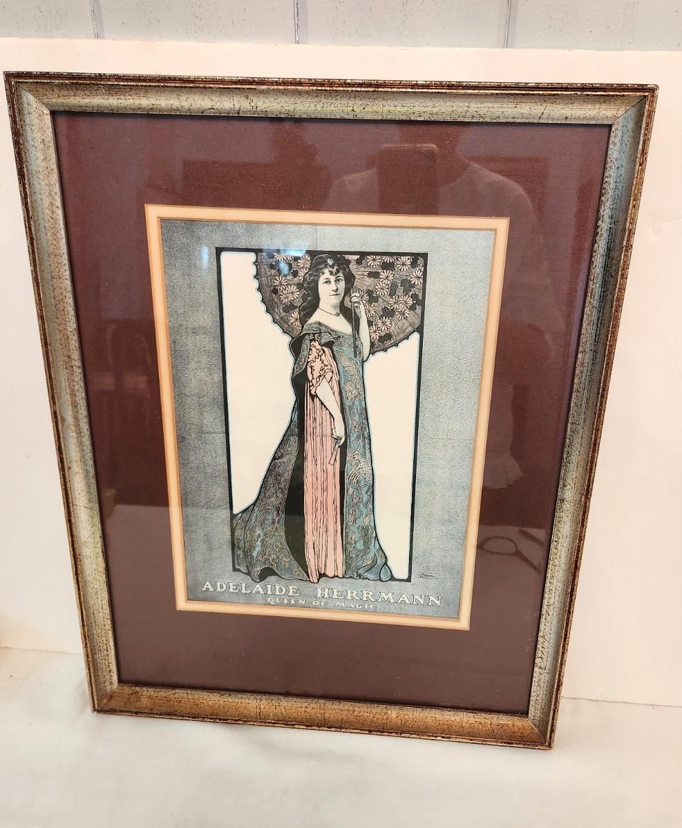 Framed print, double matted - Adelaide Hermann, known as the Queen of Magic. She was a well known English magician and vaudeville performer (1853-1932). She was one of the few magicians to perform the dangerous "bullet catch" trick, and probably the only female magician to ever attempt it at the time. She led a fascinating life - read about her on Google! Good condition, 15.5" x 19.25".
