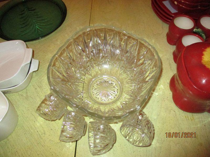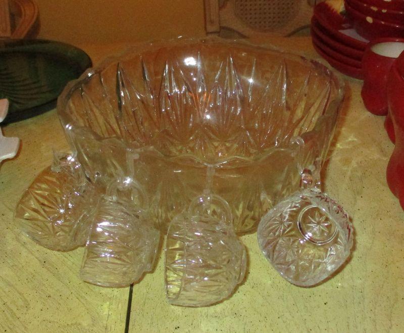 This set was made by Hazel Atlas and is called Williamsport. I couldn't find a date range of manufacture, but I'm pretty sure that it's in the 1960's-1980's range. This lot has a punch bowl, 4 cups, 4 plastic hooks, and a plastic ladle. All are in excellent condition.