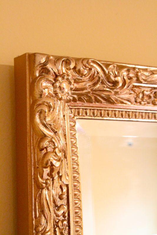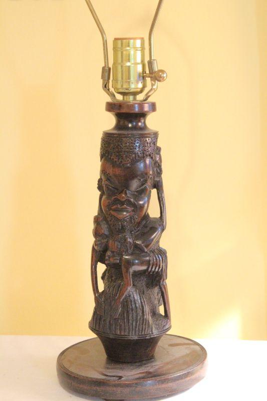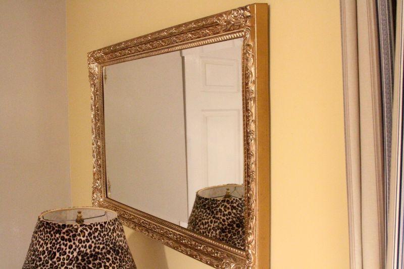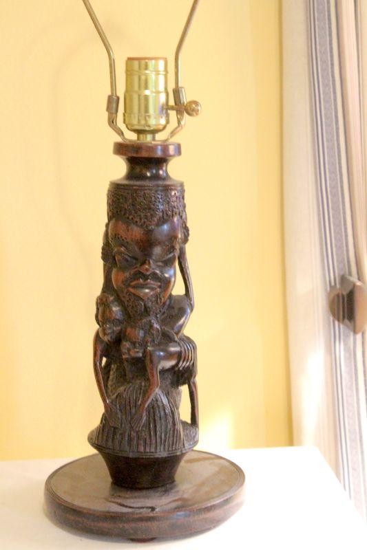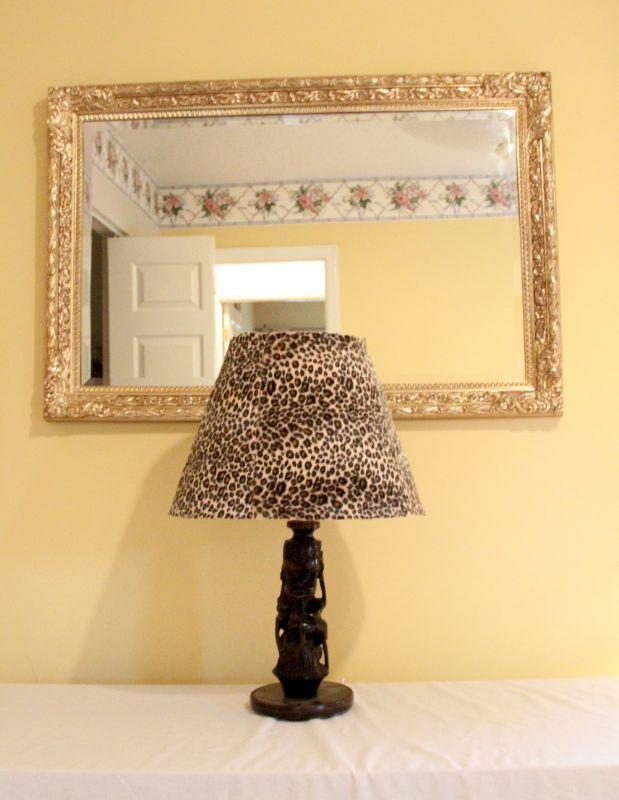 Mirror is plastic gold molded reproduction Hollywood regency glamor frame. No cracks in frame or mirror. Dimensions 36" w x 24" h. Carved ebony wood African base lamp of male diety or warrior. Leopard skin faux fur lampshade. Fabric is glued over another shade and is loose around top. Lamp works.