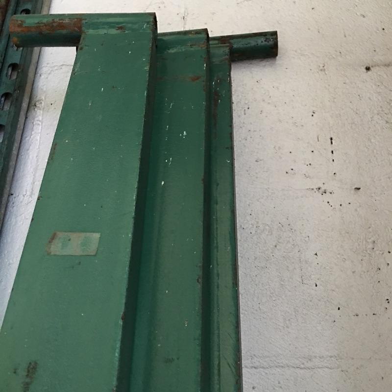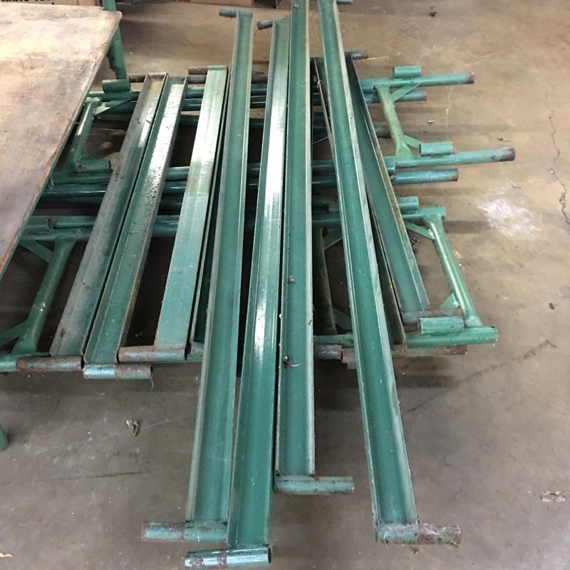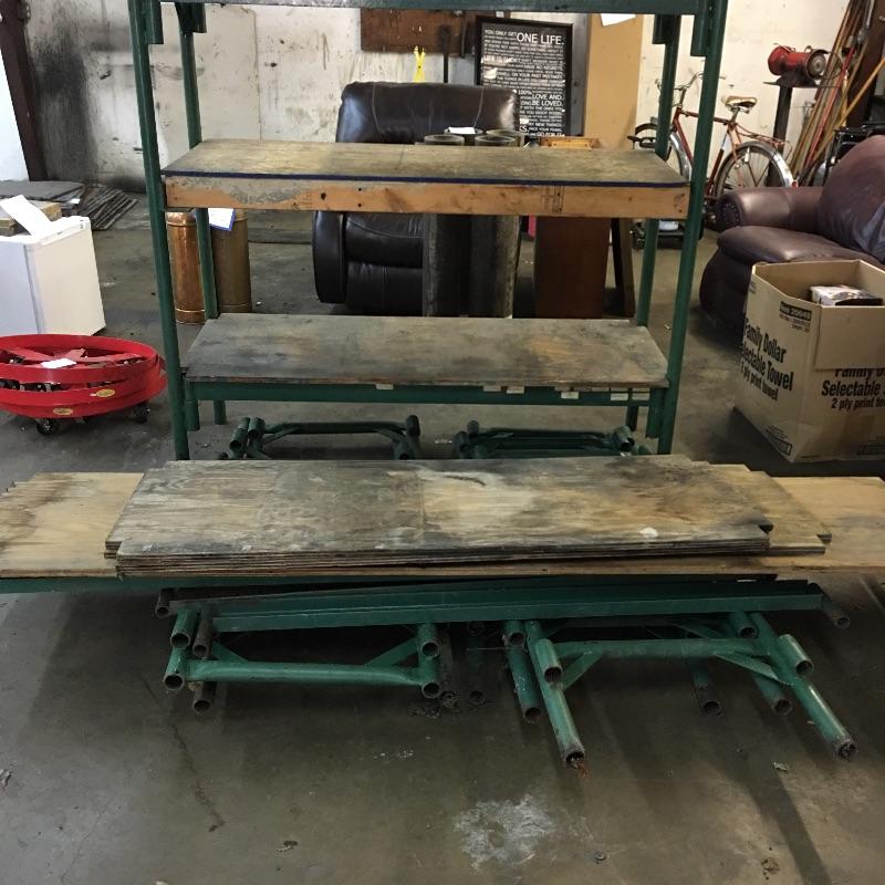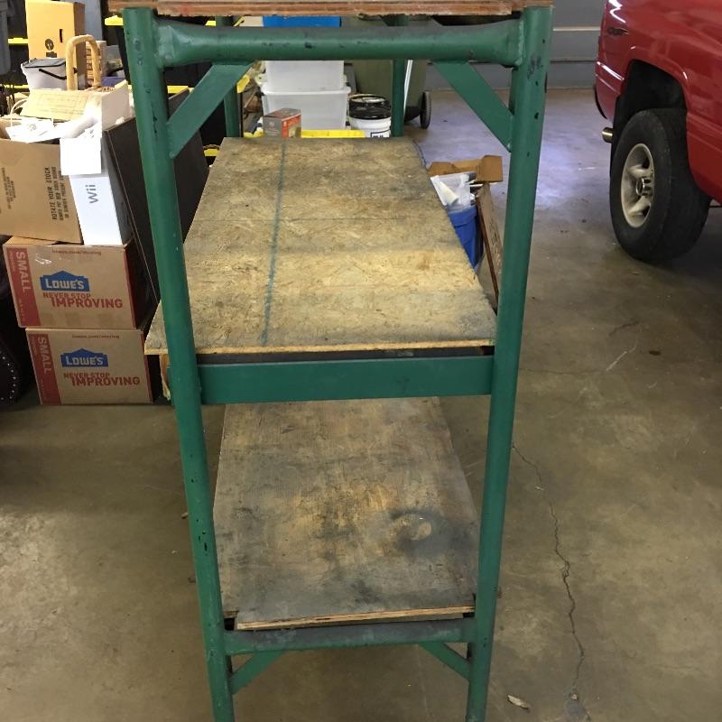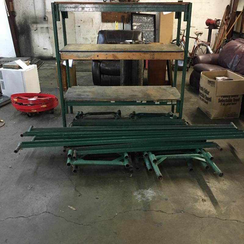 Two large green industrial shelves that are together and another batch of components to make more shelving units. Steel shelving units with three wooden shelves. These shelves will be great for storing heavy and large items and they come apart for transporting. Largest assembled shelf measures 22.5” x 60” x 85” and smaller assembled shelf measures 22.5” x 61.5” x 60”. Longest piece not assembled measures 93”, see pictures. Contents of shelves not included.