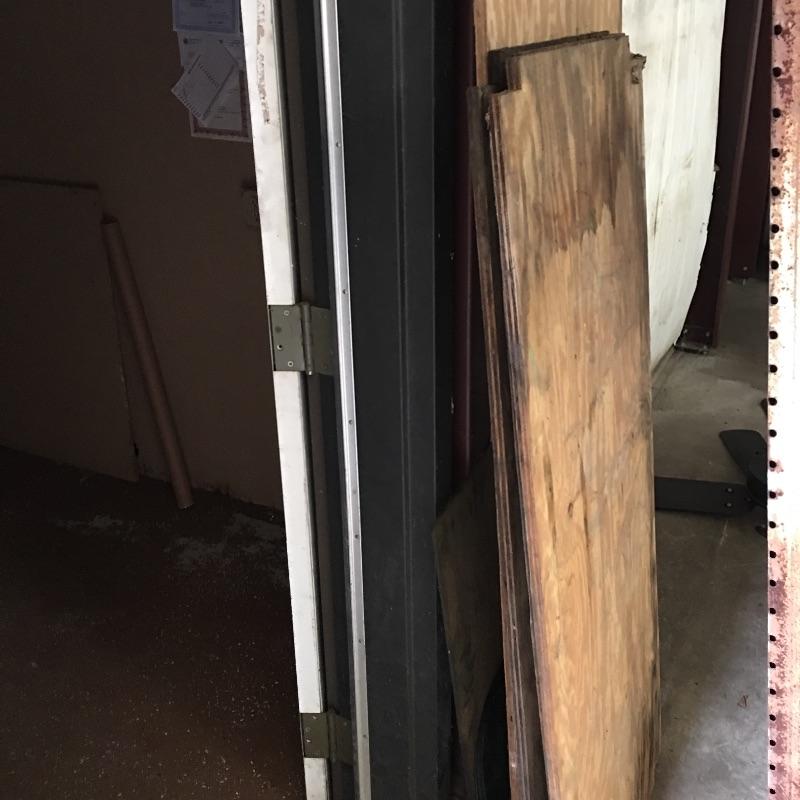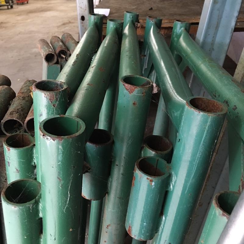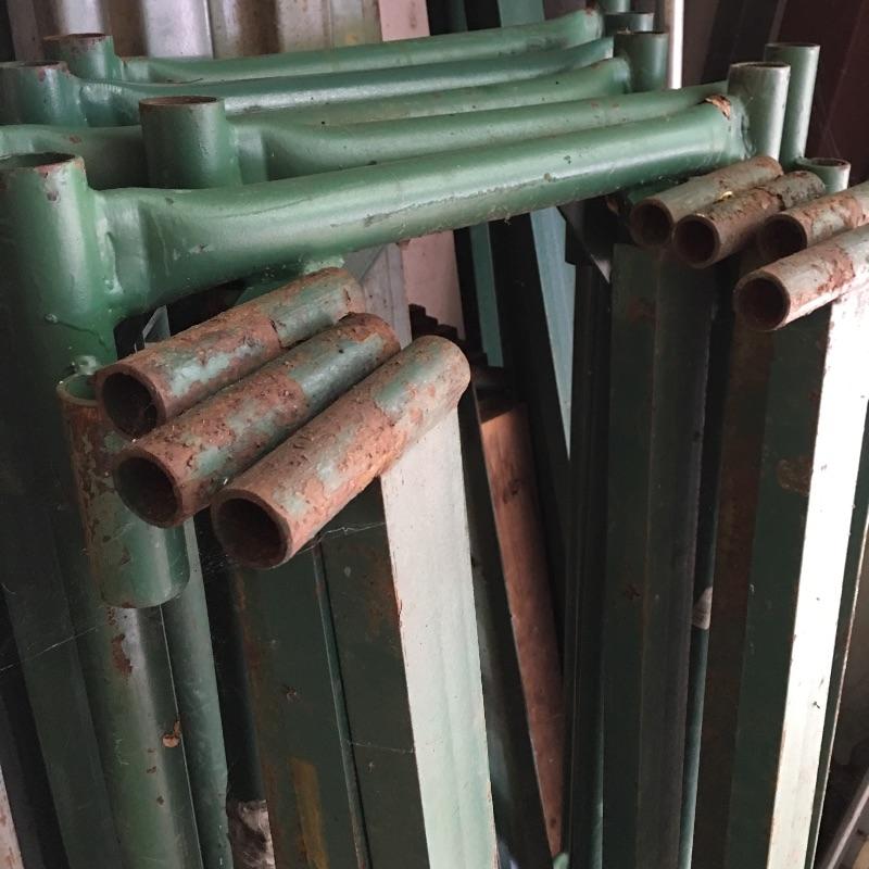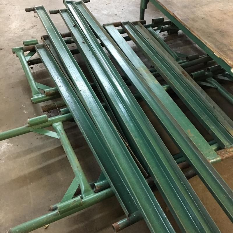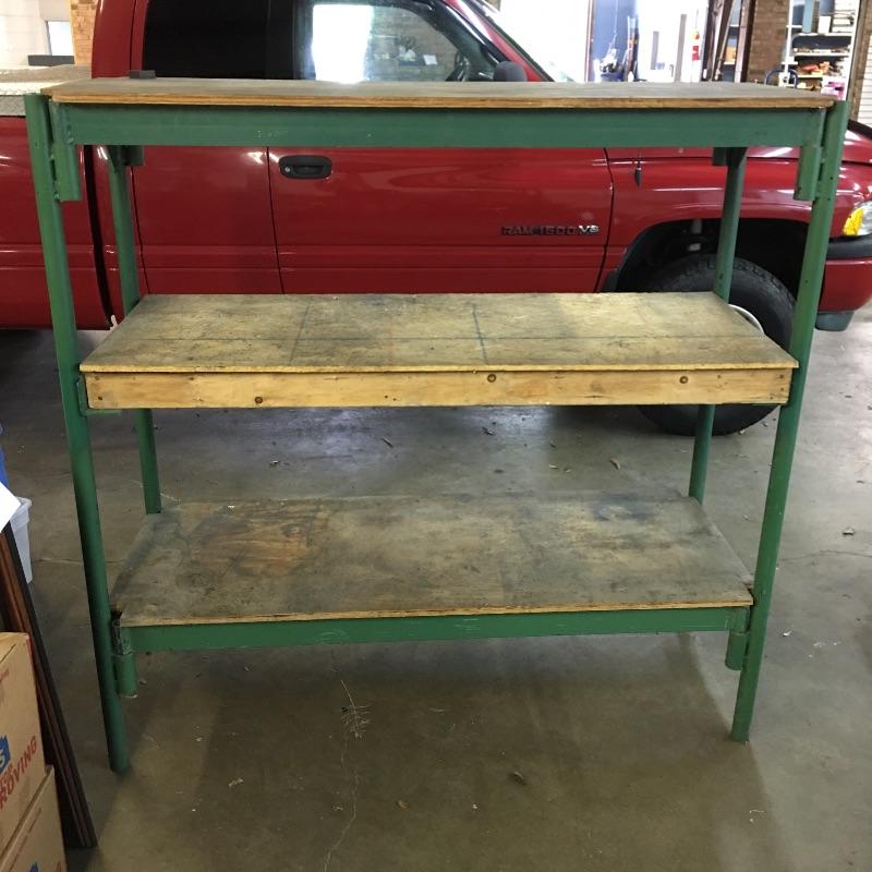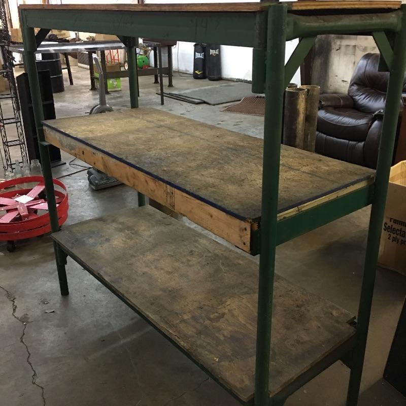 Two large green industrial shelves that are together and another batch of components to make more shelving units. Steel shelving units with three wooden shelves. These shelves will be great for storing heavy and large items and they come apart for transporting. Largest assembled shelf measures 22.5” x 60” x 85” and smaller assembled shelf measures 22.5” x 61.5” x 60”. Longest piece not assembled measures 93”, see pictures. Contents of shelves not included.