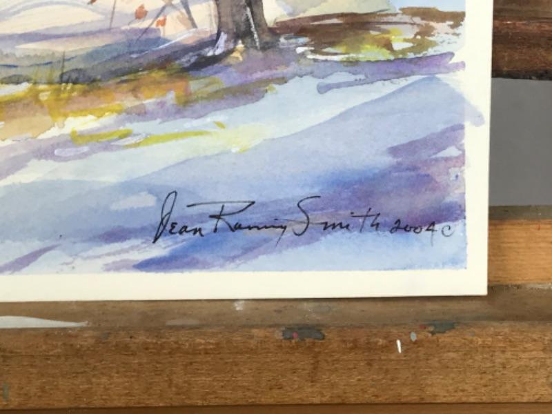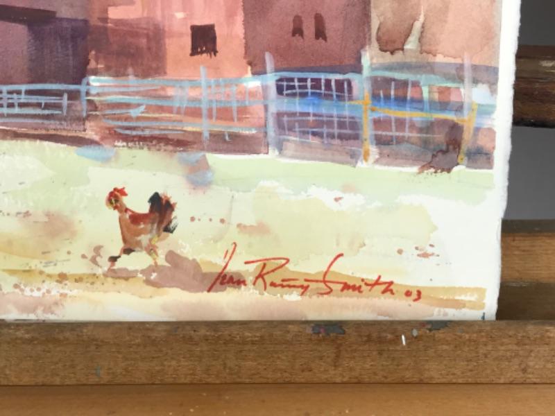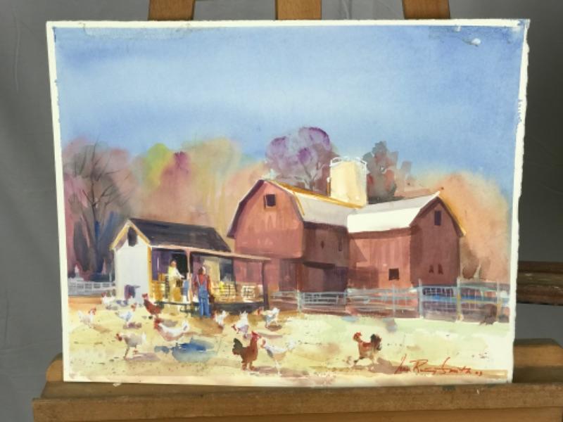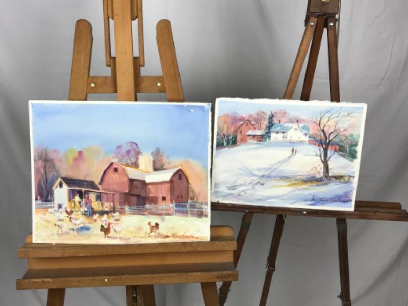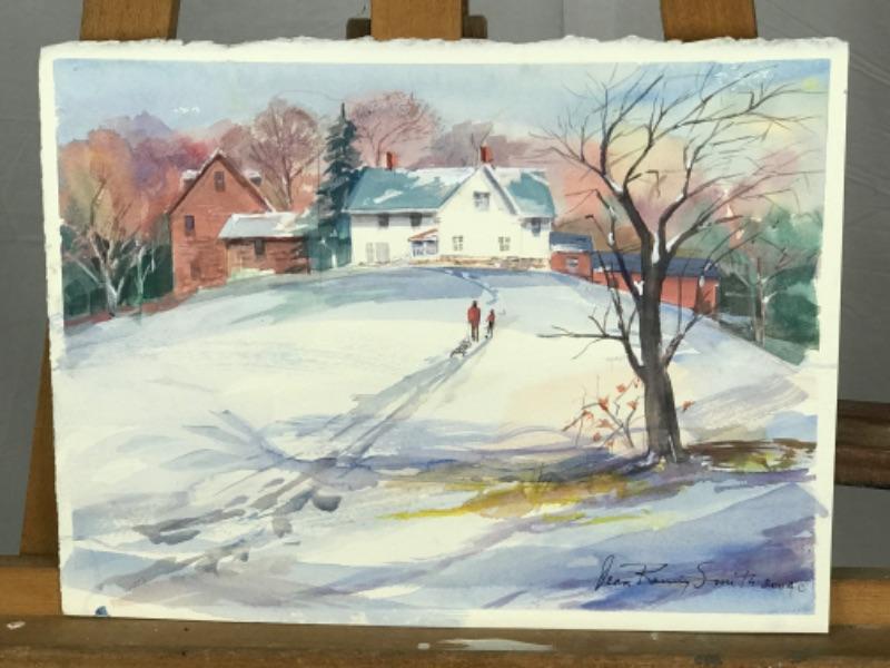 Jean Ranney Smith signed original watercolors “Feeding The Chickens” measures 19”x15” and “Sledding” measures 15”x11-1/2”