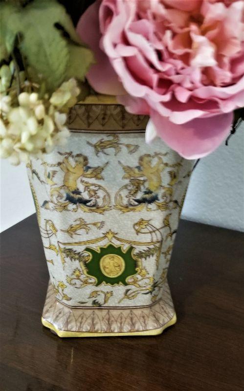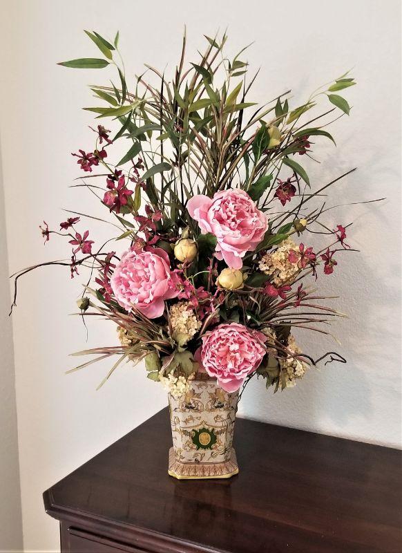 Nice silk flower arrangement in pretty container. About 33" tall. Pink/mauve colors.