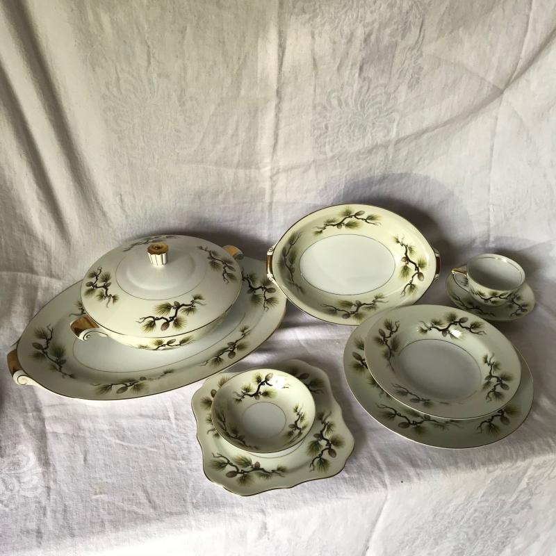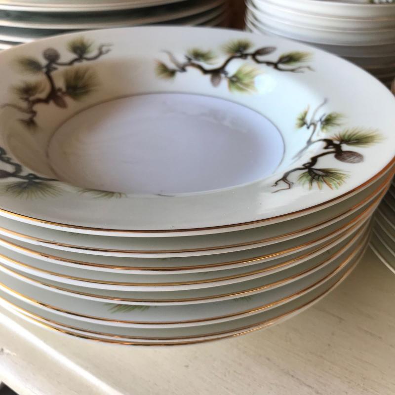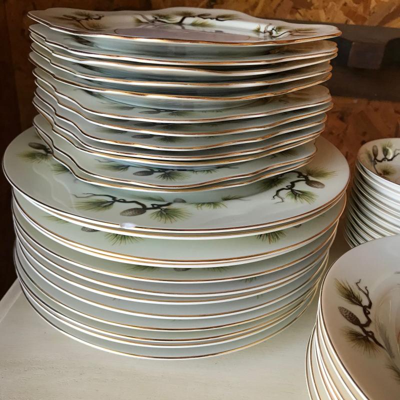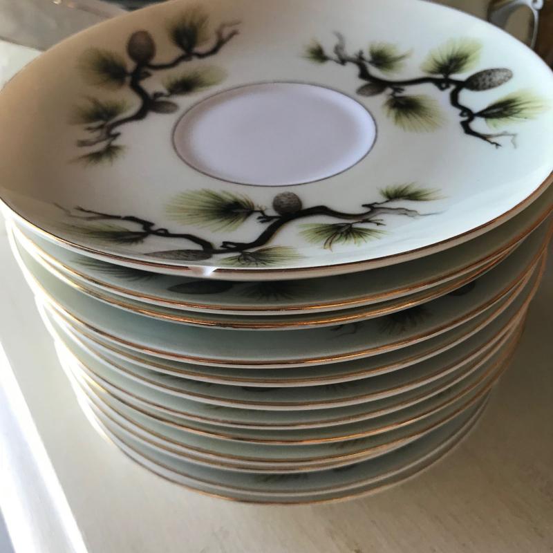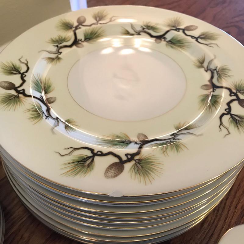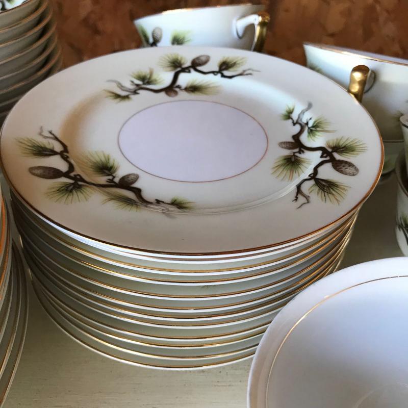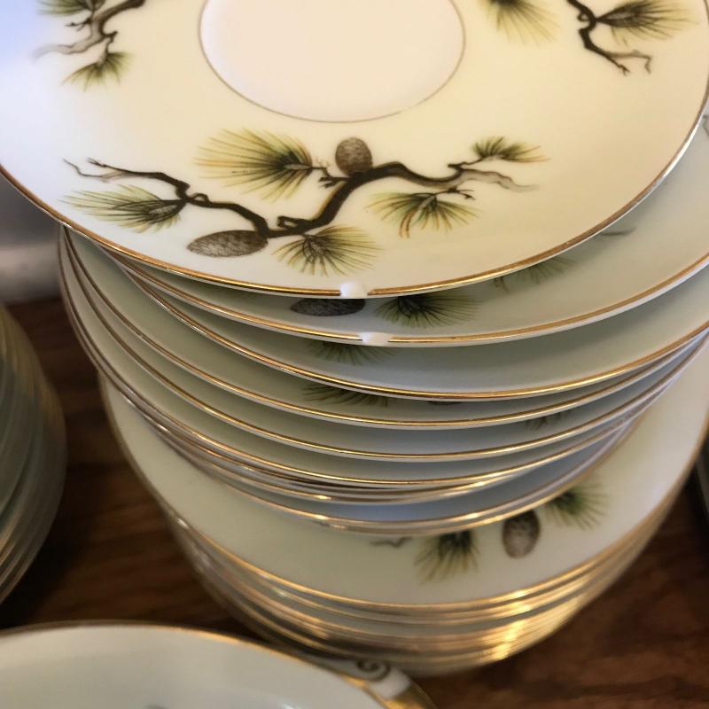 Mikes Fine China Set in Shasta Pine Pattern. Narumi Japan. Two salad plates and one dinner plate have small chip on edge. 86 pieces in total. No shipping