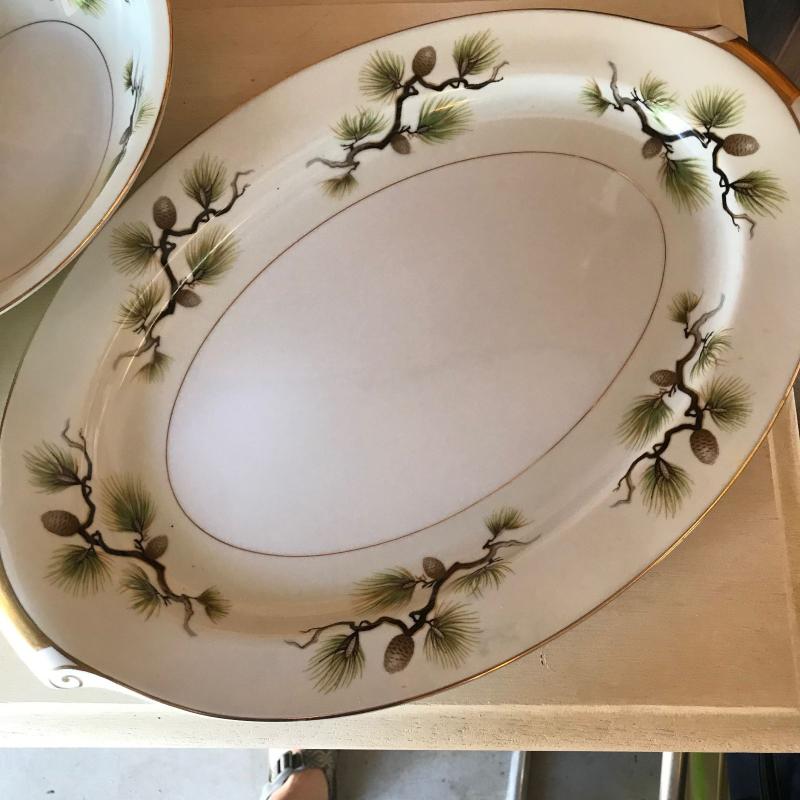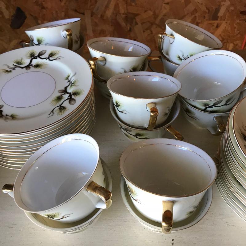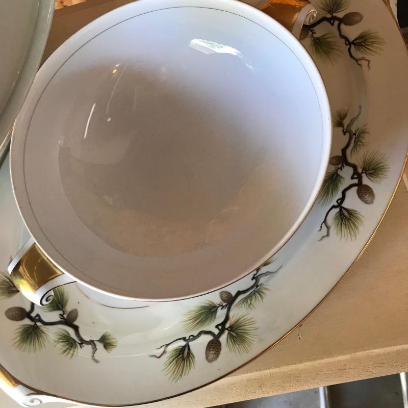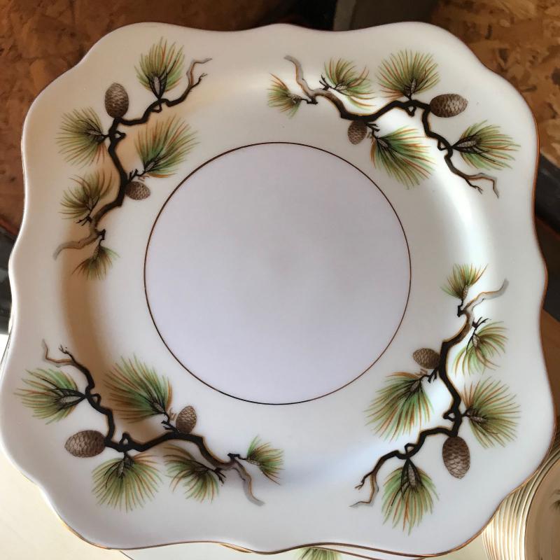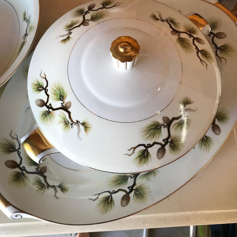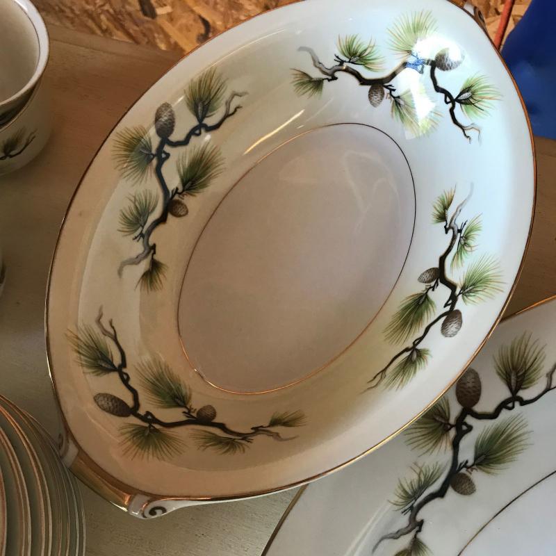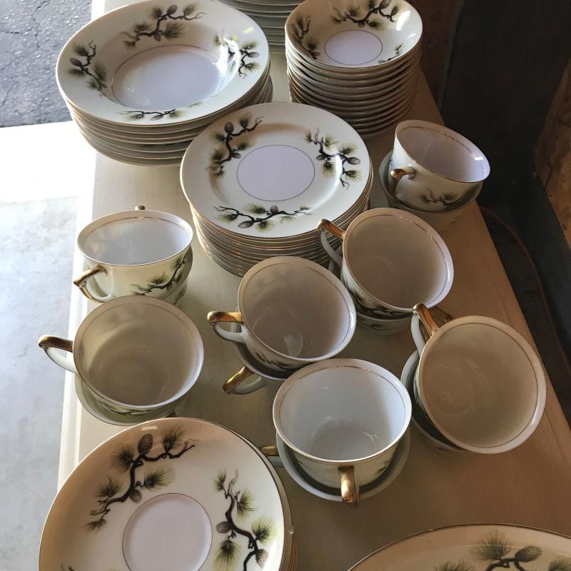 Mikes Fine China Set in Shasta Pine Pattern. Narumi Japan. Two salad plates and one dinner plate have small chip on edge. 86 pieces in total. No shipping