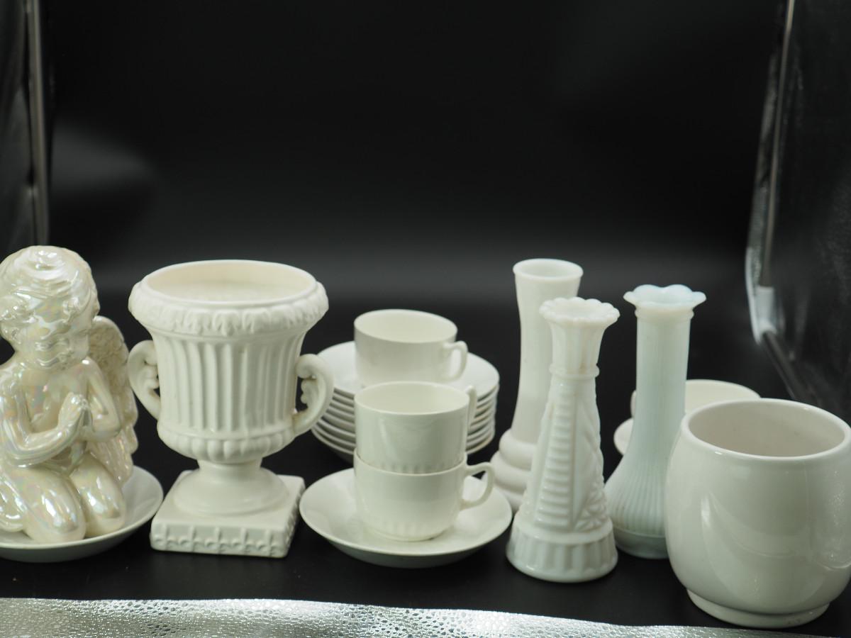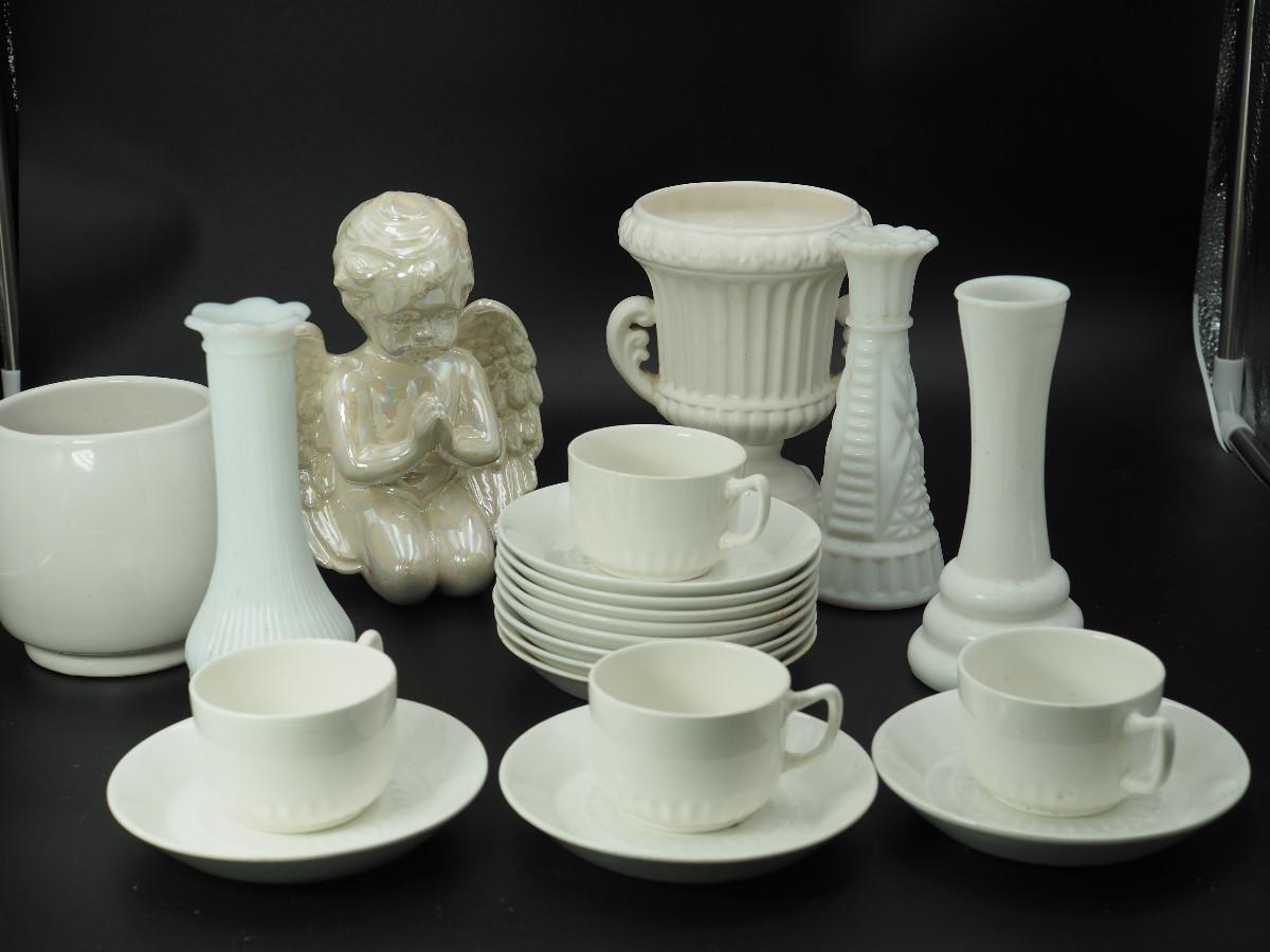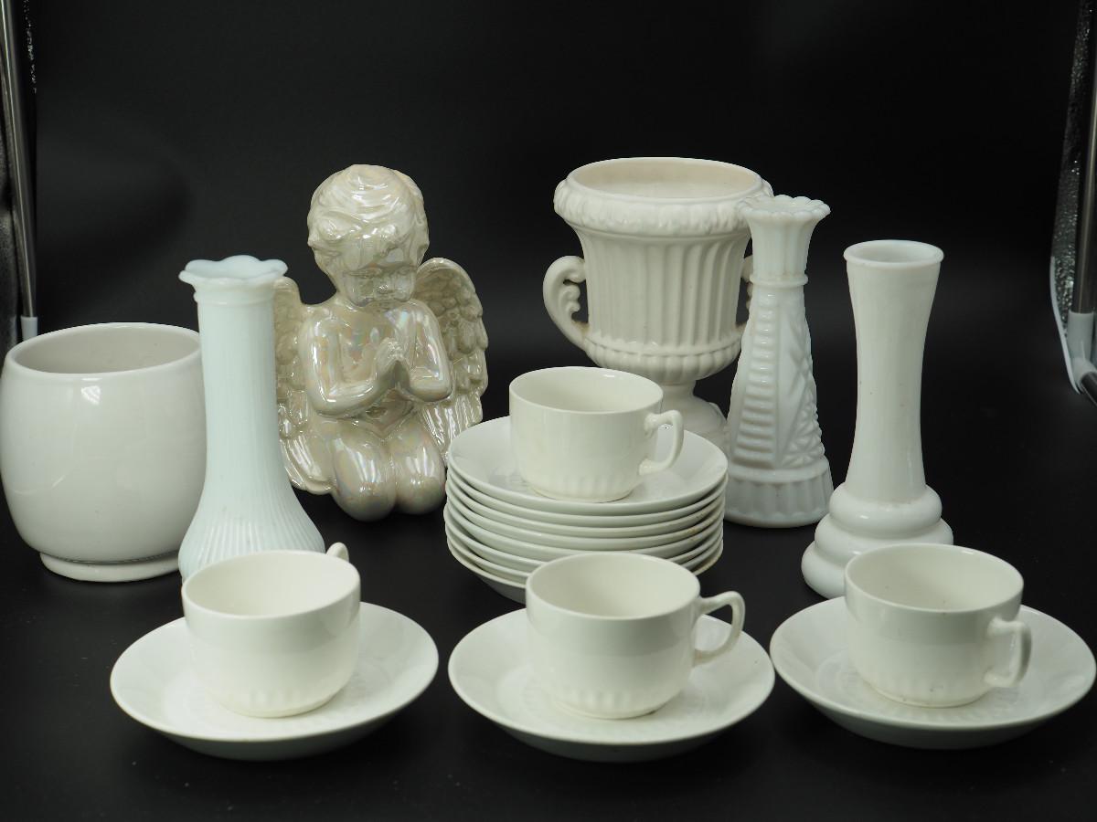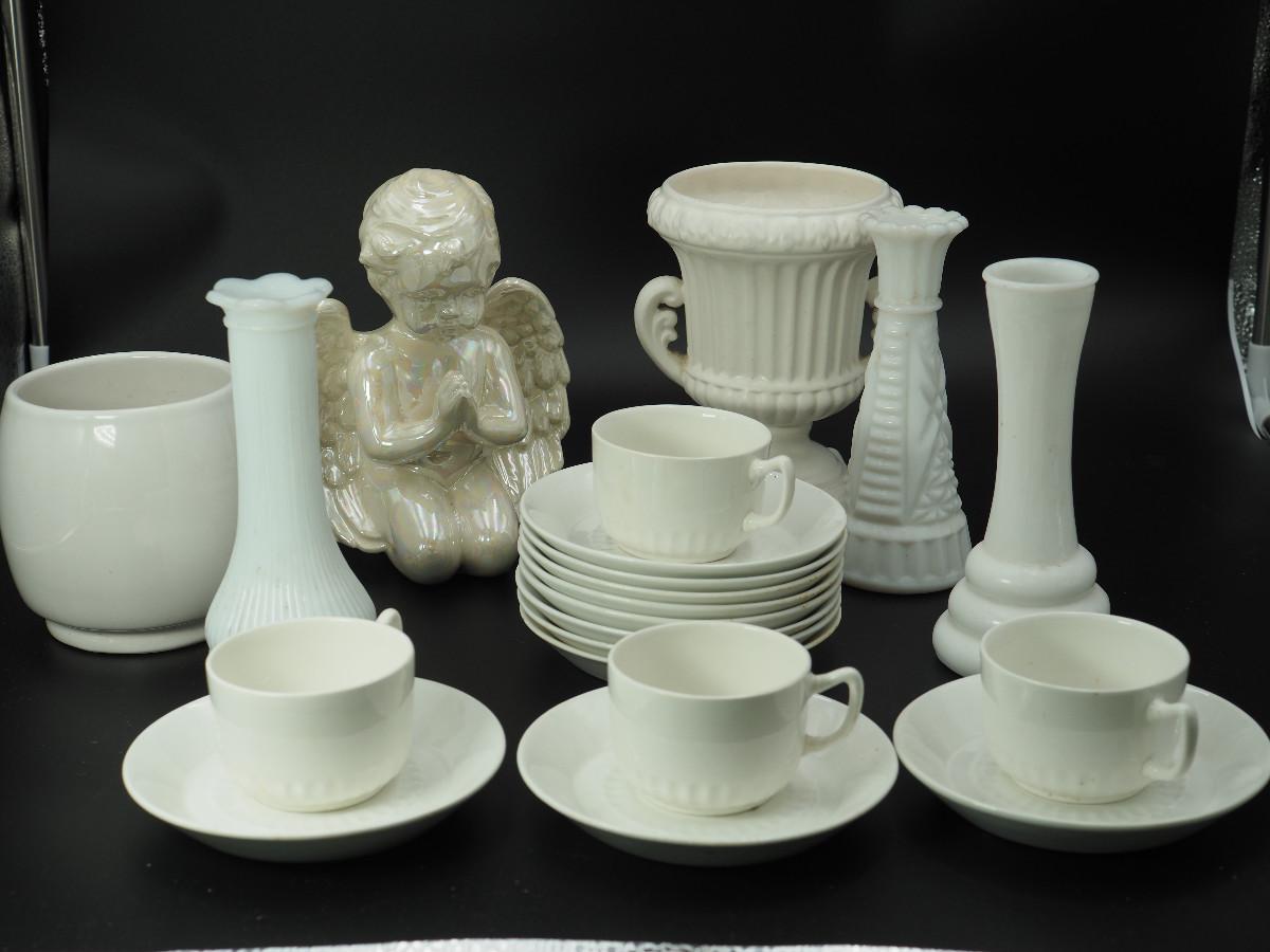 Lot 116 Milk Glass and collectibles AB glazed ceramic cherub, Milk glass vases, Velco MCM vase, English china cups and saucers.
