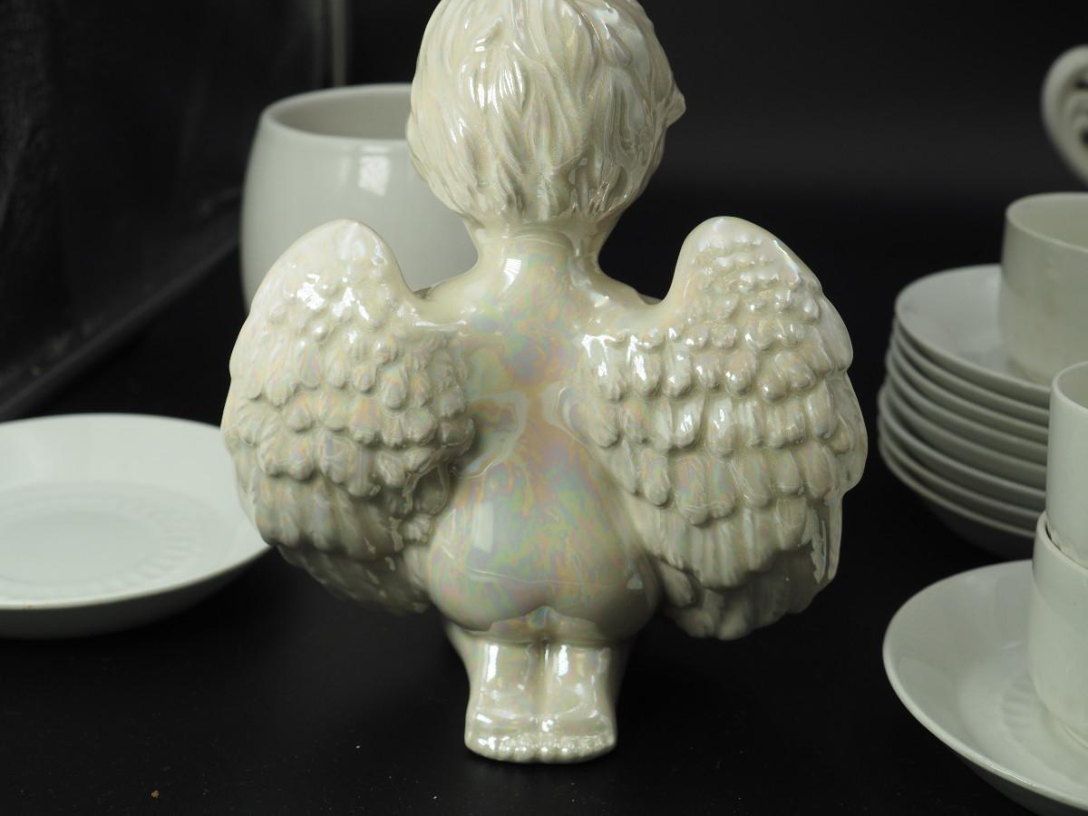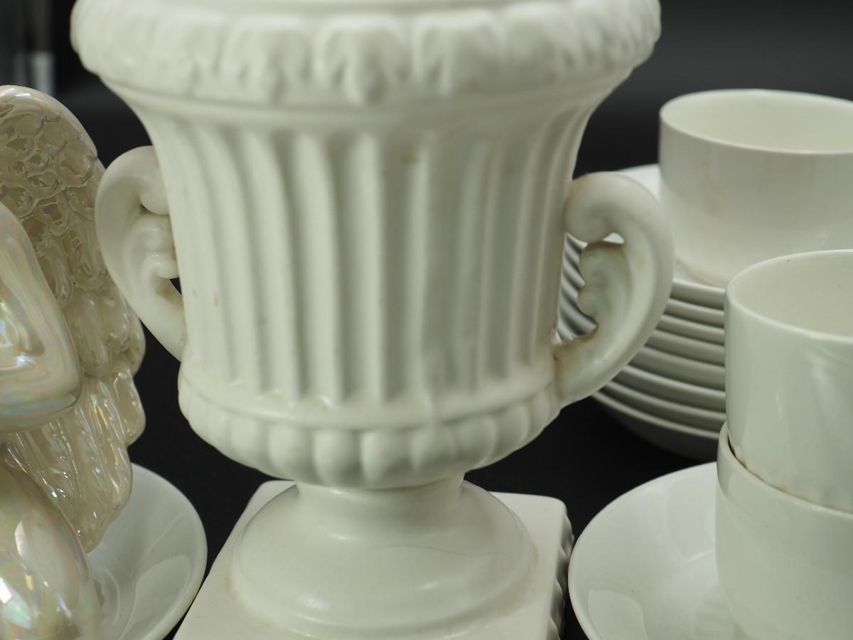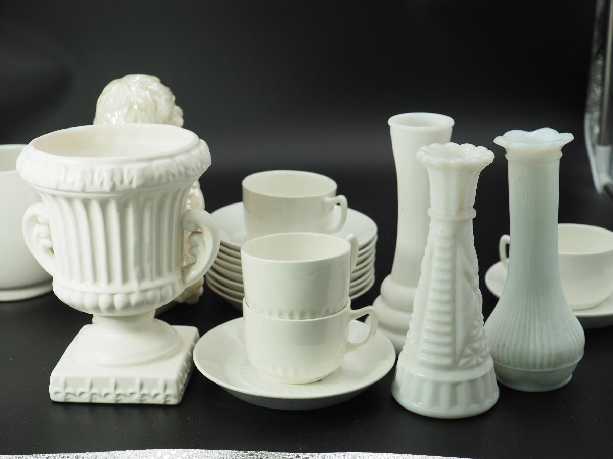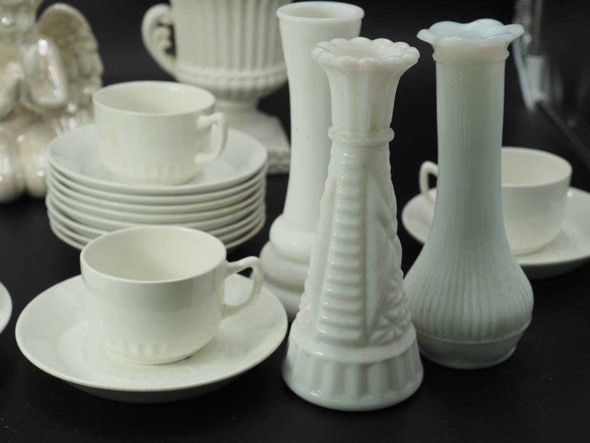 Lot 116 Milk Glass and collectibles AB glazed ceramic cherub, Milk glass vases, Velco MCM vase, English china cups and saucers.