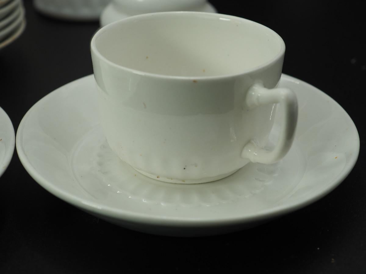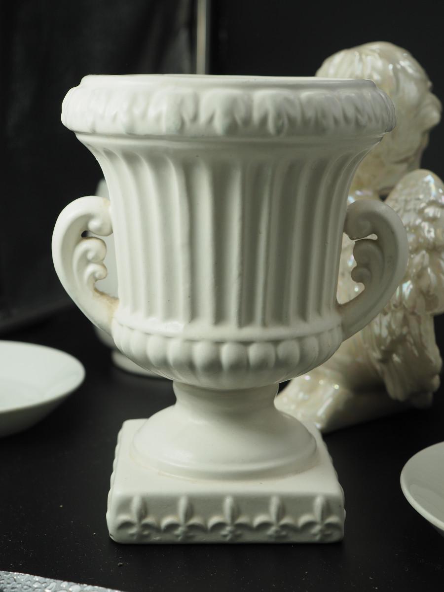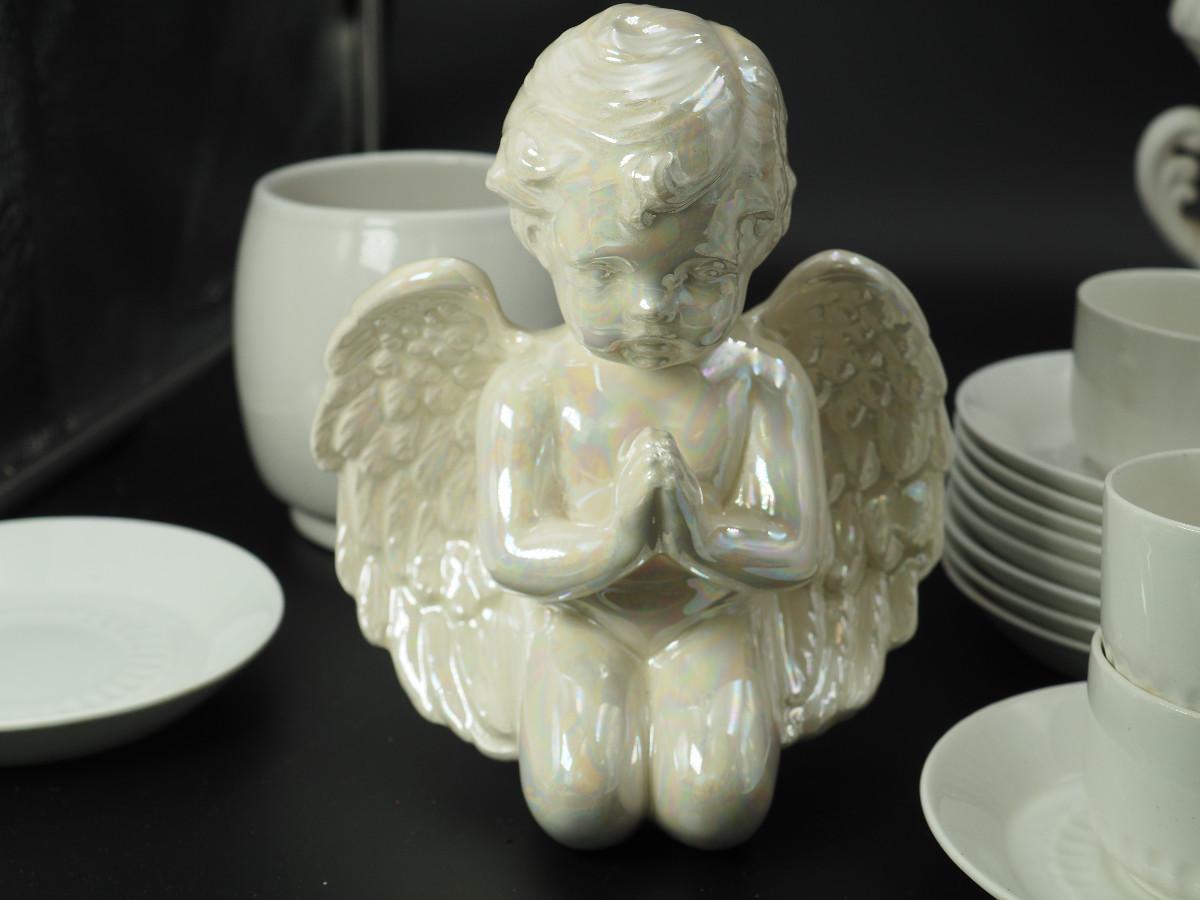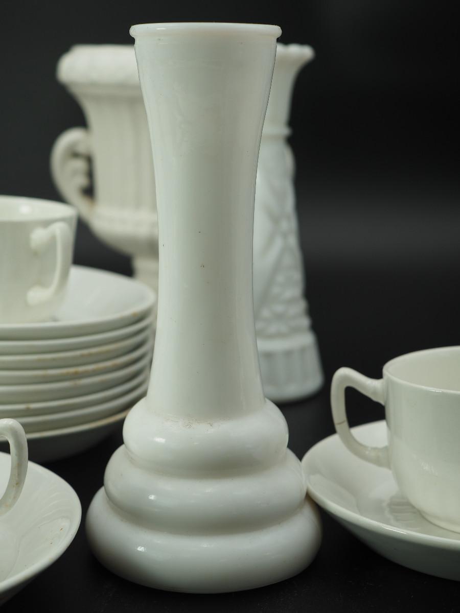 Lot 116 Milk Glass and collectibles AB glazed ceramic cherub, Milk glass vases, Velco MCM vase, English china cups and saucers.