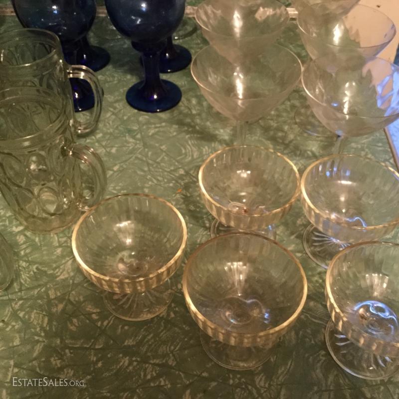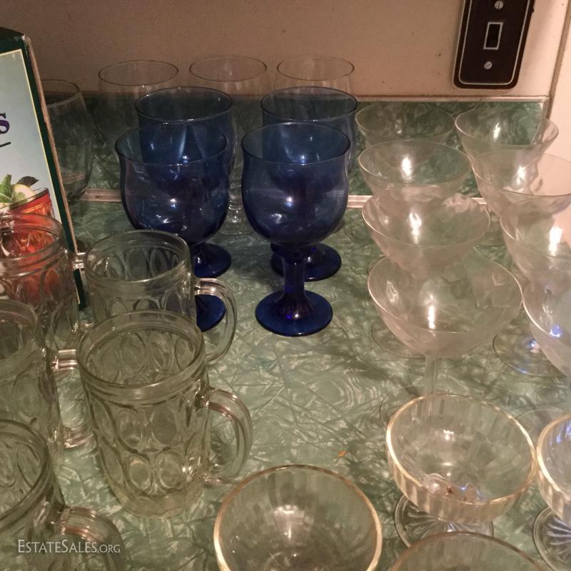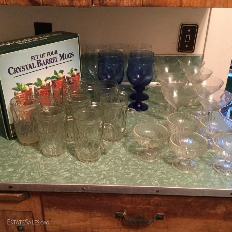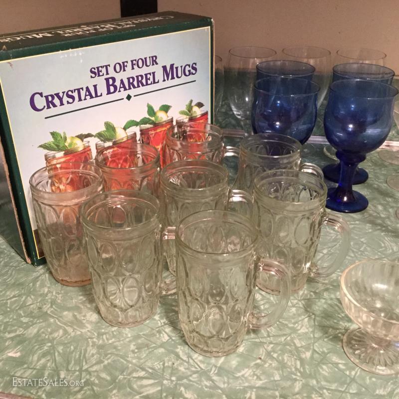 Huge lot of multiple glasses, Pudding Glasses, Blue Glass Goblets, New in Box set of Four Barrel Mugs.