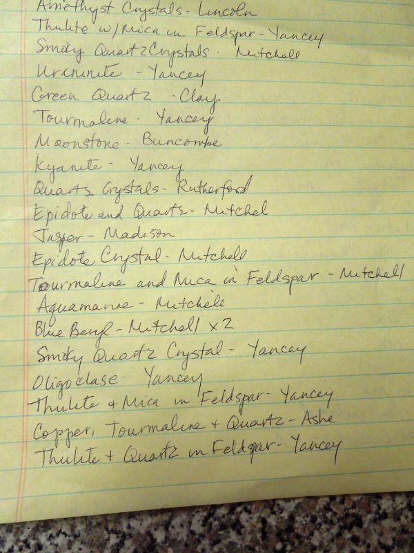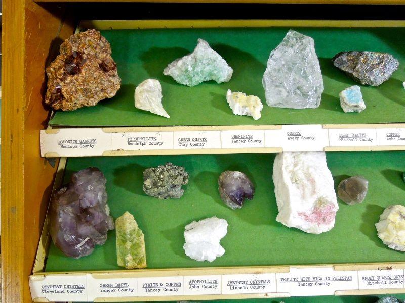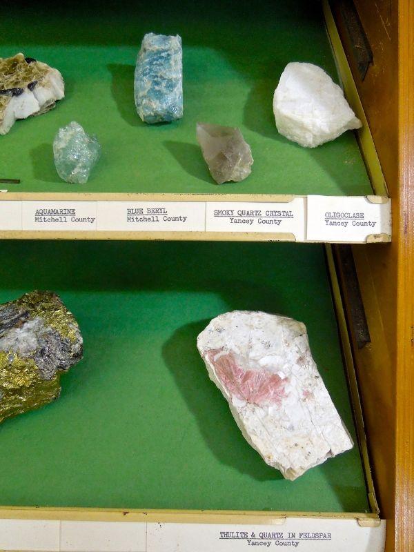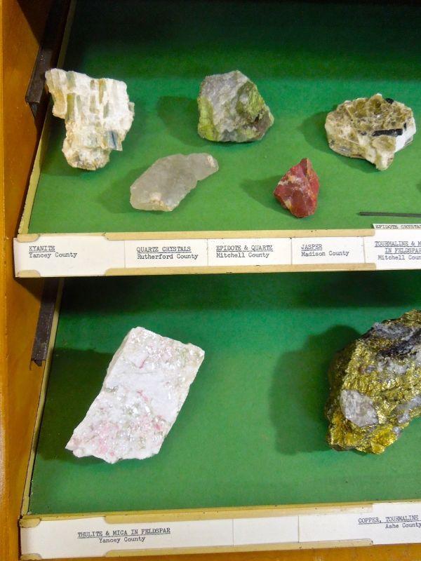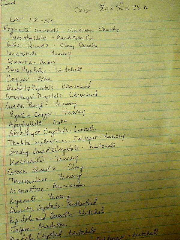 NC rough gem and mineral collection in 20"W x30" H x 25" D triangular case with removable sliding glass front panel. Approximately 32 North Carolina found gems in total. See hand written list and photos for complete listing.