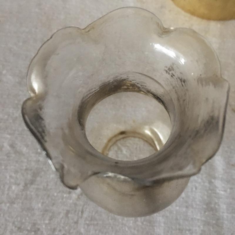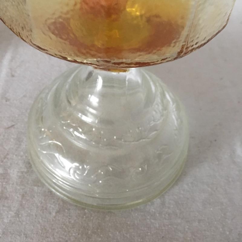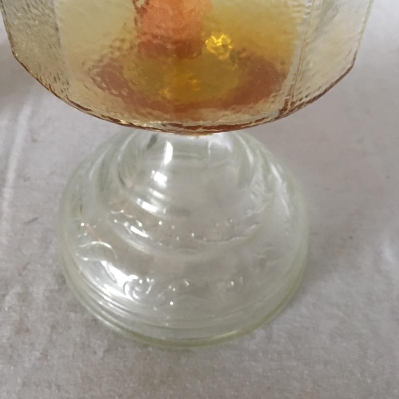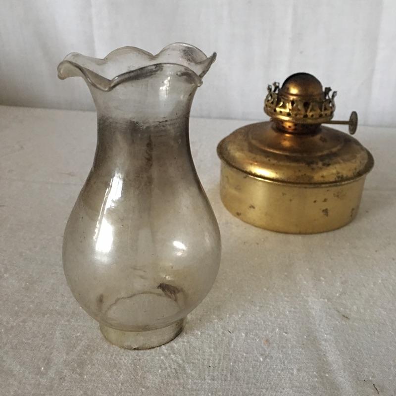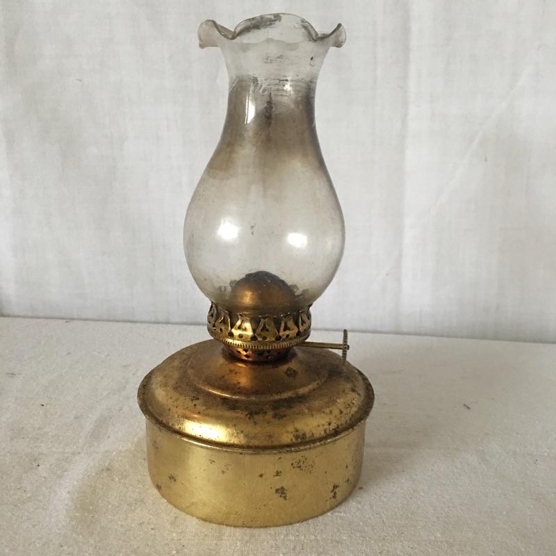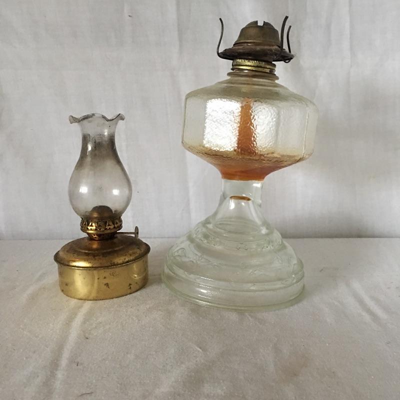 Pair of oil lamps. Glass lamp measures 11.5” tall and has a 6”D base, second lamp has brass base and glass top that has a chip, see pictures. Be ready for a power outage with this practical pair.